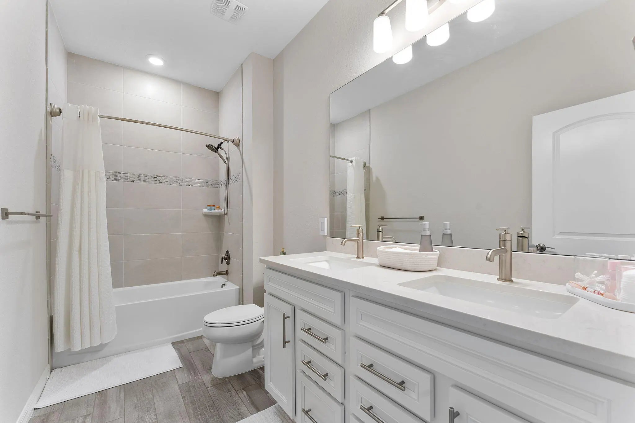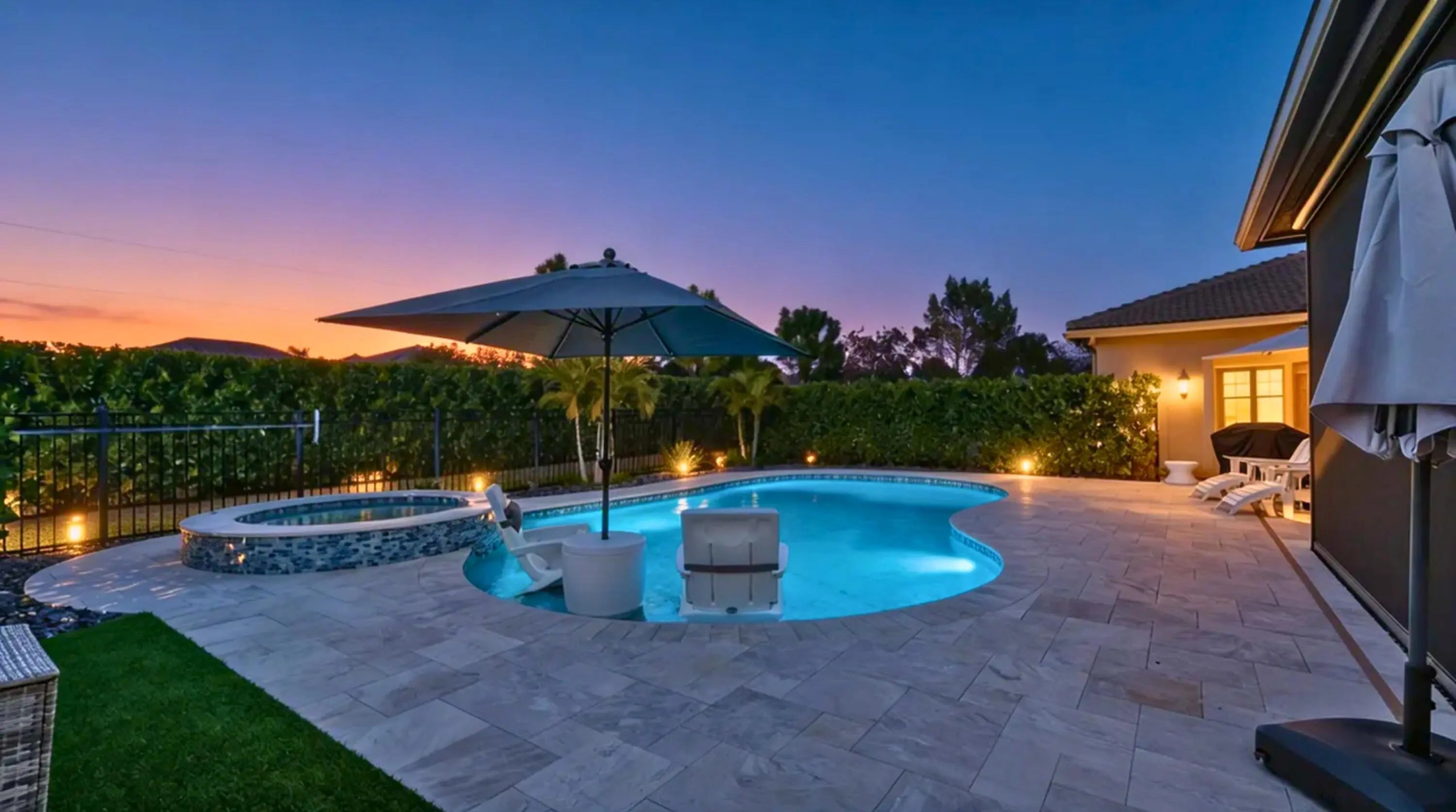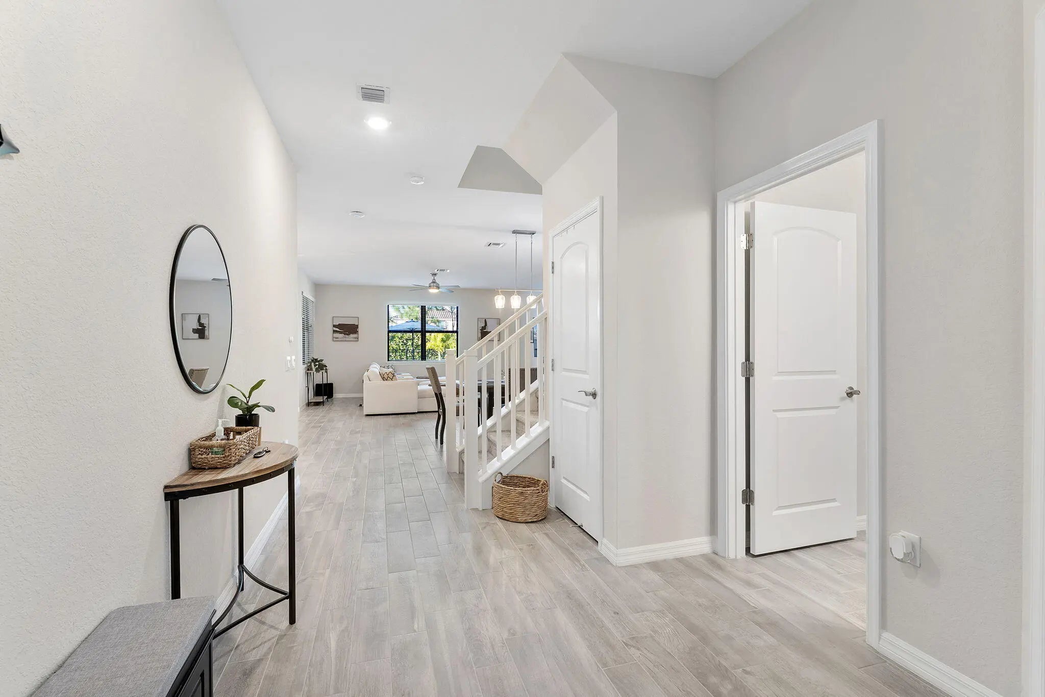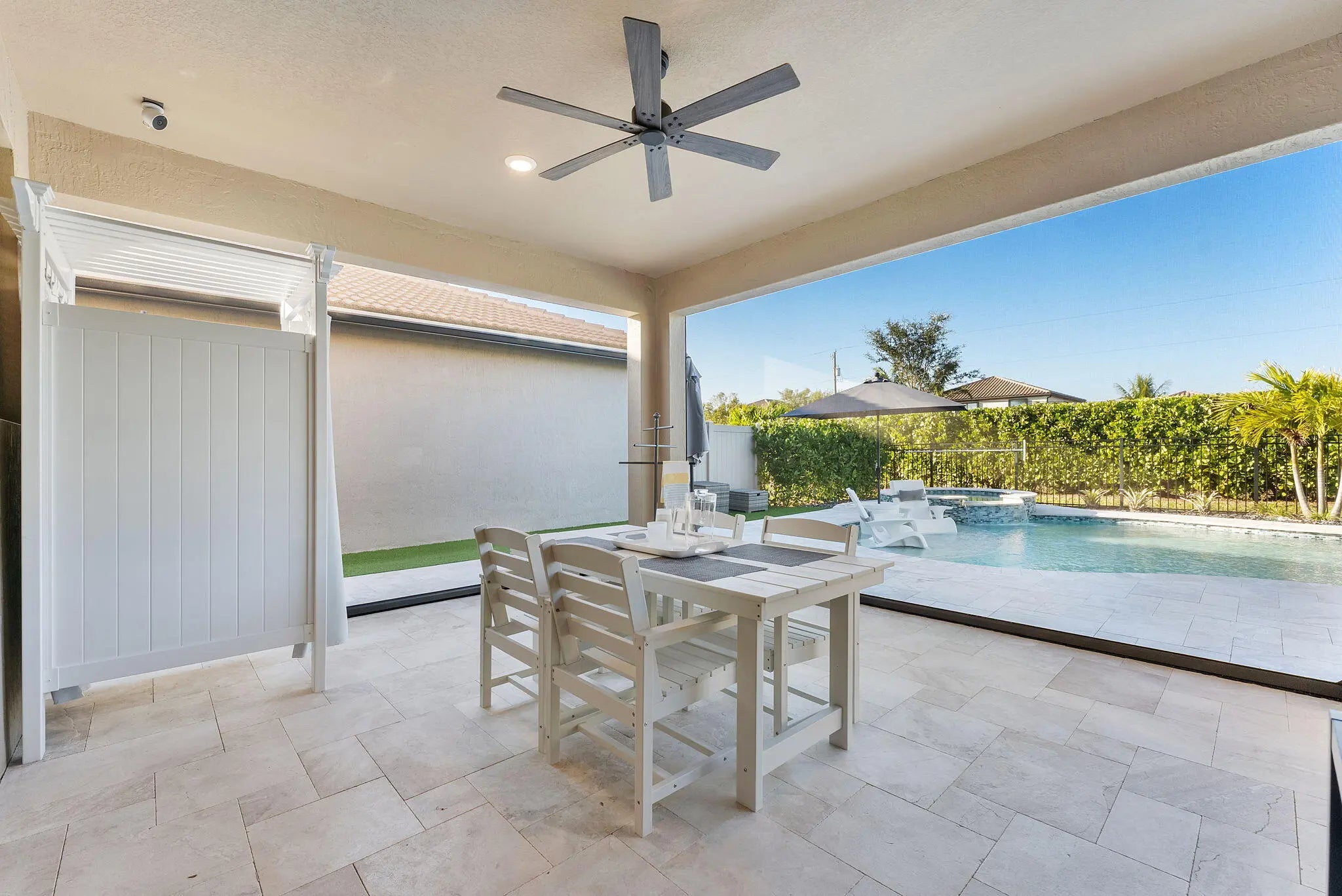 Introducing a stunning residence in the gated community of The Fields. This sought-after Fifth Avenue model by DiVosta features 3 bedrooms plus a den and loft, 2.5 baths, and a two-car garage, with an option to convert to a 4-bedroom home. Enjoy a beautifully landscaped exterior and a welcoming entry. Inside, the light-filled space showcases wood-look tile flooring and premium finishes. The outdoor area boasts a covered lanai with an electric screened enclosure, a heated saltwater pool and spa, and custom landscaping. The open-concept living area includes built-in Sonos speakers, while the stylish kitchen features a large quartz island and stainless steel appliances. The primary suite offers a luxurious spa-like bathroom. Upstairs are two additional bedrooms, a dual-sink bath, and a spacious loft. The home is fully wired for high-speed internet and includes advanced tech features. Residents enjoy two clubhouses with pools, fitness centers, and tennis courts, conveniently located near the Turnpike, airport, dining, and shopping, combining luxury and convenience.