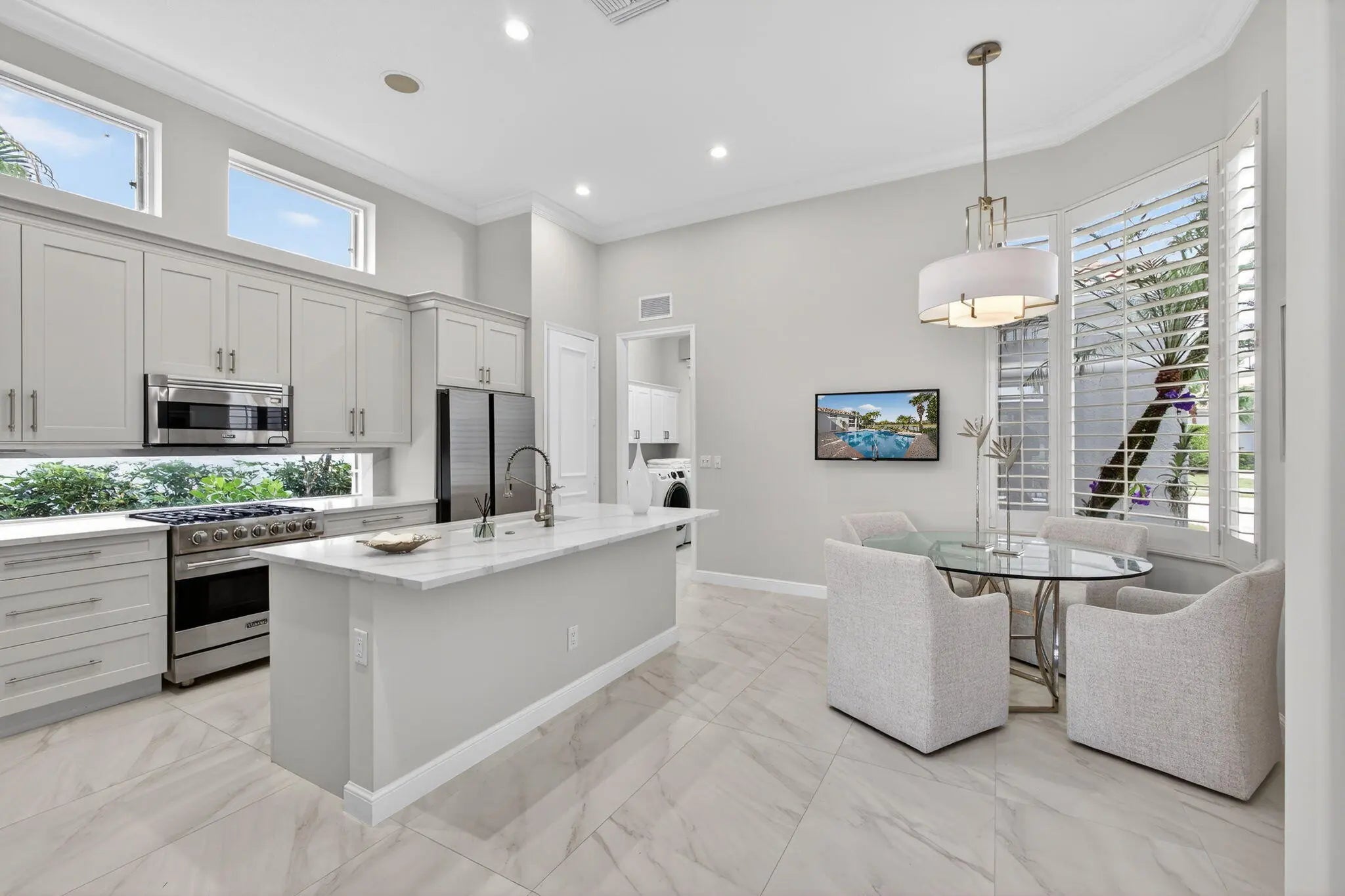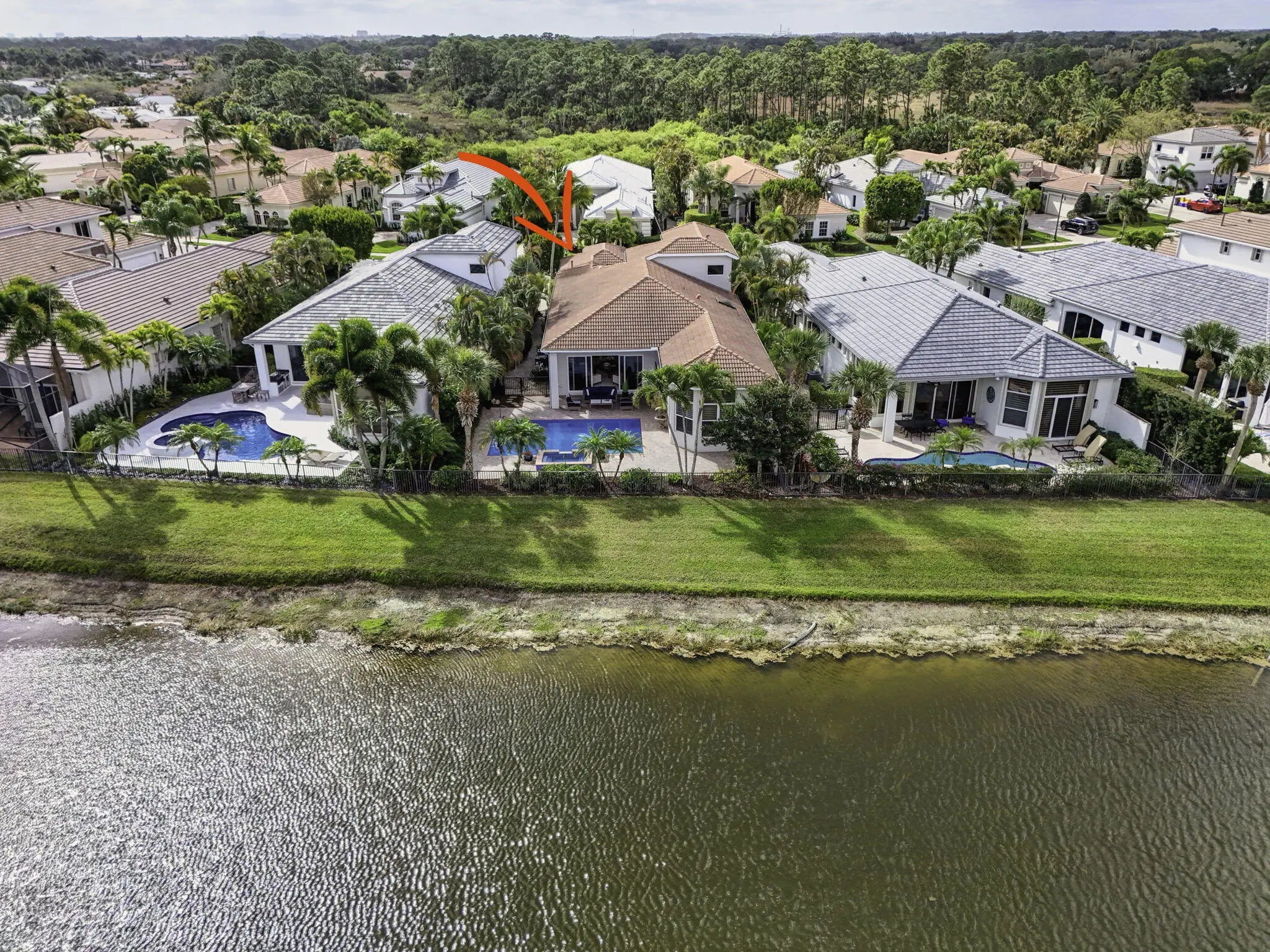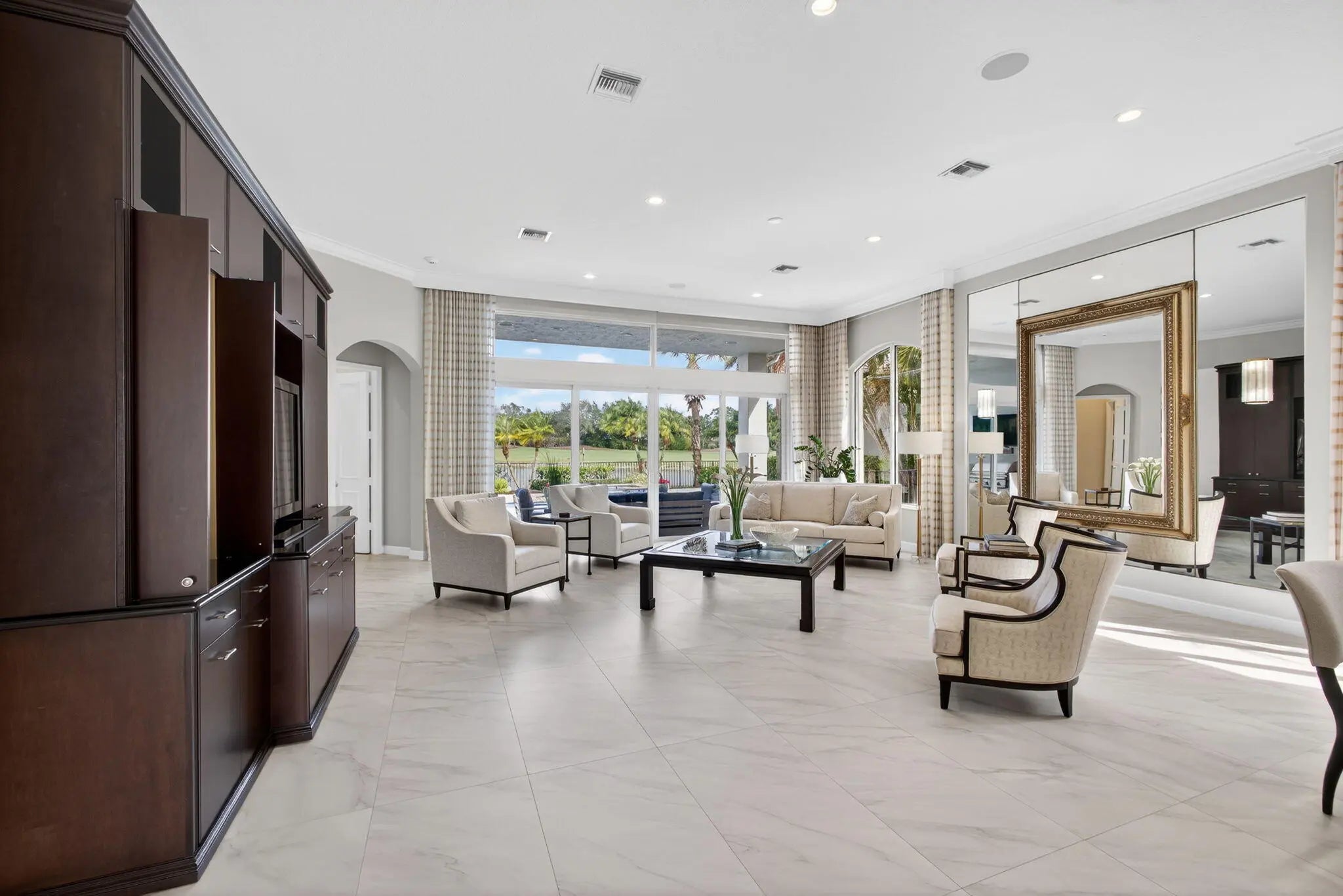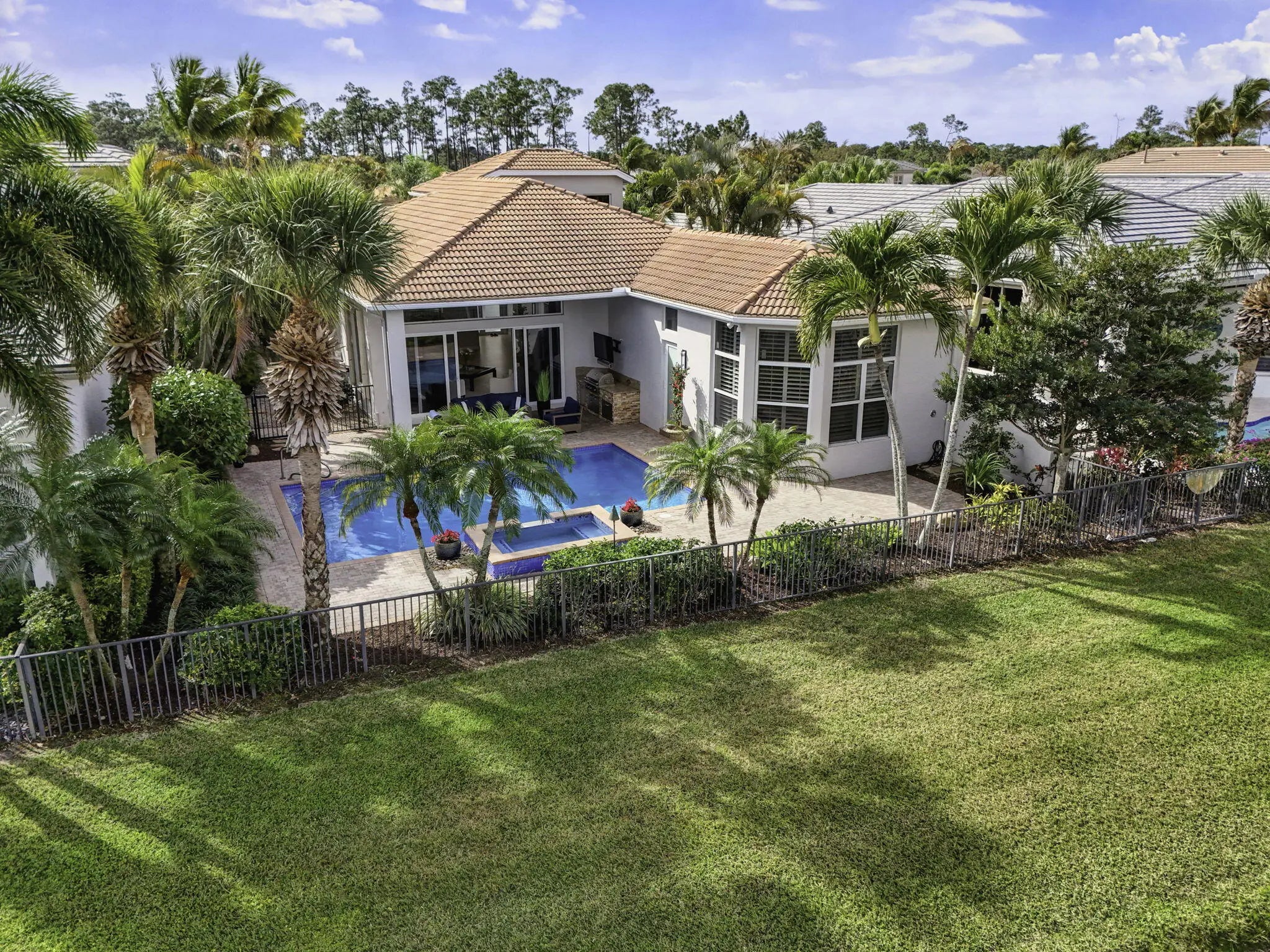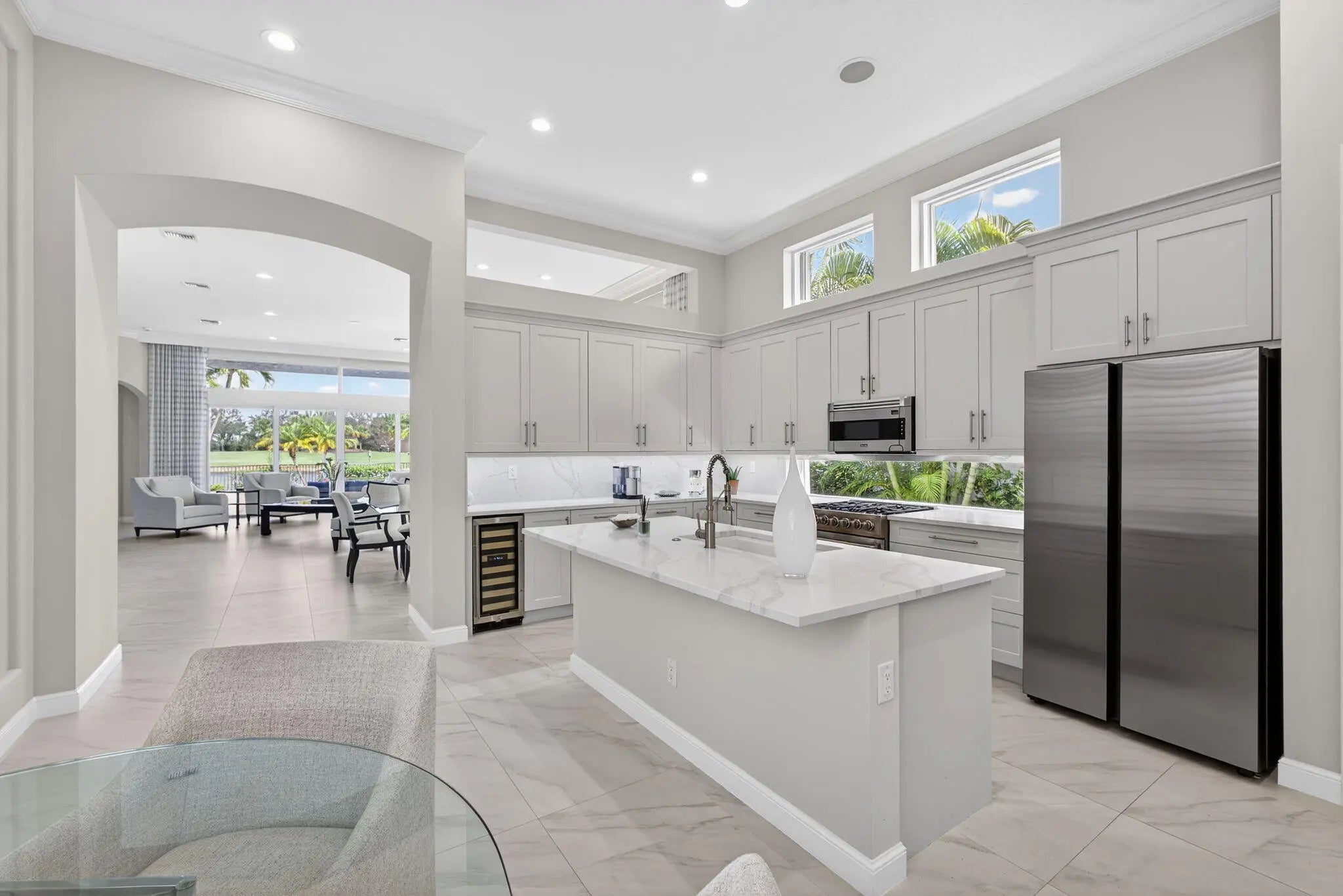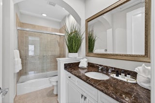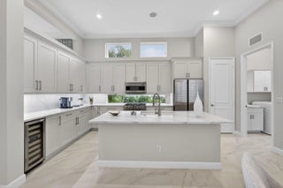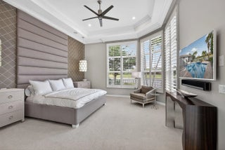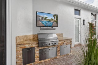 Beautifully renovated in 2025, this elegant Bardini II offers sweeping wide-water and Sunrise Fazio golf views. The popular great-room floor plan features new large-format porcelain flooring, fresh interior paint, updated lighting, new cabinetry throughout, and all-new Viking kitchen appliances including a wine refrigerator. New carpeting in primary, guest, stairway and second floor bedroom, plantation shutters, and a spa-style bath with dual vanities, soaking tub and frameless shower. All bedrooms are ensuite, including a private second-floor suite. Outdoor living is exceptional with a large pool and spa, built-in summer kitchen with TV, spacious patio and covered seating. Impact windows on front and rear, accordion shutters on sides. Sports membership. Welcome to a beautifully renovated Bardini II residence set on one of Porto Vecchio's most desirable wide-water lots, offering sweeping, 180-degree lake and Sunrise Fazio #2 fairway views. Completed in 2025, the renovation brings a clean, modern, and elegant aesthetic to this highly sought-after great-room style home. The moment you enter, you are welcomed into expansive open living spaces with soaring ceilings, contemporary lighting, and full-wall sliders framing the exceptional outdoor scenery. The interior has been refreshed throughout with new large-format porcelain flooring, fresh paint from ceiling to baseboards, updated cabinetry and hardware, and new carpeting on the staircase and in the primary suite. The designer kitchen is a showpiece, featuring all-new cabinetry, sleek countertops, and a full suite of Viking appliances, including a gas range, refrigerator, microwave, dishwasher, and a Viking wine refrigerator. Clerestory windows and a full-height landscape window bathe the space in natural light, creating a bright, inviting atmosphere. The luxurious primary suite offers elegant wall treatments, plantation shutters, tranquil views of the water and fairway, and plush new carpeting. The spa-inspired primary bath includes dual vanities with new cabinetry, a soaking tub, frameless glass shower, tall mirrors, and sophisticated finishes. All bedrooms in the home are ensuite. A beautifully appointed first-floor guest suite doubles perfectly as an office, while an additional main-level guest suite includes an updated bath and new plush carpet. The private second-floor suite provides ideal accommodations for family or long-term guests, complete with its own full bath and plantation shutters. Outdoor living is exceptional. The large pool with raised spa sits against a backdrop of wide water and sweeping golf views. A built-in outdoor kitchen with stainless grill, granite counters, and mounted TV makes entertaining effortless. The expansive paver patio and covered lanai offer multiple areas for dining, lounging, and enjoying the views. The exterior has also been refreshed with new paint, contemporary lighting, manicured tropical landscaping, a paver driveway, and impact windows on the front and rear elevations, with accordion shutters along the sides. ; Highlights " Renovated in 2025 - modern and move-in ready " Premier wide-water and golf views " Bardini II great-room style floor plan " All-new Viking kitchen appliances + Viking wine refrigerator " New cabinetry in kitchen, baths, and laundry room " New porcelain flooring throughout the main level " New carpeting in the staircase and primary suite " Spa-inspired primary bath with soaking tub & frameless shower " All bedrooms are ensuite (including a private upstairs suite) " Outdoor kitchen with grill, storage & TV " Large pool with raised spa and expansive patio " Impact windows (front & rear) + accordion shutters on sides " Freshly painted interior and exterior, new lighting, updated garage