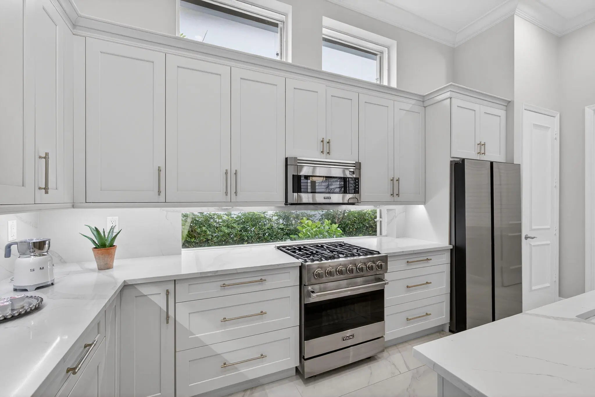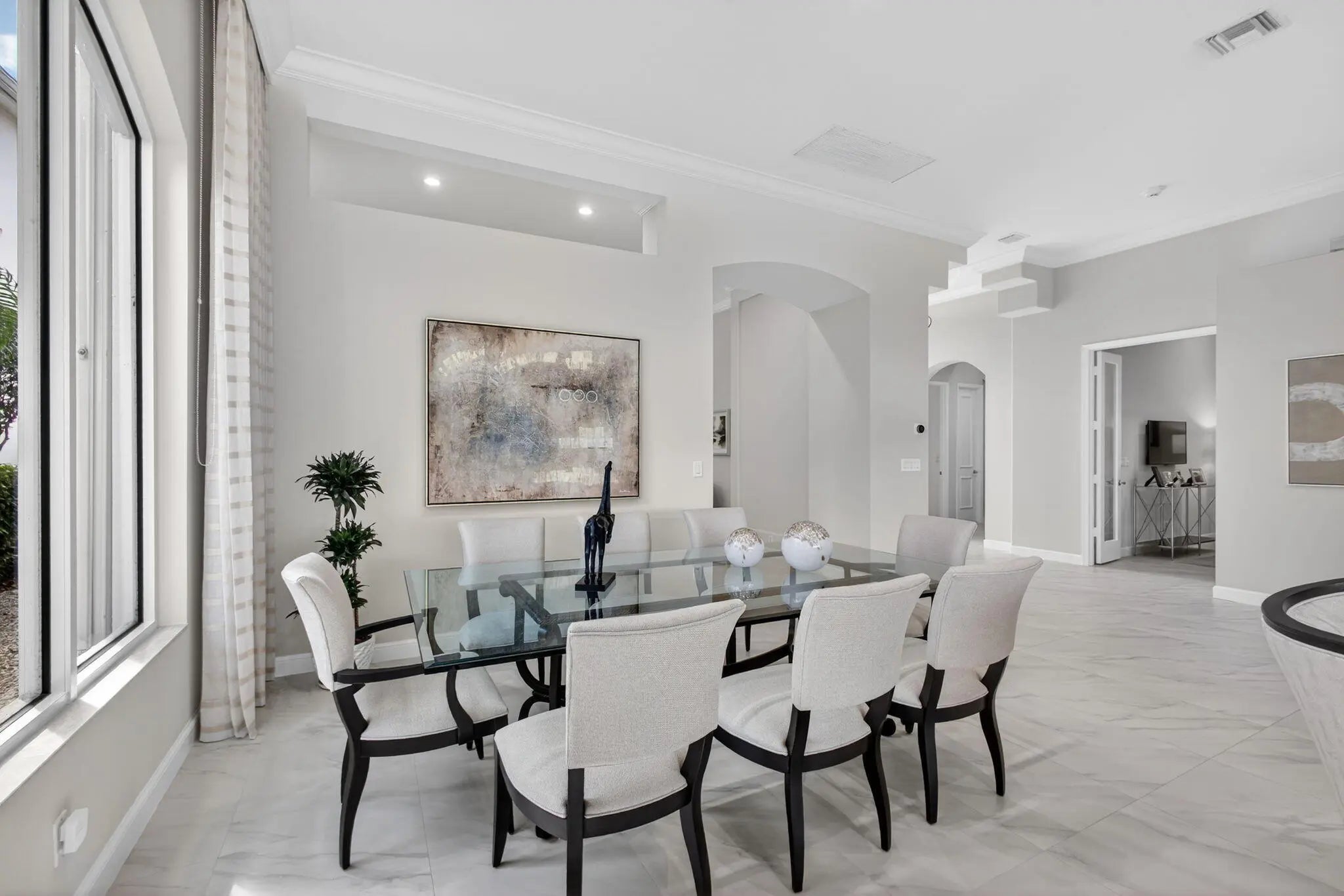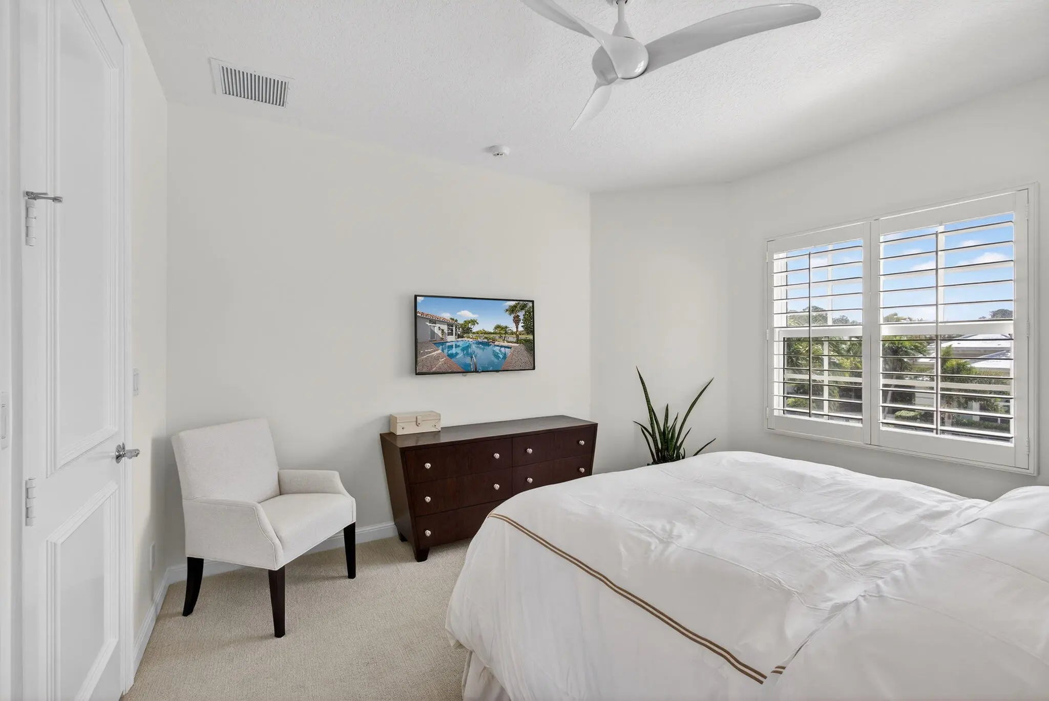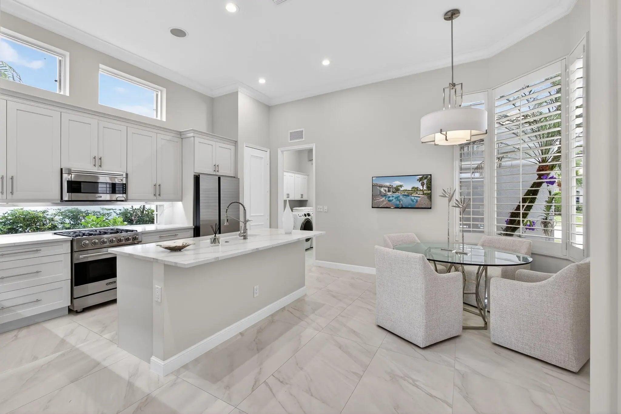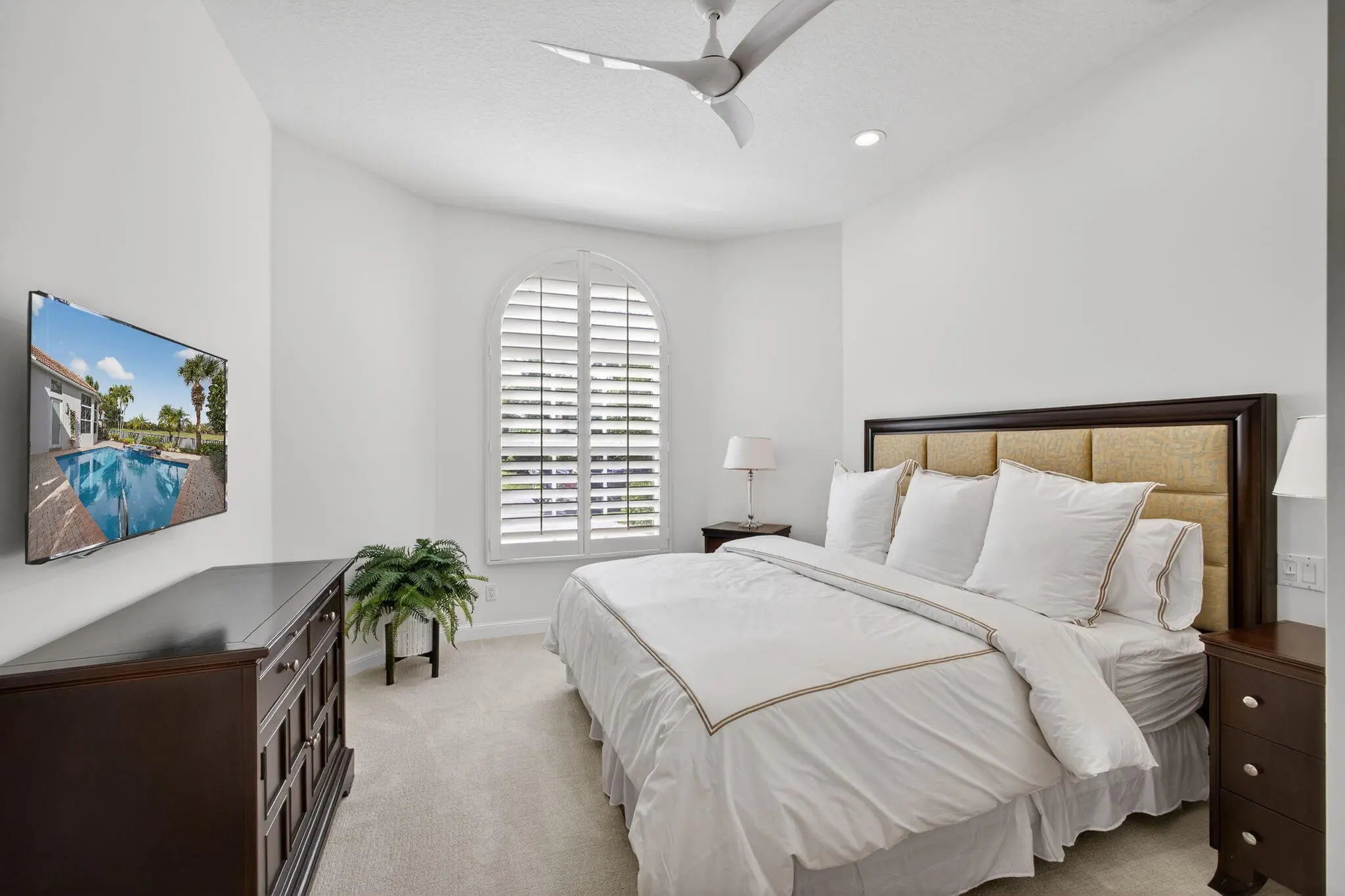 Beautifully renovated in 2025, this elegant Bardini II offers sweeping wide-water and Sunrise Fazio golf views. The popular great-room floor plan features new large-format porcelain flooring, fresh interior paint, updated lighting, new cabinetry throughout, and all-new Viking kitchen appliances including a wine refrigerator. New carpeting in primary, guest, stairway and second floor bedroom, plantation shutters, and a spa-style bath with dual vanities, soaking tub and frameless shower. All bedrooms are ensuite, including a private second-floor suite. Outdoor living is exceptional with a large pool and spa, built-in summer kitchen with TV, spacious patio and covered seating. Impact windows on front and rear, accordion shutters on sides. Sports membership. Welcome to a beautifully renovated Bardini II residence set on one of Porto Vecchio's most desirable wide-water lots, offering sweeping, 180-degree lake and Sunrise Fazio #2 fairway views. Completed in 2025, the renovation brings a clean, modern, and elegant aesthetic to this highly sought-after great-room style home. The moment you enter, you are welcomed into expansive open living spaces with soaring ceilings, contemporary lighting, and full-wall sliders framing the exceptional outdoor scenery. The interior has been refreshed throughout with new large-format porcelain flooring, fresh paint from ceiling to baseboards, updated cabinetry and hardware, and new carpeting on the staircase and in the primary suite. The designer kitchen is a showpiece, featuring all-new cabinetry, sleek countertops, and a full suite of Viking appliances, including a gas range, refrigerator, microwave, dishwasher, and a Viking wine refrigerator. Clerestory windows and a full-height landscape window bathe the space in natural light, creating a bright, inviting atmosphere. The luxurious primary suite offers elegant wall treatments, plantation shutters, tranquil views of the water and fairway, and plush new carpeting. The spa-inspired primary bath includes dual vanities with new cabinetry, a soaking tub, frameless glass shower, tall mirrors, and sophisticated finishes. All bedrooms in the home are ensuite. A beautifully appointed first-floor guest suite doubles perfectly as an office, while an additional main-level guest suite includes an updated bath and new plush carpet. The private second-floor suite provides ideal accommodations for family or long-term guests, complete with its own full bath and plantation shutters. Outdoor living is exceptional. The large pool with raised spa sits against a backdrop of wide water and sweeping golf views. A built-in outdoor kitchen with stainless grill, granite counters, and mounted TV makes entertaining effortless. The expansive paver patio and covered lanai offer multiple areas for dining, lounging, and enjoying the views. The exterior has also been refreshed with new paint, contemporary lighting, manicured tropical landscaping, a paver driveway, and impact windows on the front and rear elevations, with accordion shutters along the sides. ; Highlights " Renovated in 2025 - modern and move-in ready " Premier wide-water and golf views " Bardini II great-room style floor plan " All-new Viking kitchen appliances + Viking wine refrigerator " New cabinetry in kitchen, baths, and laundry room " New porcelain flooring throughout the main level " New carpeting in the staircase and primary suite " Spa-inspired primary bath with soaking tub & frameless shower " All bedrooms are ensuite (including a private upstairs suite) " Outdoor kitchen with grill, storage & TV " Large pool with raised spa and expansive patio " Impact windows (front & rear) + accordion shutters on sides " Freshly painted interior and exterior, new lighting, updated garage
