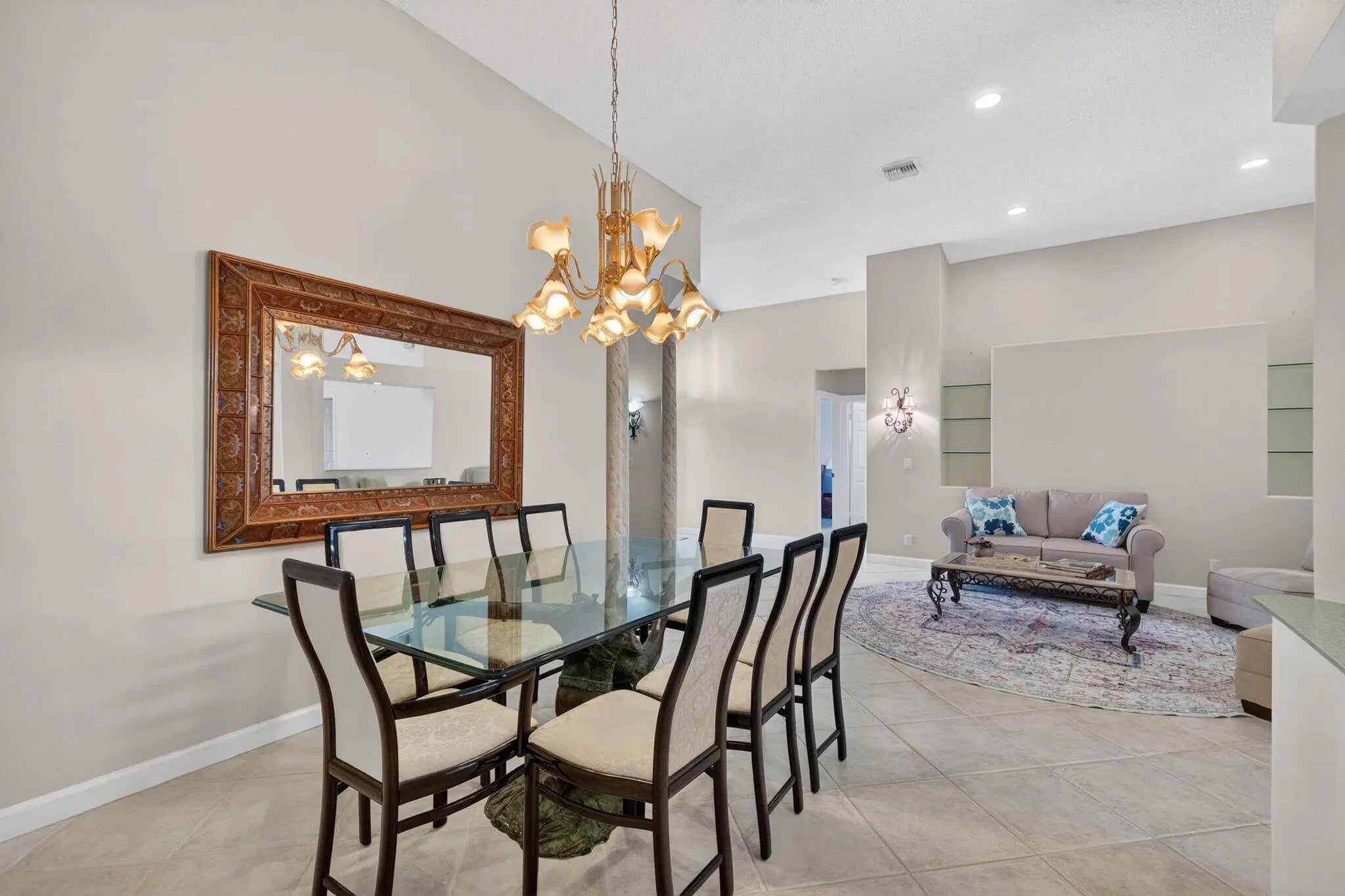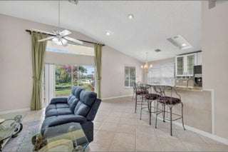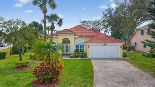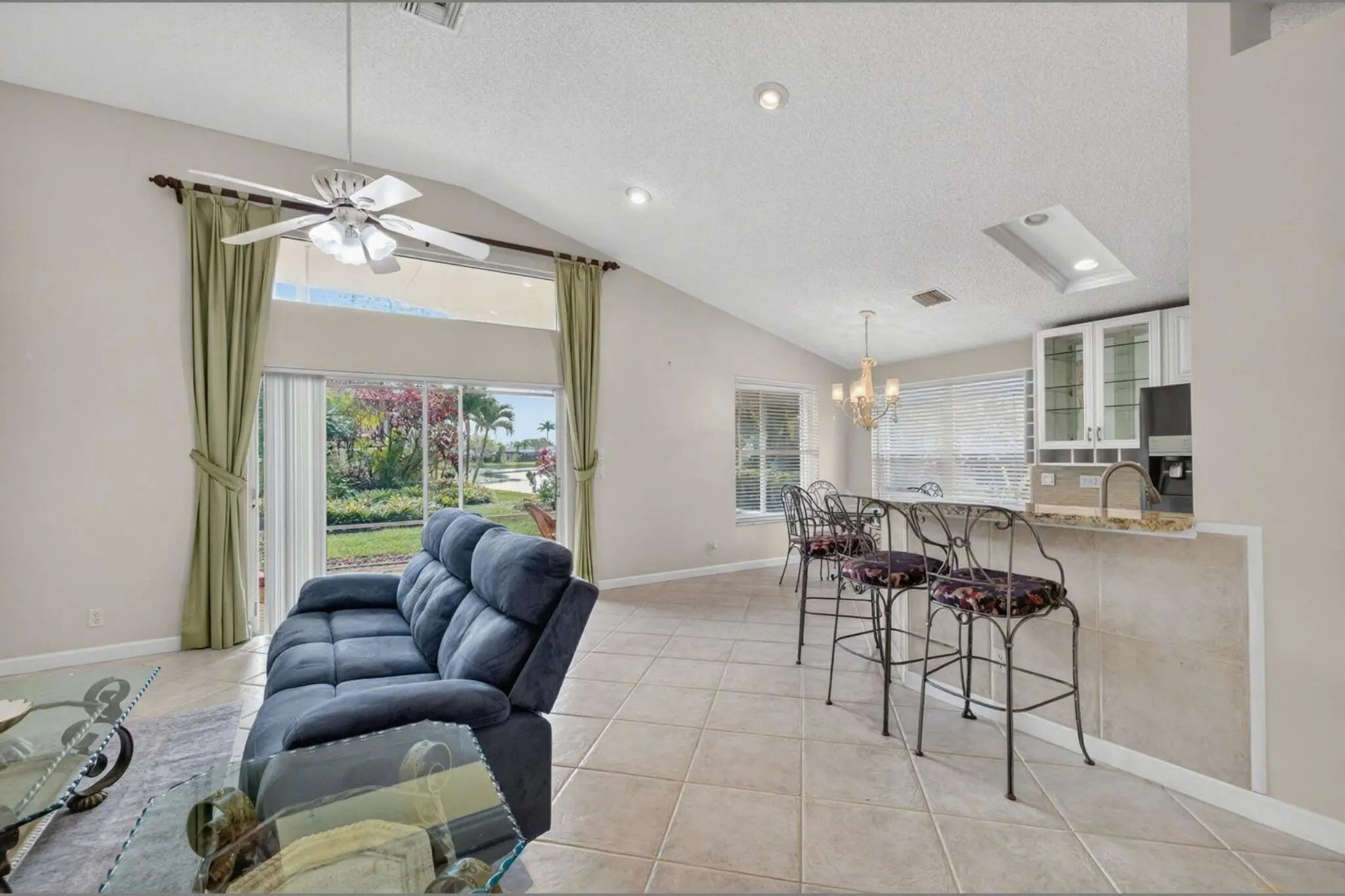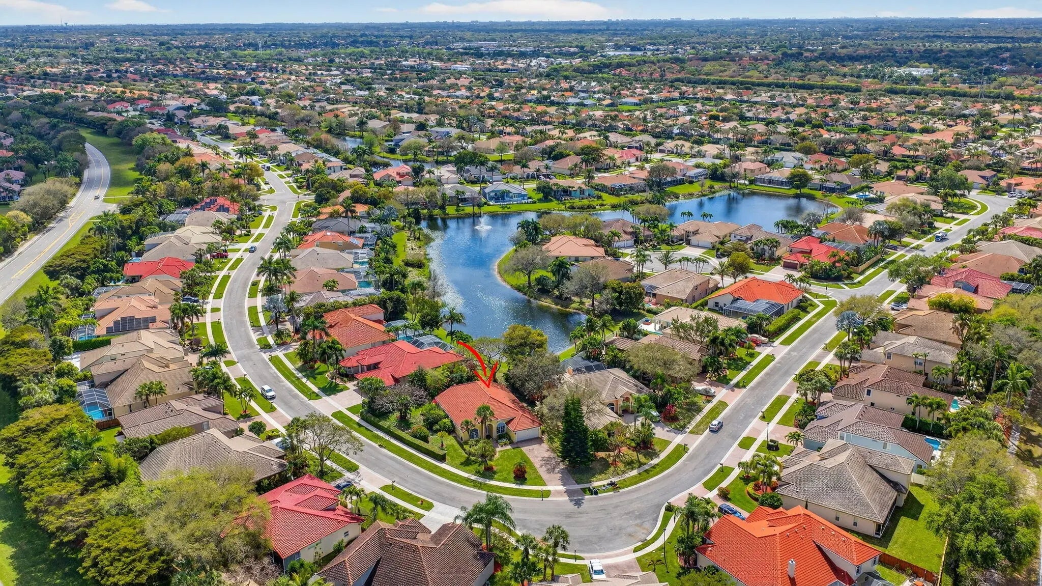 This lake-view home is in an all-ages, gated community on a large waterfront lot. Its almost 3,000 sq.ft. is made even more grand by its vaulted ceilings. There are 3 bedrooms, family room, living room, dining area, kitchen eat-in area, PLUS a flex space that can be used as a den or enclosed as an extra bedroom. The kitchen has granite, breakfast bar, counter lights & pantry. The main bedroom has a walk-in and double-wide closets, and a bathroom with a shower, separate tub and private WC. The screened, covered patio has views of the garden, pond, and a long view of the lake & fountain. The 2022 roof, accordion shutters & impact windows protect this spacious home. The garage has epoxy floors & EV charger. No mandatory country club fees. Joining Aberdeen GOLF & Country Club is optional.