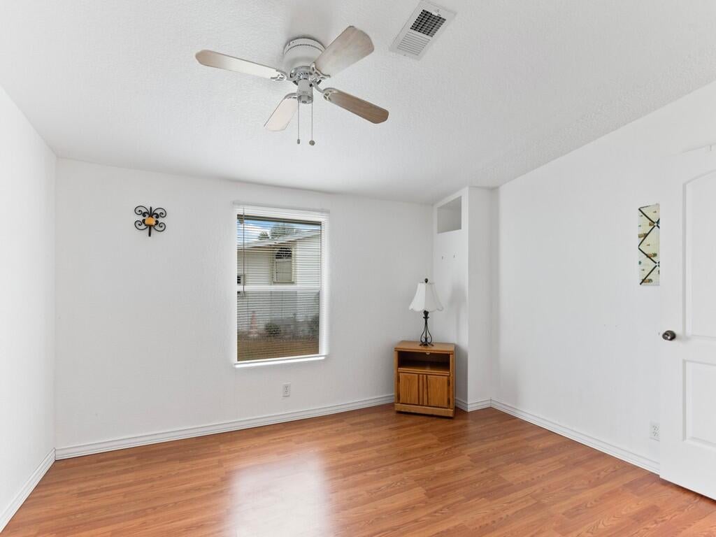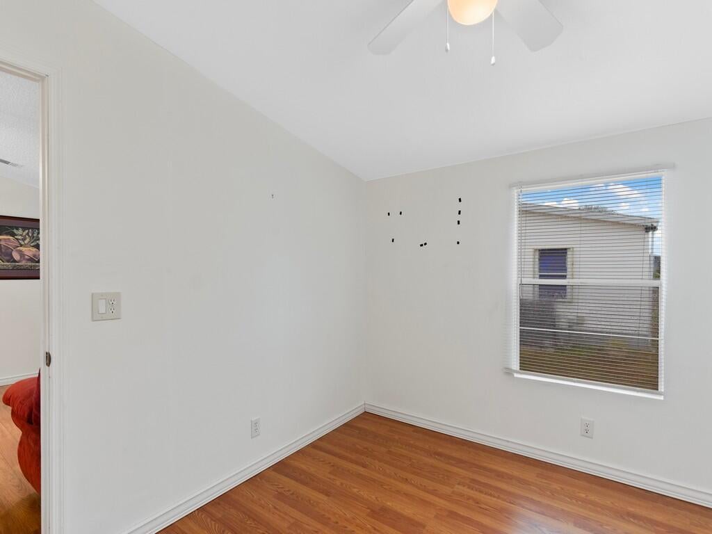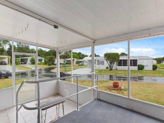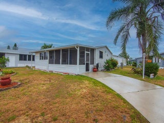 Lovely mobile home in a 55+ community. TURN KEY! This home is located in a quiet and peaceful neighborhood. The home features 1 bedroom plus den/office, could easily be a second bedroom, cozy living room that opens up to the dining area. Huge kitchen with lots of cabinet space. Spacious bedroom with large Walk-in closet and full bathroom. Screened patio, private storage, newer roof and newer AC. Shutters and much more. Buyer to verify measurements