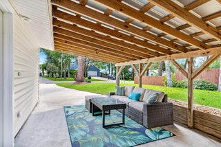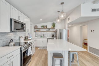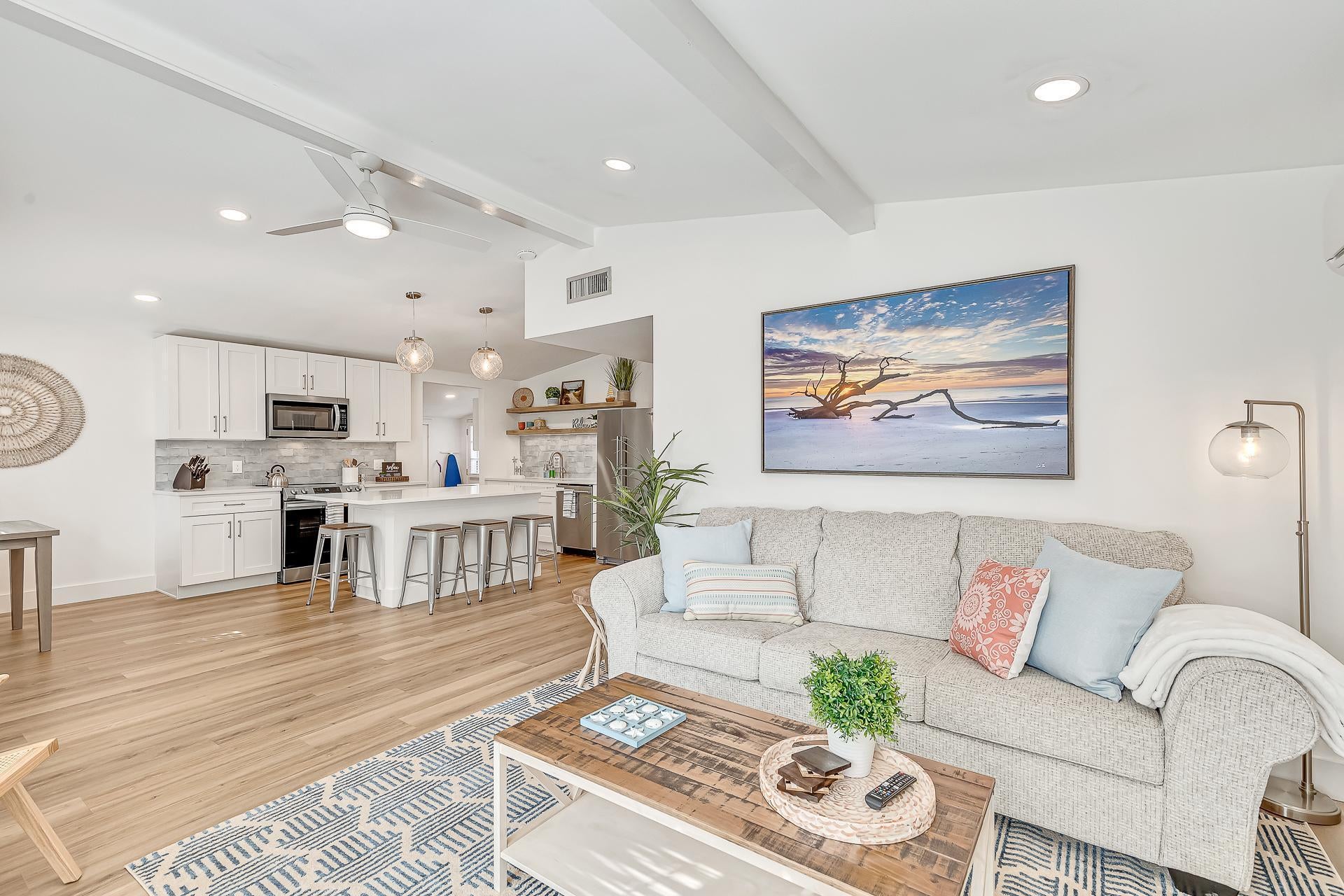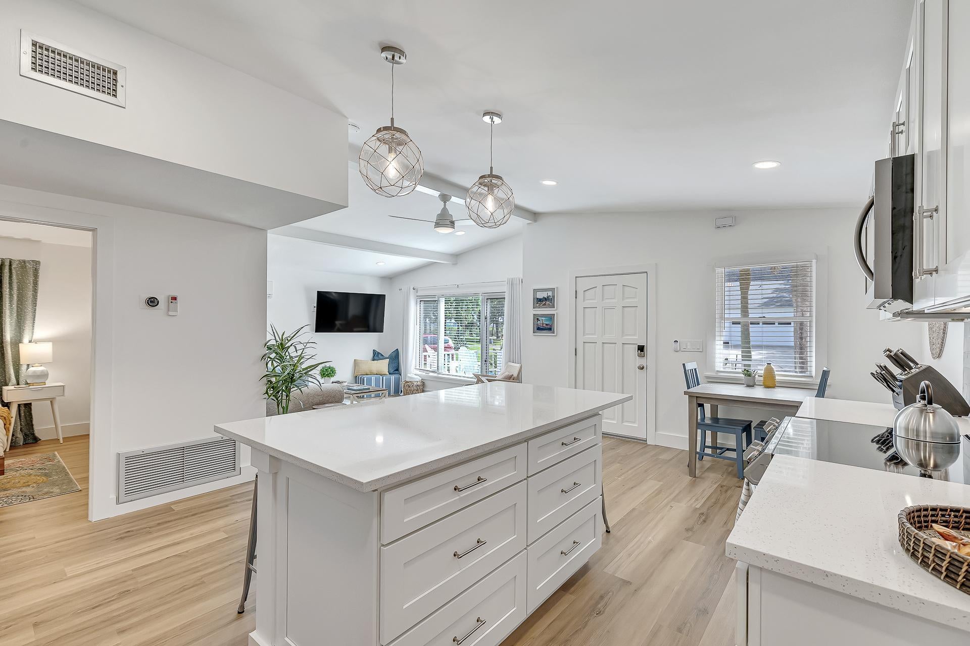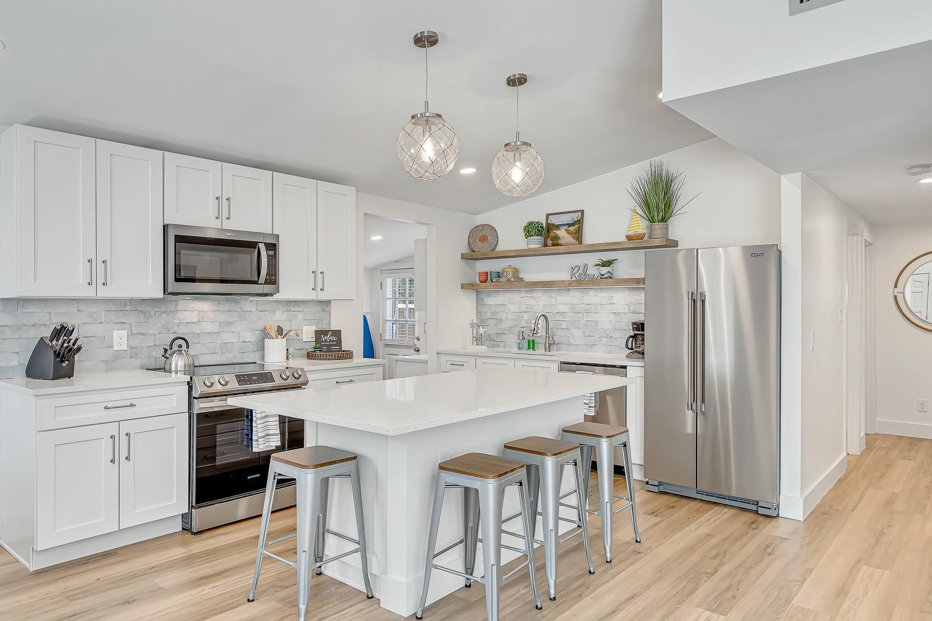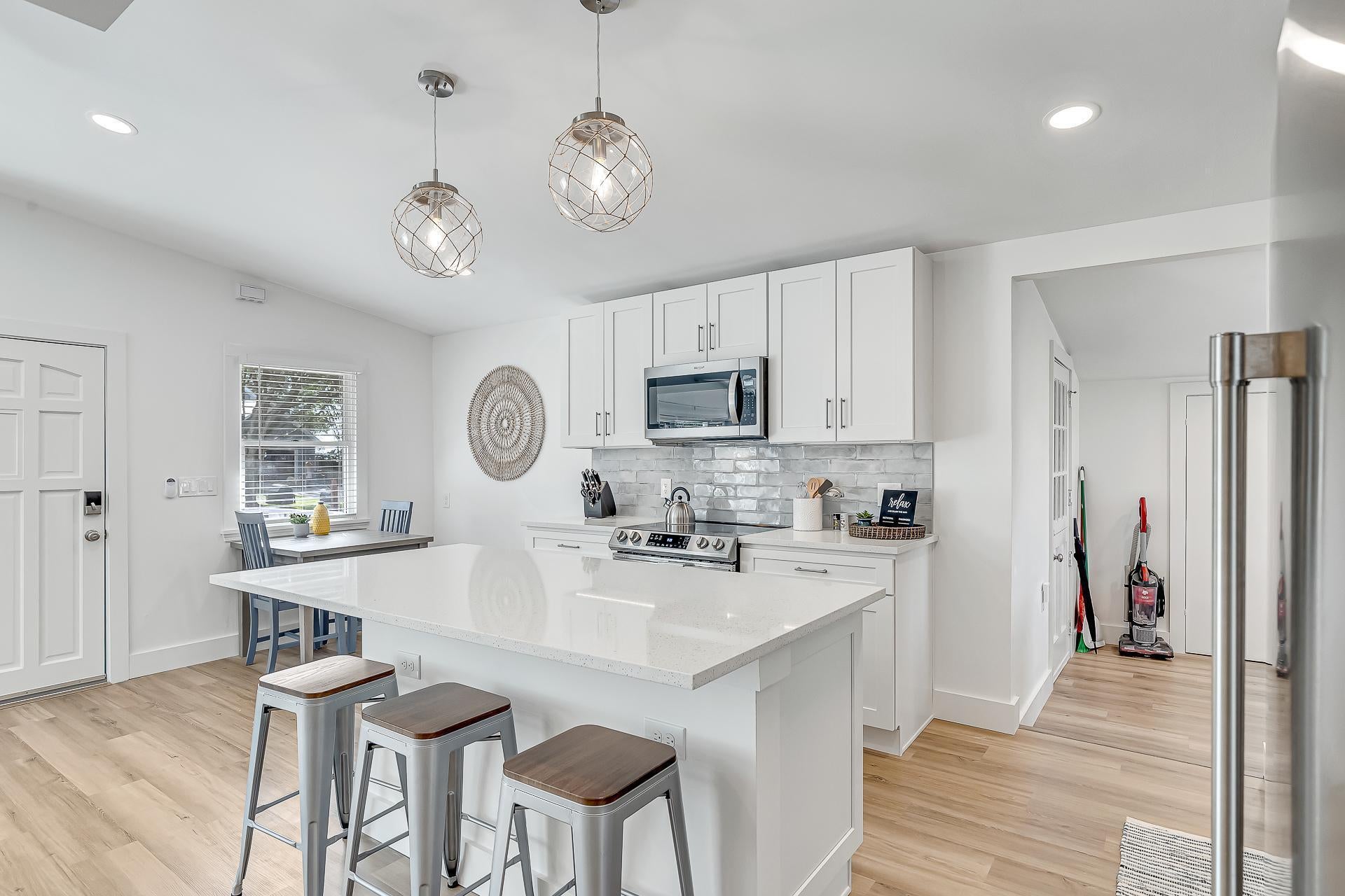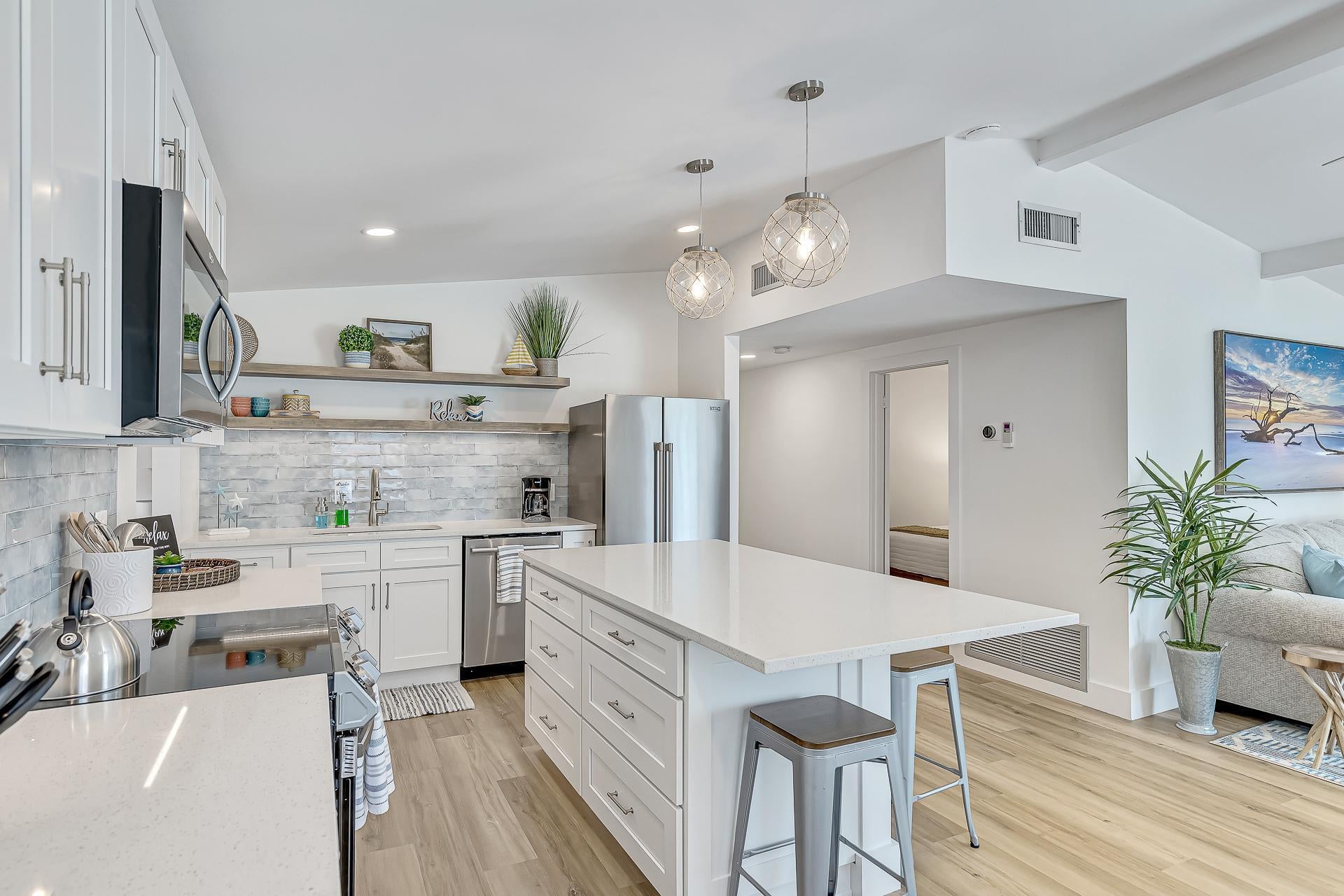 Discover this beautifully renovated 3 bed/ 2 bath home in St Augustine. Located 2 houses off Shore Drive- a million dollar location with an affordable price tag. Every room remodeled with Home & Garden-like features. Custom kitchen includes soft-close shaker cabinets, quartz counters with tile backsplash, floating shelves, & large island with gorgeous pendant lighting. Open floorplan includes casual dining area, family room full of natural light from the large window overlooking the spacious front porch with stunning views of the Matanzas River & 312 Bridge. Main bedroom has newly updated bathroom with subway tiled shower & niche. Other 2 bedrooms share 2nd renovated bathroom. New premium vinyl flooring throughout main areas and bedrooms. Fully fenced backyard set up for outdoor living.Large deck and patio, cozy fire pit area and jungle gym for kids. Add in the 1-car garage, carport that makes for nice outdoor covered seating area, new energy efficient water heater, A/C with UV filtration to keep the air fresh, & optional furniture package and you've struck gold. Close to restaurants, shops, boat ramps with river & ocean access & a nature preserve with walking trails. Perfect property for year round living, short-term vacation rental or vacation home.