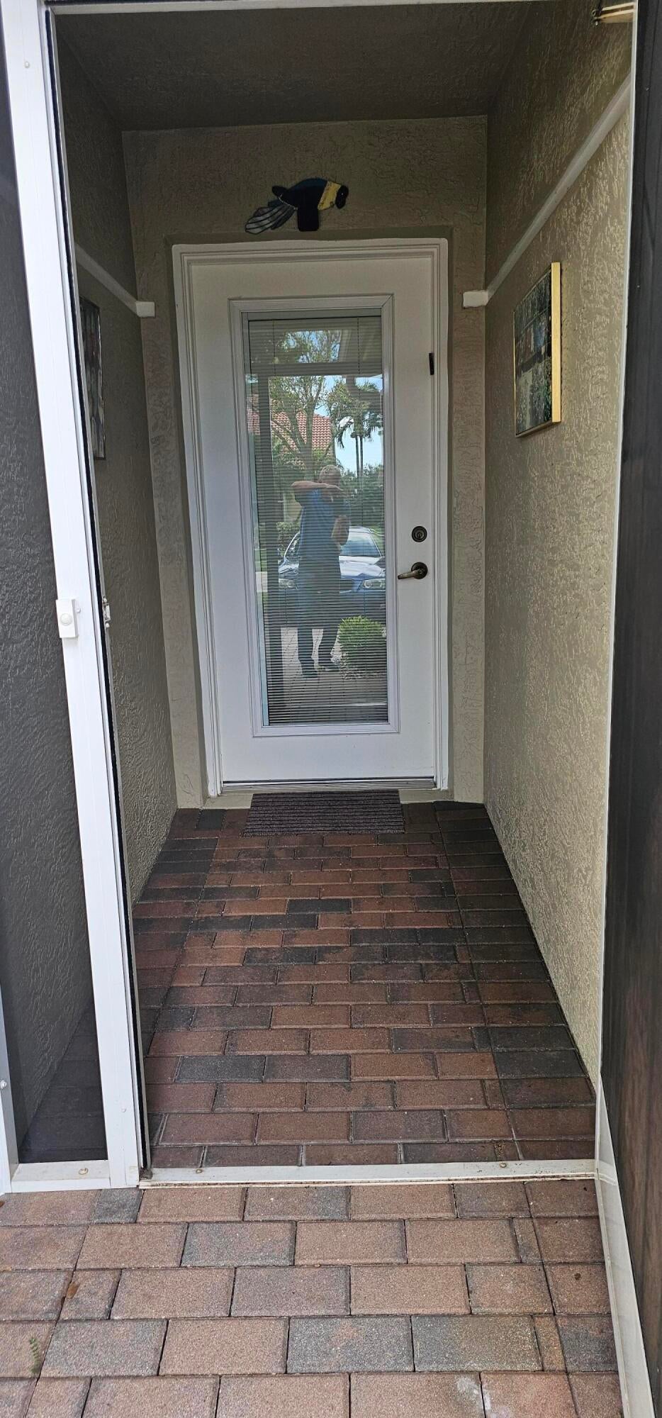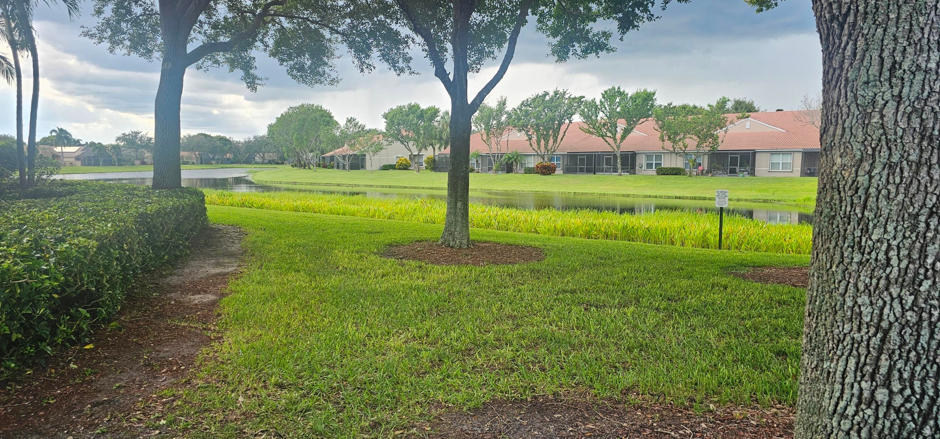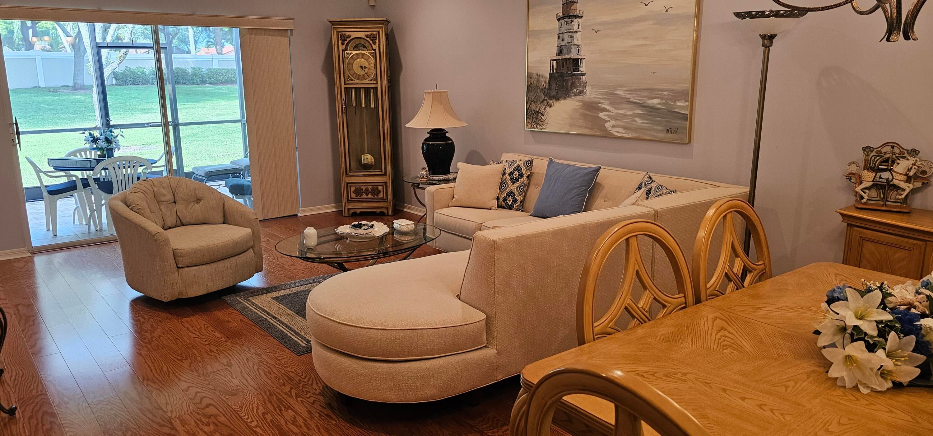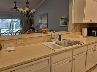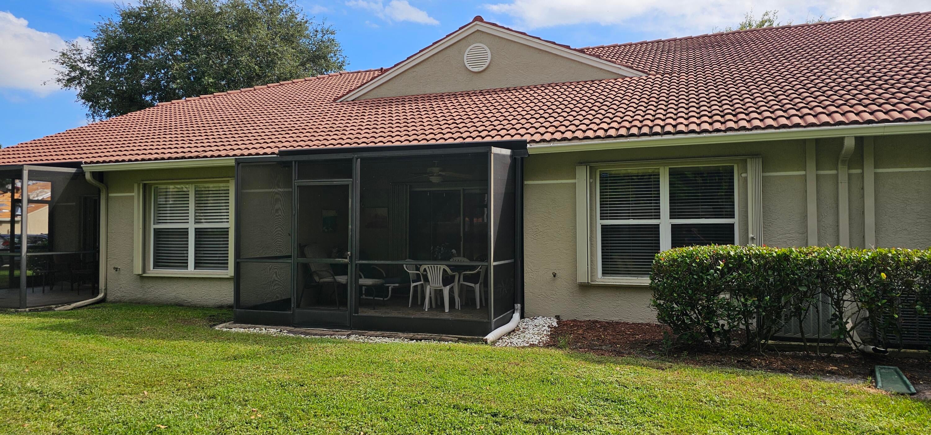 Well kept 3/2 Villa with updates. 3rd bedroom is set up as an office. Nice view from the enclosed patio/lanai with a waterproof vinyl screen roof and a neighbor's privacy screen. The windows have a protective coating. The roof was recently inspected and is in excellent condition. The front door has a built-in adjustable mini blind for light or dark. There is an under sink water filter inside the sink base cabinet. Water detectors under each water valve. Ceiling fans in each room. The large driveway can accommodate up to 4 cars. There is a security camera in the front entry. Note: The air conditioner system will be replaced by the Seller prior to closing.A very caring, 55+ community that is Pet Friendly and Gated with a fantastic Clubhouse with many amenities. >680 credit per HOA.