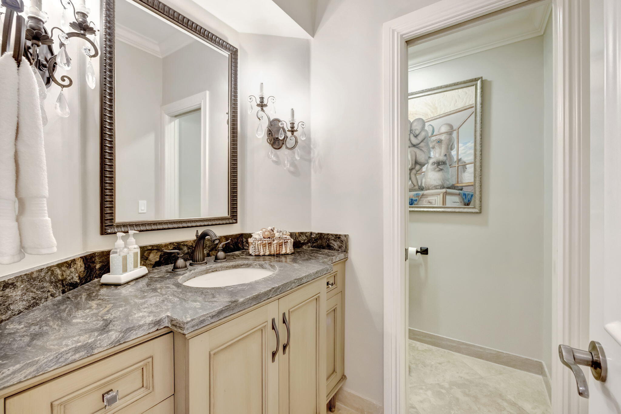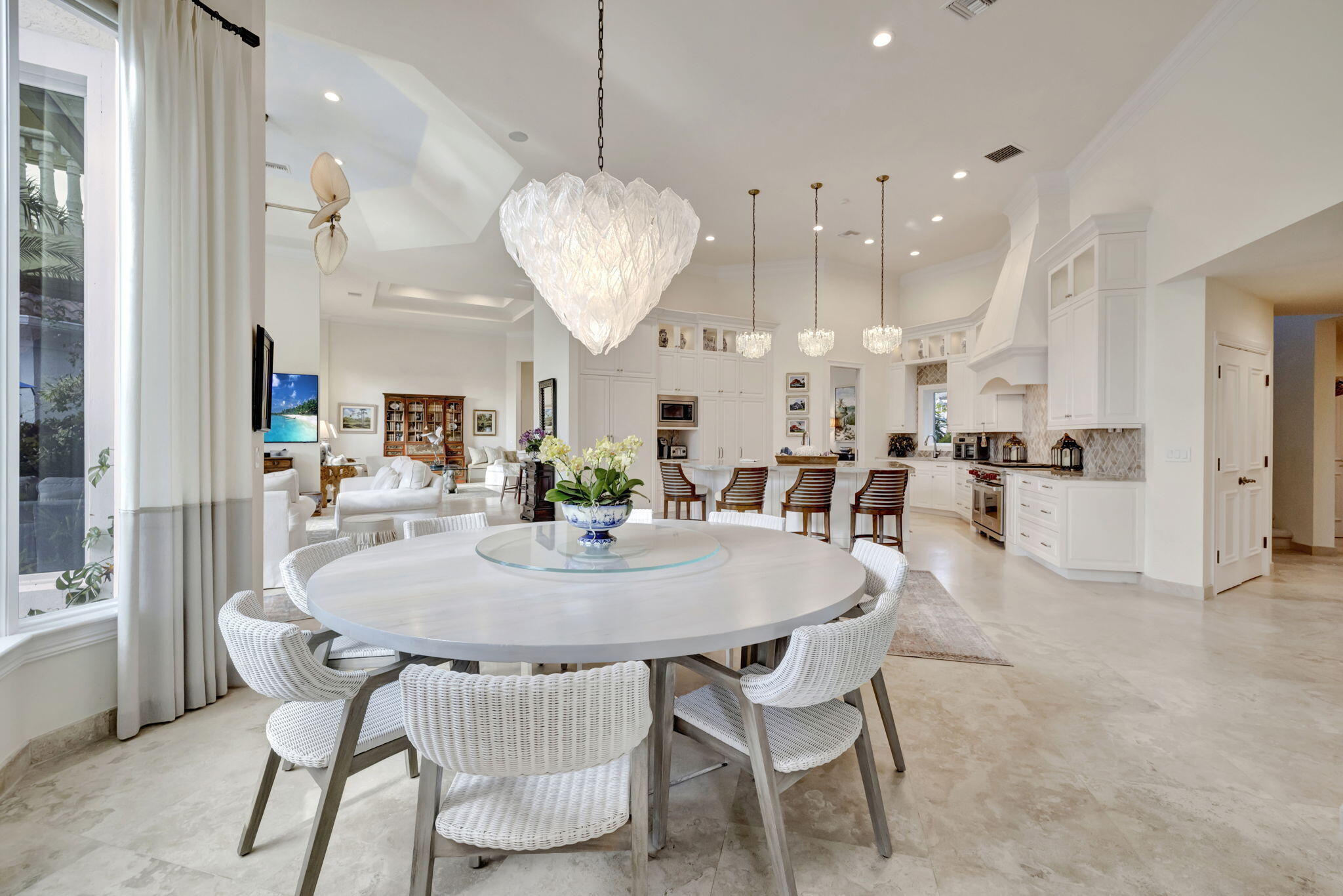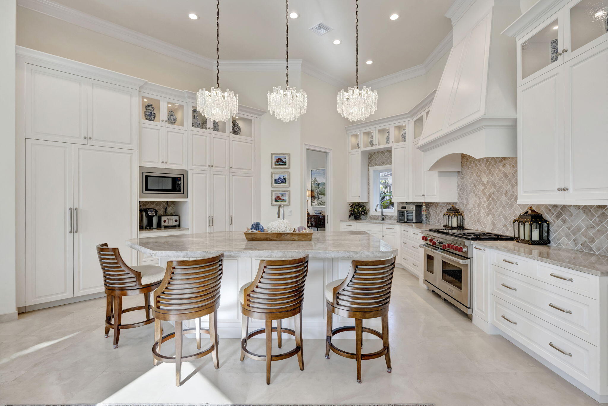 Experience the luxury and elegance of this Sailfish Point estate, ideally positioned on the Jack Nicklaus 'Signature' golf course, across the street from the ocean. This 5-bedroom, 6.2-bath gem features a chef's kitchen with Wolf 6-burner gas range, double ovens, Subzero fridge, warming drawer, island with seating and a sunny breakfast area. The open floor plan includes a library with custom cabinetry and granite fireplace, spacious living & family rooms, a wet bar with wine storage, an ice maker, and beverage drawers--perfect for entertaining. The first-floor primary suite boasts 2 full bathrooms and boutique-style closets with a second spacious guest ensuite. The upstairs guest wing has two ensuite bedrooms, a serene sitting area with a morning bar, and a private balcony. Outside, lushlandscaping surrounds a screened lanai, pool and spa, creating a tropical oasis. A three-car garage plus a golf cart entry, and a nearby crossover to the beach, complete this incredible offering. Sailfish Point offers the ultimate Florida resort-like lifestyle with its oceanfront country club, fine & casual dining, HydroGrid tennis courts, pickleball, Jack Nicklaus 'Signature' golf course, state-of-the-art fitness center & spa, full-service marina, helipad, 1.5 miles of gorgeous beach and the ultimate in private security.