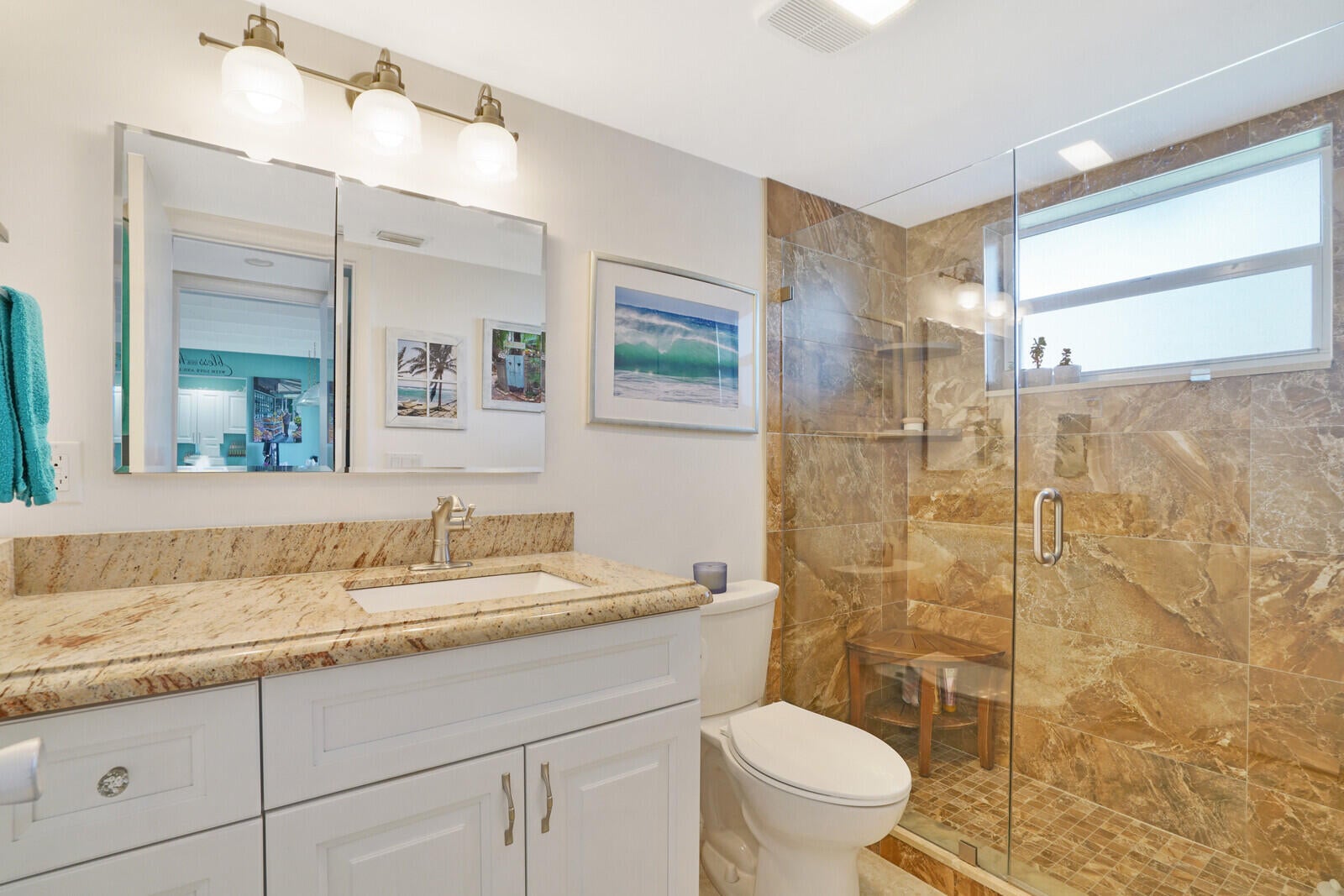 Only 67 units in the entire building. Ideal as a vacation property or full-time residence in South Palm Beach. Deeded and private beach access, building elevator, 2 covered parking,1 storage unit, 1 outside parking space, 3 bedrooms, 2.5 bathrooms, remodeled kitchen, huge balcony, walk in closet, central a/c, new windows with accordion shutters, washer and dryer inside unit and community laundry, heated community pool, outside grilling station, on-site management company, elevator access, all tile floors, stainless steel appliances, each bedroom has its own private bathroom. The building has completed all concrete restoration, painting, resurfaced heated pool and patio and new roof. This is a must see!