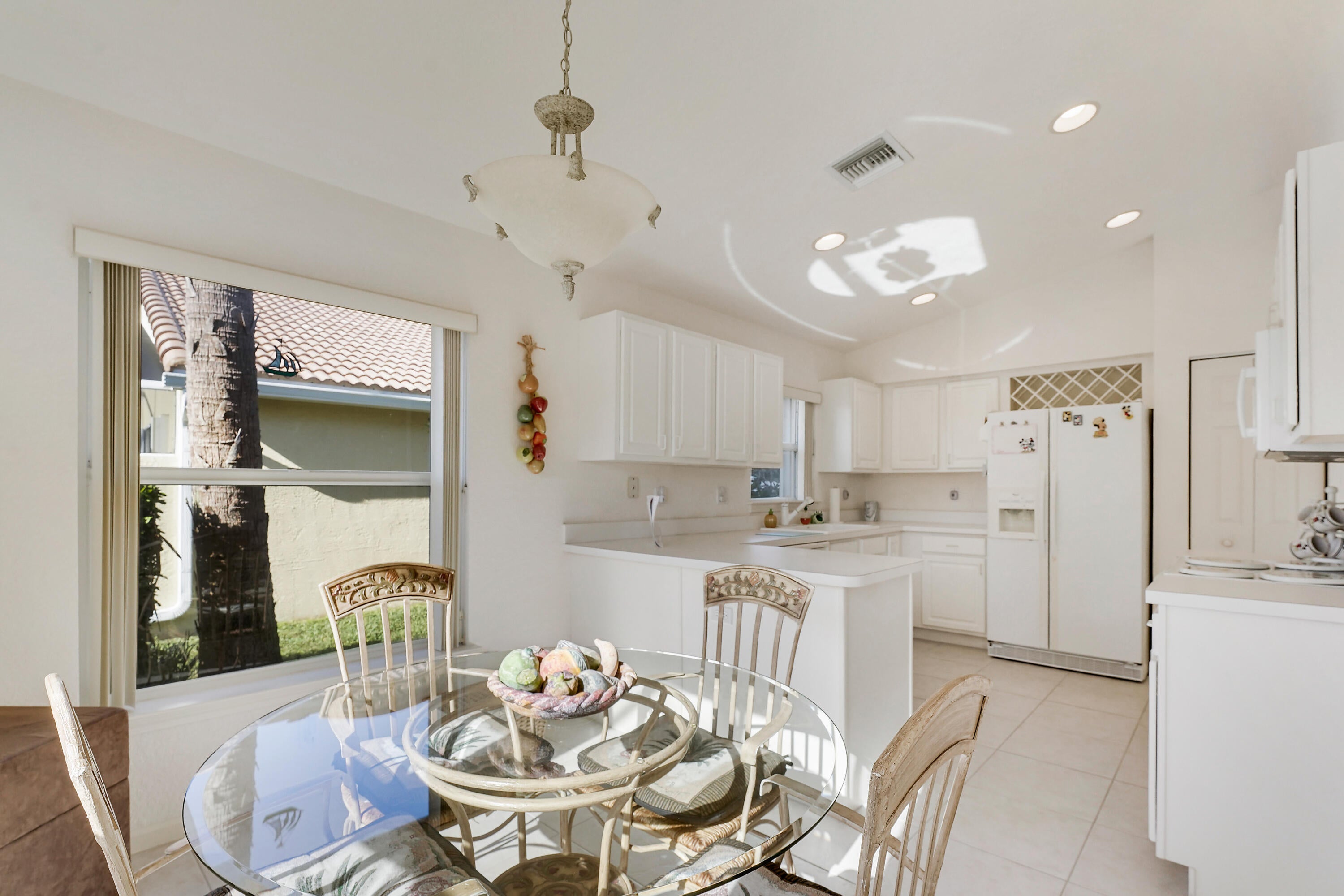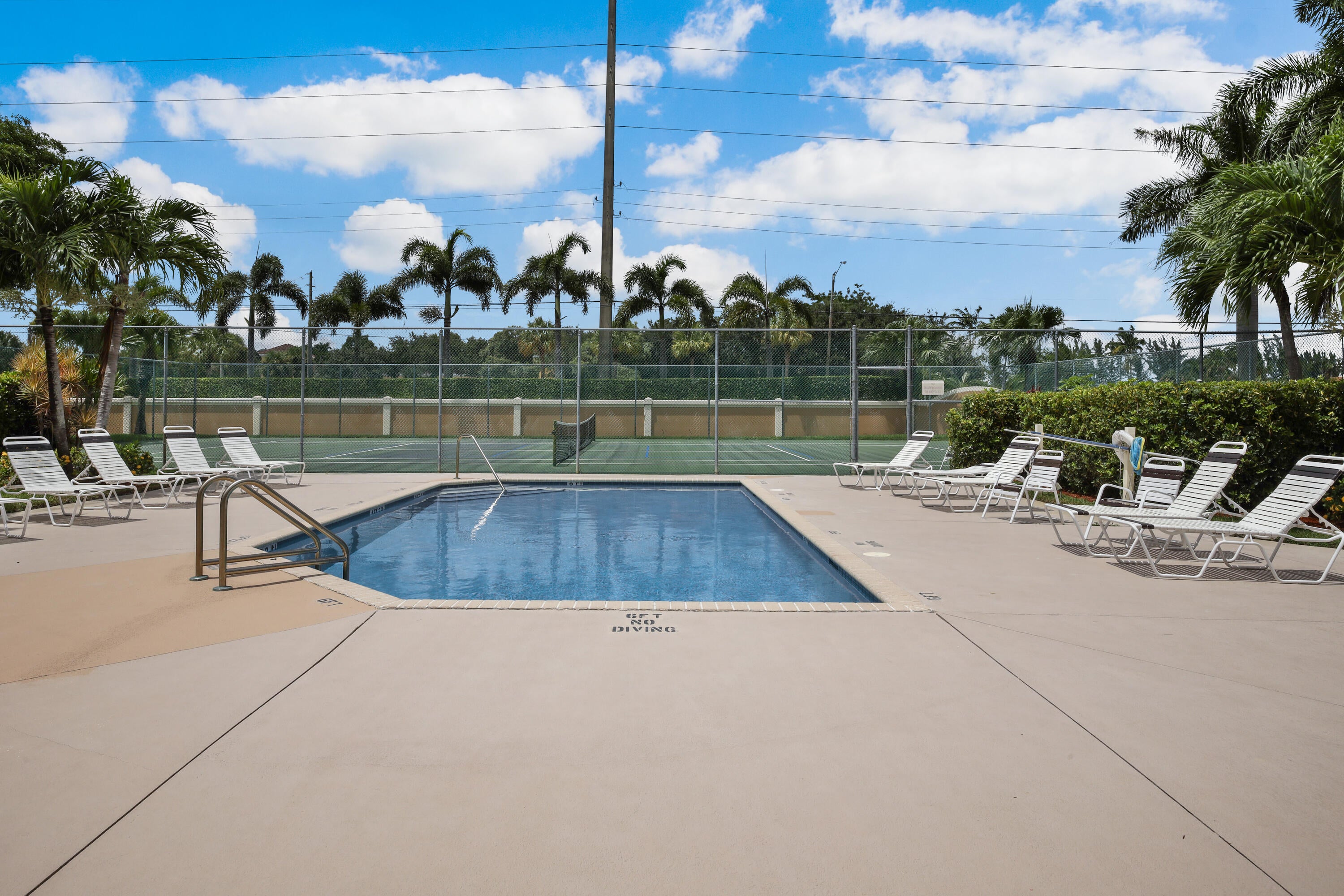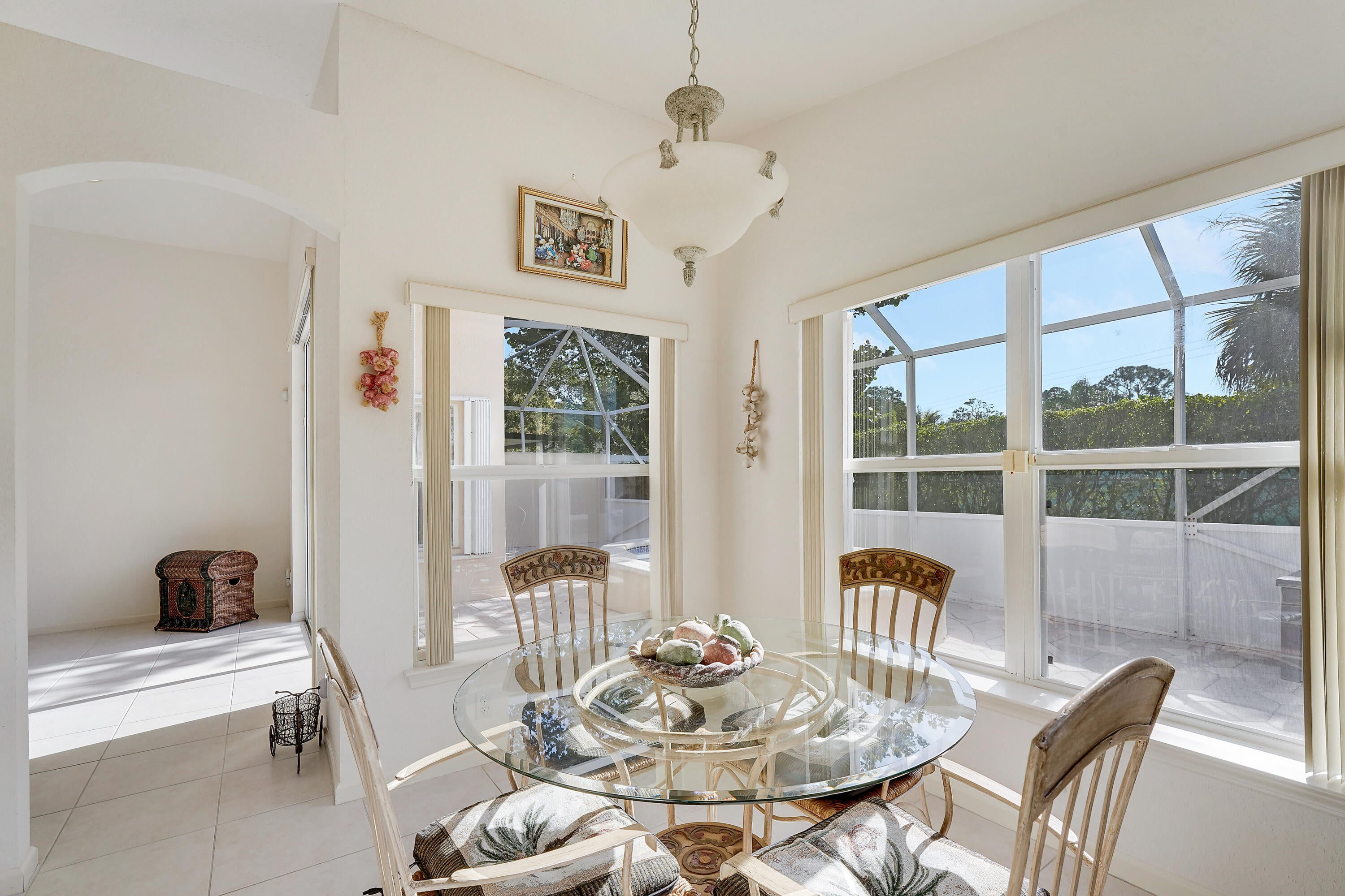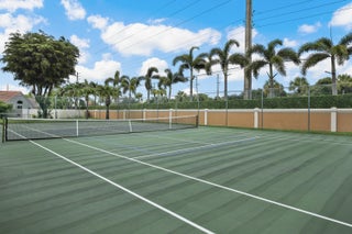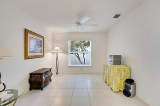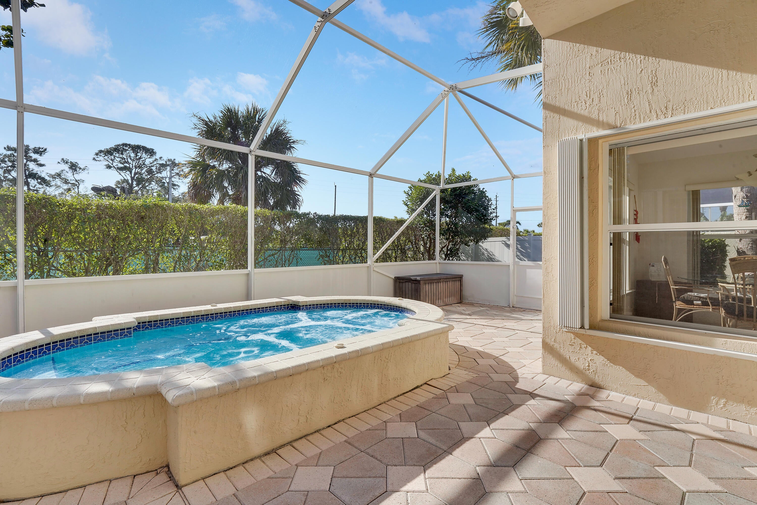 Pride of ownership, bright open space, and vaulted ceilings adorn in ever aspect of this meticulously maintained home, including the impeccable landscaping and custom paver driveway. Primary Bedroom features a large bathroom with double sinks, separate tub and shower, and large walk-in-closet. The private fenced yard can be extended approximately 25' to expand the yard area and features a covered and fully screened patio with oversized raised SPA and fully fenced yard. 3rd Bedroom/Den does not have a closet. AC unit replaced in 2020 and includes a UV Light, New Water Heater November 2024. Full hurricane protection with accordion shutters.Grande Palms is a small intimate gated community of 61 single family homes and offers residents a private pool and tennis courts.