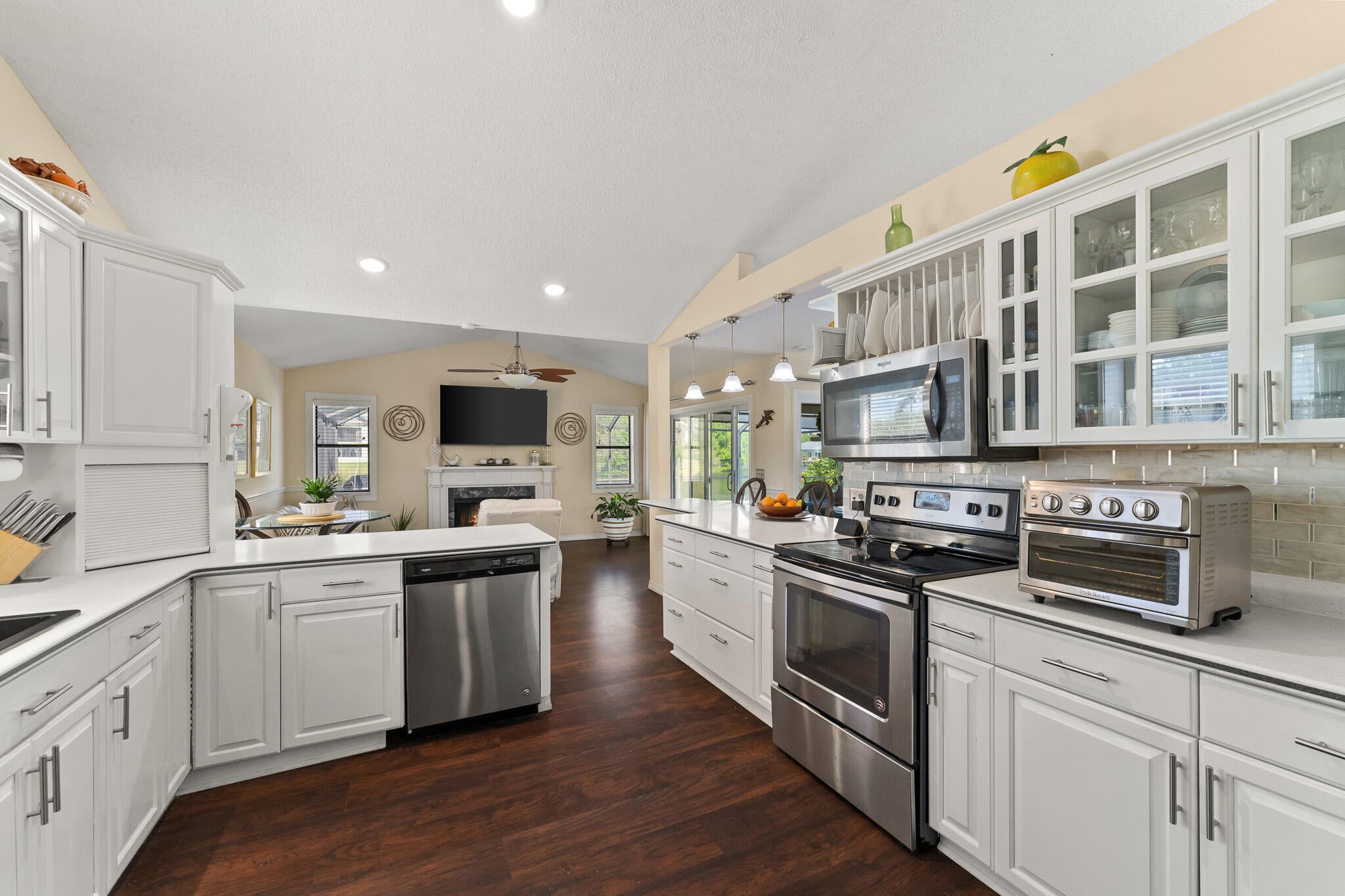 Move-in ready pool home with beautiful lake and fountain views and a newer 2022 roof! This spacious home features a large kitchen with ample cabinet and counter space, open to the breakfast area and family room with cozy fireplace and sliding doors to the pool deck. Enjoy a formal living room and dining area with vaulted ceilings, plus an inside laundry room. All bedrooms are generously sized, including a large primary suite with cabana door to the screened pool area. The home boasts neutral painted interior, luxury flooring, and stainless steel appliances. Relax or entertain on the screened patio with a concrete in-ground pool overlooking the serene lake. Gated community with tennis and marina. A wonderful opportunity!