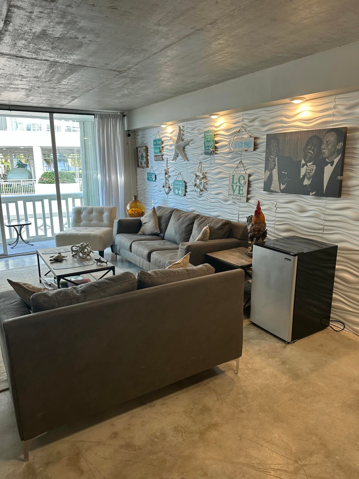 This spacious condo has 1 bedroom and 1.5 bathrooms with a large family room . New kitchen and appliances, . Large master bedroom. Unique polished concrete floors and ceiling Fully furnished. There is a full set of hurricane shutters. Barn doors condo is located close to the elevator and laundry. This property is right on the beach. Comes with a doorman, salt water pool, gym, his/her saunas and community room inside the building. Grassy area where you can sit down outside and enjoy the ocean breeze and views. Close to shopping, entertainment and dining