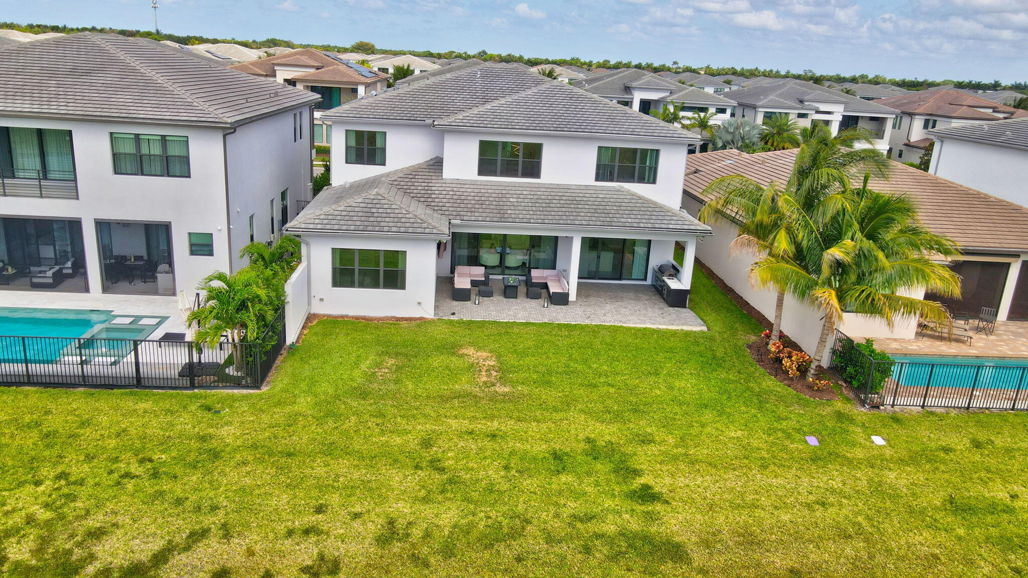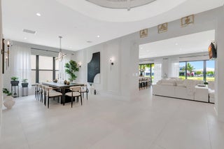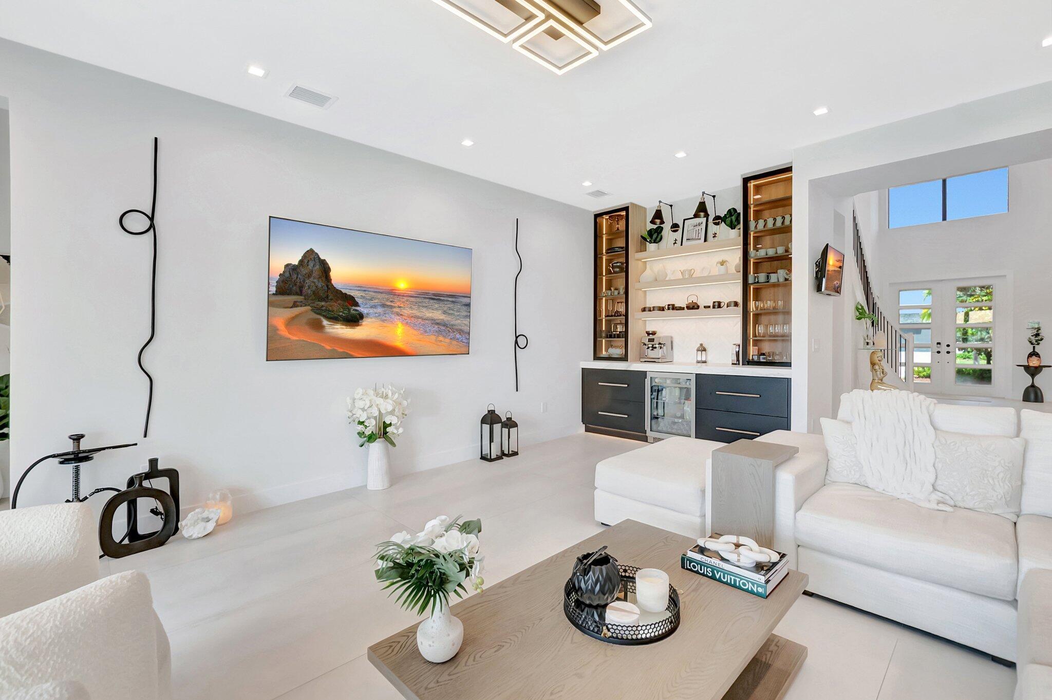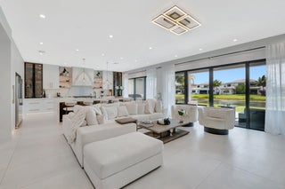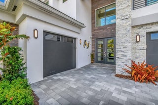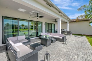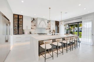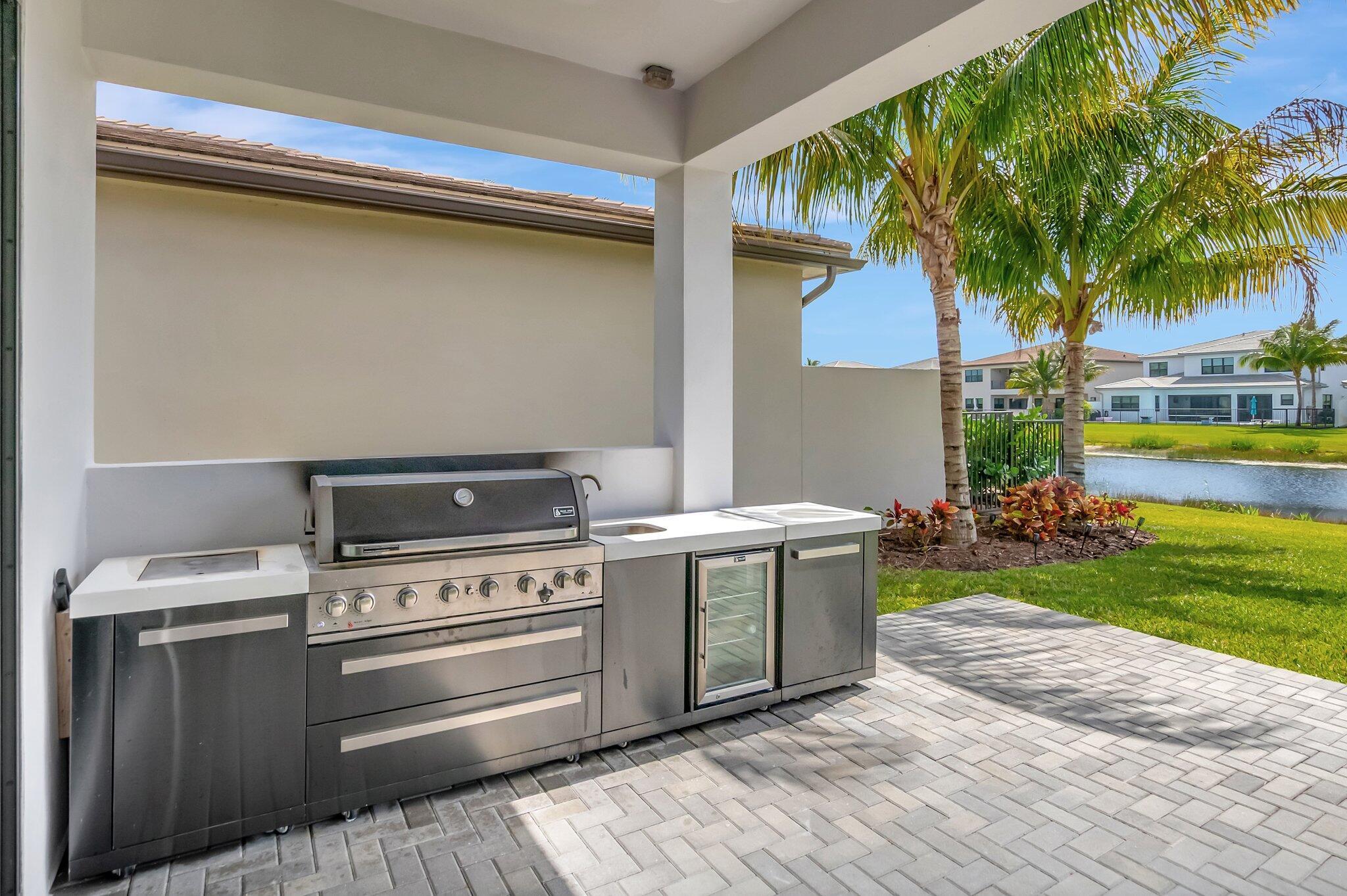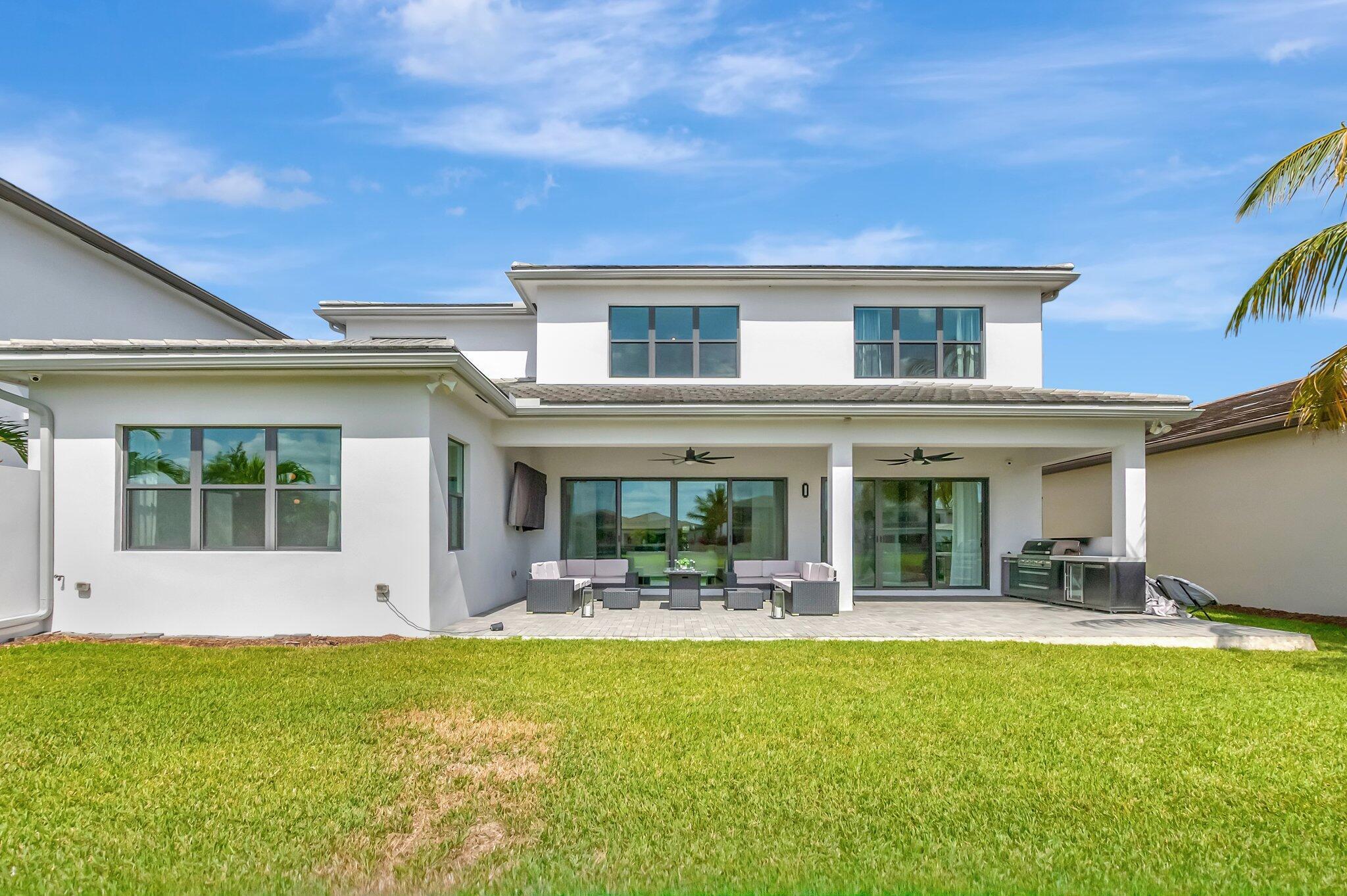 Discover unparalleled luxury in this fully upgraded, AS-IS, move-in-ready Sumatra model located in the exclusive LOTUS community of Boca Raton. Offering nearly 5,000 sq ft of elegant living space, this 5-bedroom, 5.5-bathroom residence is thoughtfully designed for modern comfort and upscale living. Enter through a grand two-story foyer featuring custom waterfalls and imported wood stairs, leading to a spacious layout with a first-floor master suite with two walk-in closets, a spa-style bathroom with bidet, dedicated office, formal dining room, media room loft, and sleek flat ceilings throughout.The heart of the home is a chef's dream kitchen, fully customized with top-of-the-line appliances including a 66" built-in fridge, 48" gas stove, microwave drawer with air fryer, paneled dishwasher, two oversized pantries with interior lighting, high-end matte porcelain countertops and matching waterfall island with lighting, gold-accented hardware, built-in outlets, and a powerful blower under a custom porcelain hood. Complementing the kitchen is a custom bar with marble backsplash, beverage fridge, and porcelain counters. Additional interior highlights include 60" matte tile flooring, custom wood floors, upgraded doors, designer lighting and fixtures, Daikin 3-zone AC with upgraded insulation, reverse osmosis water filter, GE washer/dryer with custom cabinetry in the laundry room, pre-wiring for speakers and security, and extra electrical panels. Step outside to your private oasis featuring an extended patio with upgraded pavers, outdoor kitchen with natural gas grill, fridge, fire feature, TV, and dual fan system, plus outdoor furniture included. The epoxy-coated garage floors, security cameras, 400 AMP panel, enhanced exterior lighting, and whole-house UV water filtration system add convenience and peace of mind. The home is pre-wired for a future pool and screen enclosure and features an outdoor speaker system and multiple electrical outlets. As part of the resort-style LOTUS community, enjoy access to a luxurious clubhouse, restaurant, fitness center, resort pool, tennis courts, pickleball, and more. This one-of-a-kind residence offers modern elegance, functional design, and top-tier upgrades, making it a rare opportunity in one of Boca Raton's most sought-after gated communities.