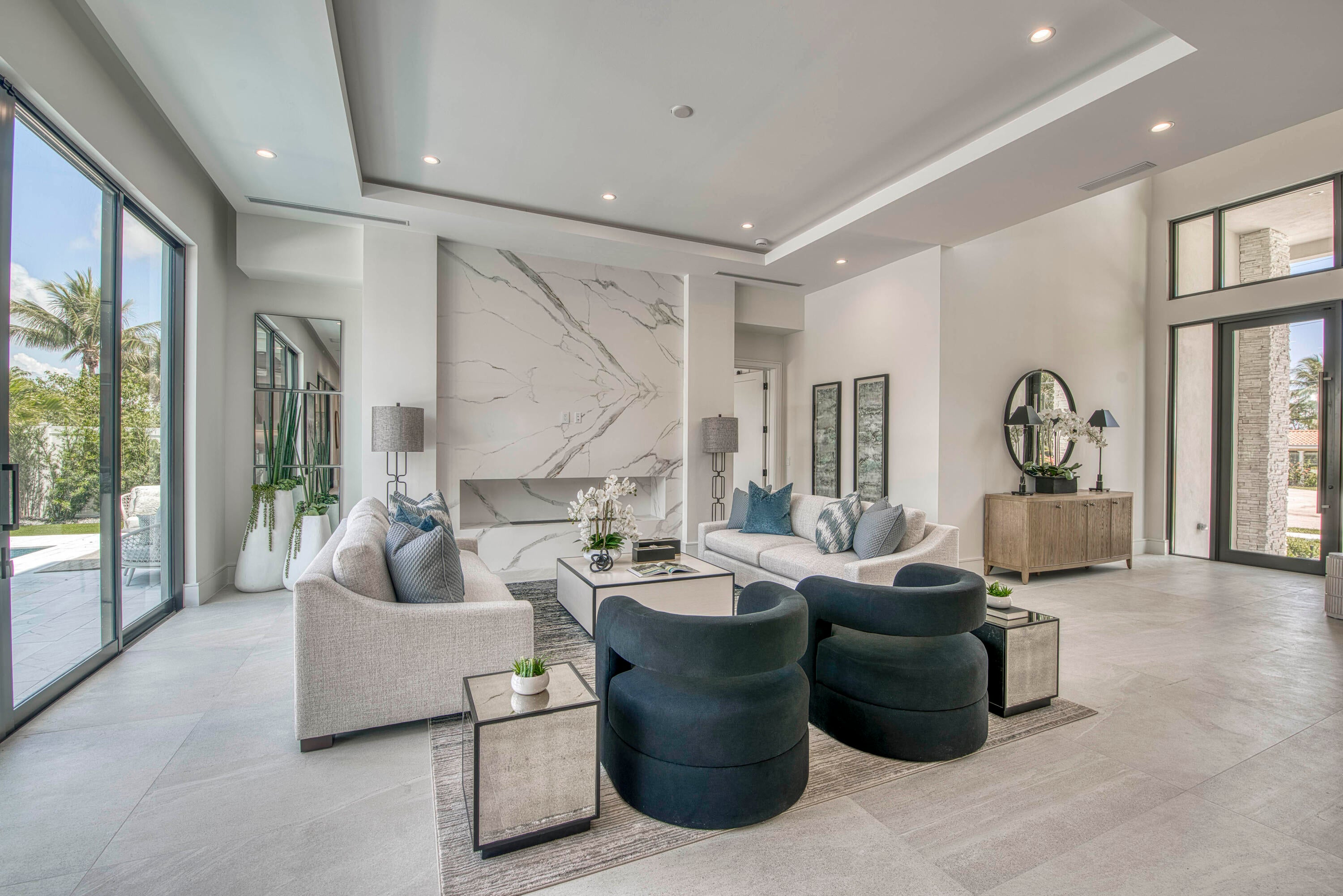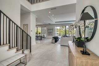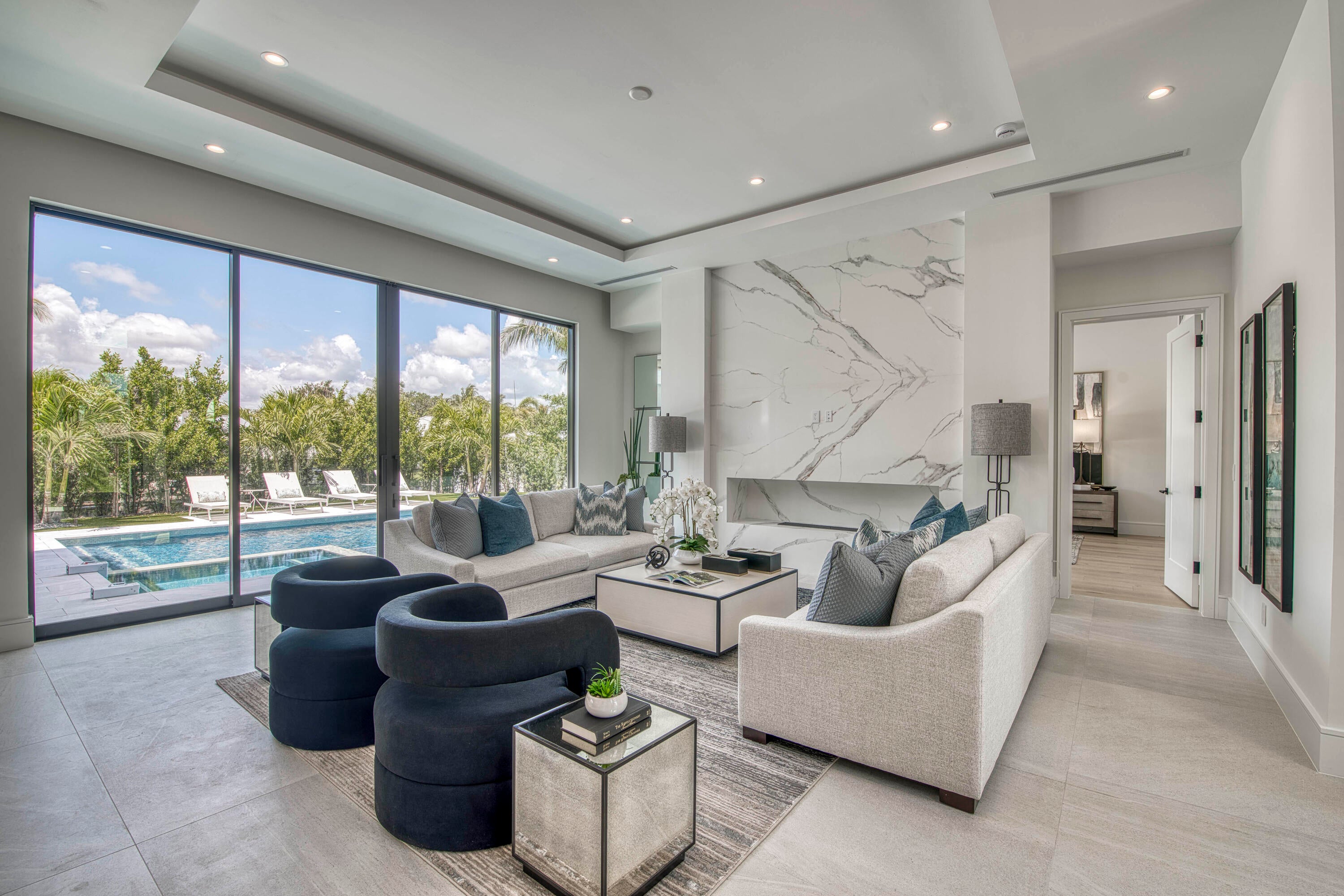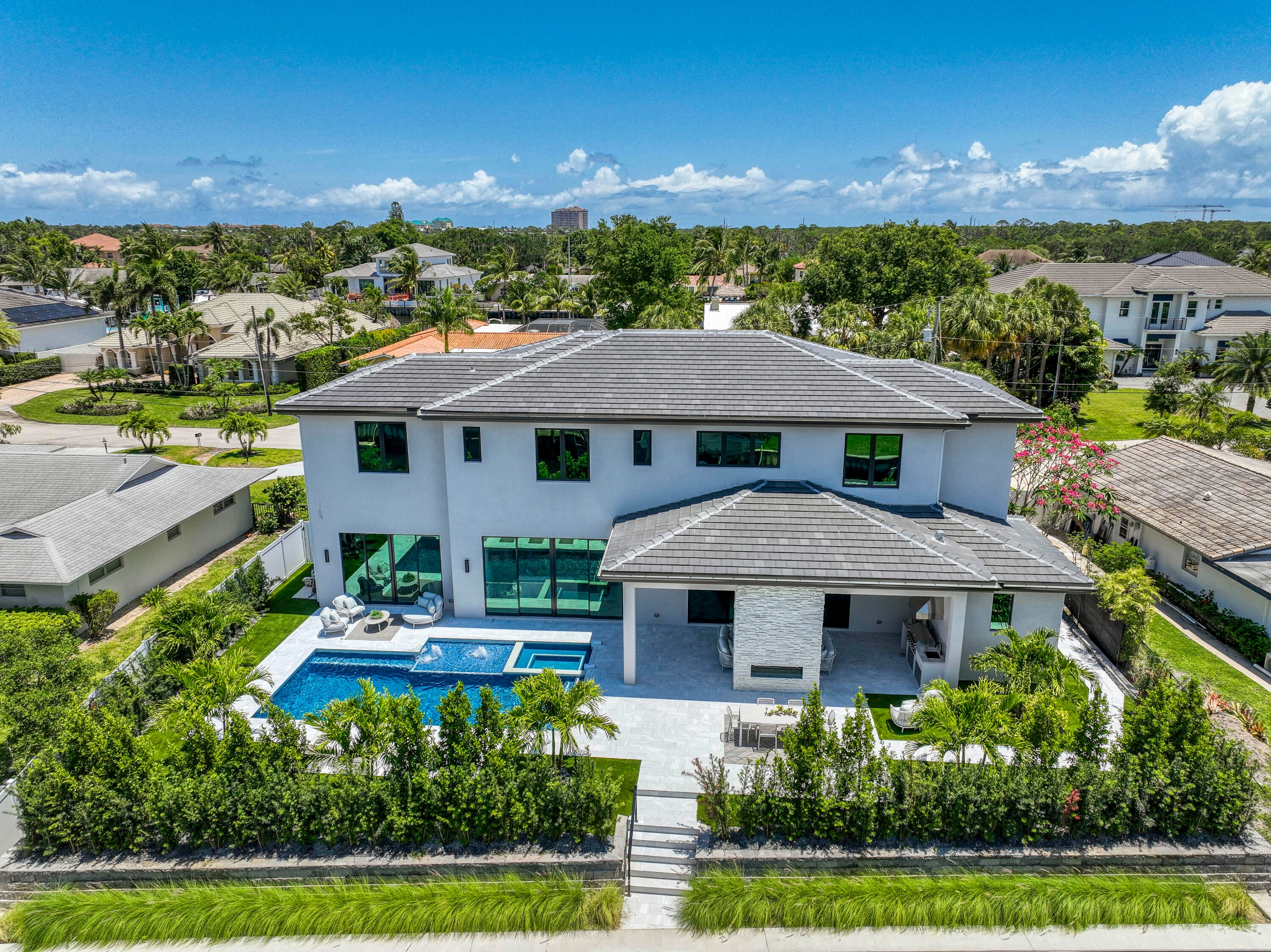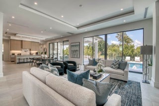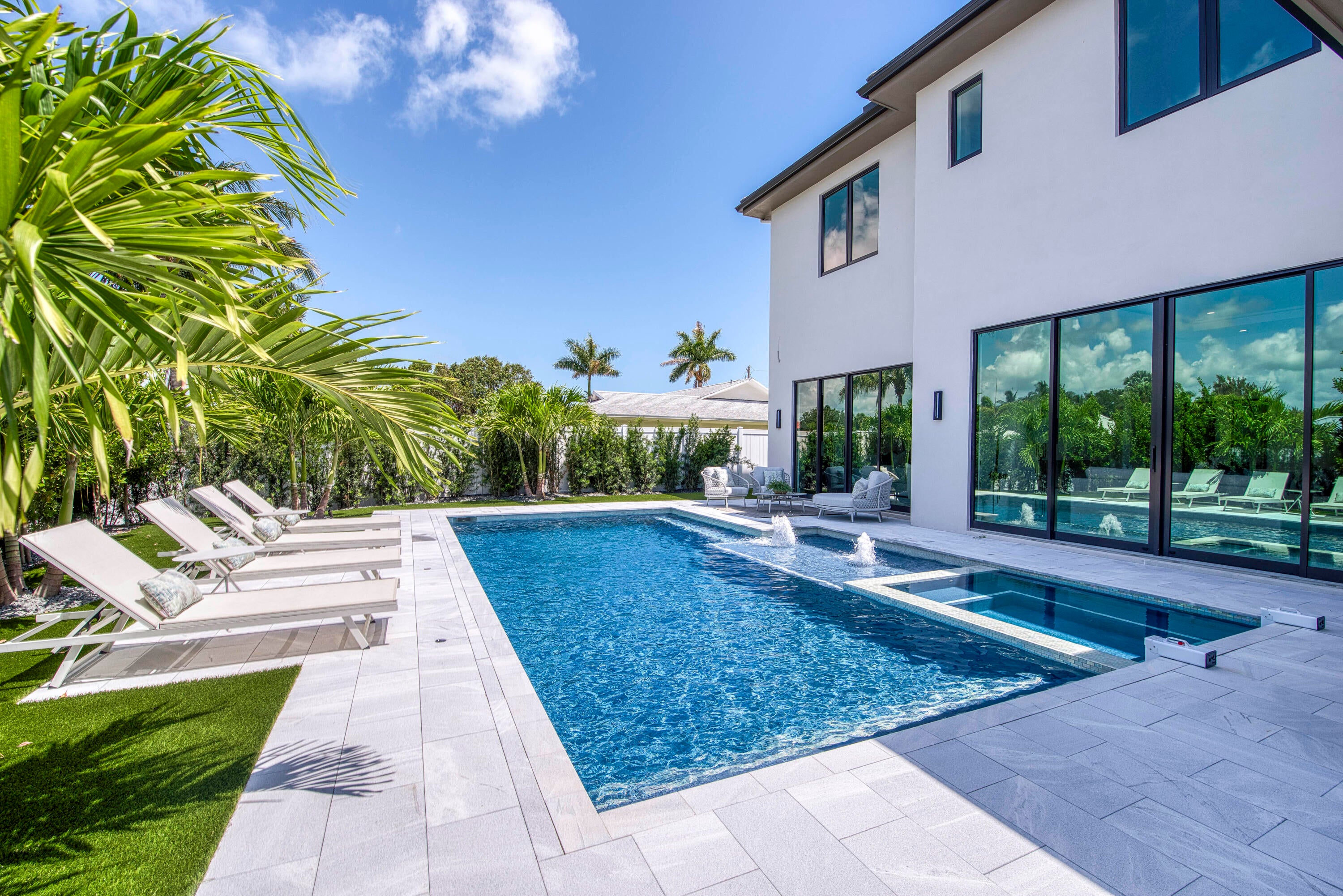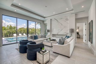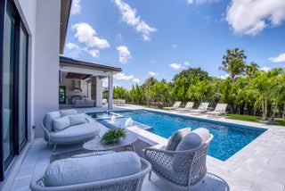 Balancing modern elegance with a true waterfront lifestyle, this brand-new construction by Dell Development is a standout offering in the prestigious boating community of Paradise Port, located in the heart of Palm Beach Gardens. This exceptional 4,920-square-foot estate boasts 95 feet of waterfrontage with a brand-new seawall and delivers refined luxury in a thoughtfully designed two-story layout. Featuring 5 bedrooms and 6 bathrooms, the home seamlessly blends sophisticated design with functional comfort. From the moment you enter, clean architectural lines and a light-filled open layout make a lasting impression. The main living area showcases neutral-toned large-format tile, a sleek stone-surround fireplace, and expansive 10-foot floor-to-ceiling sliders that blur the linebetween indoor and outdoor living. The open-concept kitchen and dining area is both elegant and highly functional, anchored by a wall of custom sleek cabinetry and outfitted with premium Sub-Zero and Wolf appliances. Alabaster-toned lower cabinets pair beautifully with coordinating quartz countertops, full-height backsplashes, and a striking waterfall island. The ground-floor primary suite serves as a serene private retreat, featuring warm European white oak flooring, dual walk-in closets, and a spa-style bathroom with a soaking tub, dual showers, and dramatic floor-to-ceiling large-format porcelain tile. Upstairs, a spacious loft and office provide flexible living options, while four additional guest suites each offer en-suite baths and walk-in closets, ensuring privacy and comfort for family and guests. Outdoor living is equally impressive, with a full summer kitchen, a sparkling pool and spa with elegant deck jets, and a see-through fireplace with a built-in media wall. The open-air patio is framed by lush tropical landscaping and includes multiple zones for entertaining, sunbathing deck, lounge seating, and al fresco dining area. Just off the patio, a private stairway leads to the dock on a tranquil interior canal with direct access to the Intracoastal. Completing this exceptional backyard paradise is an outdoor tackle room for convenient boat and gear storage.