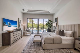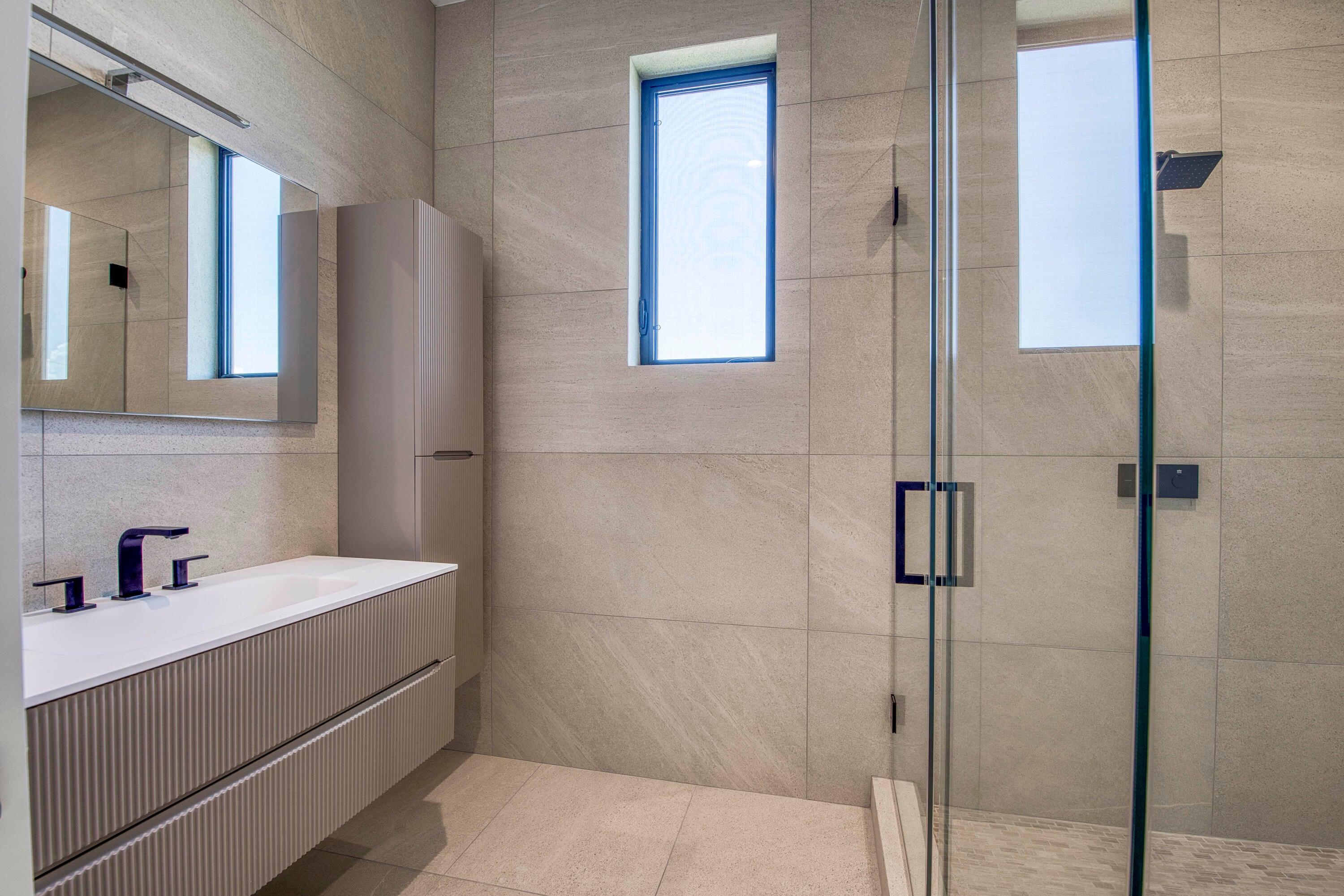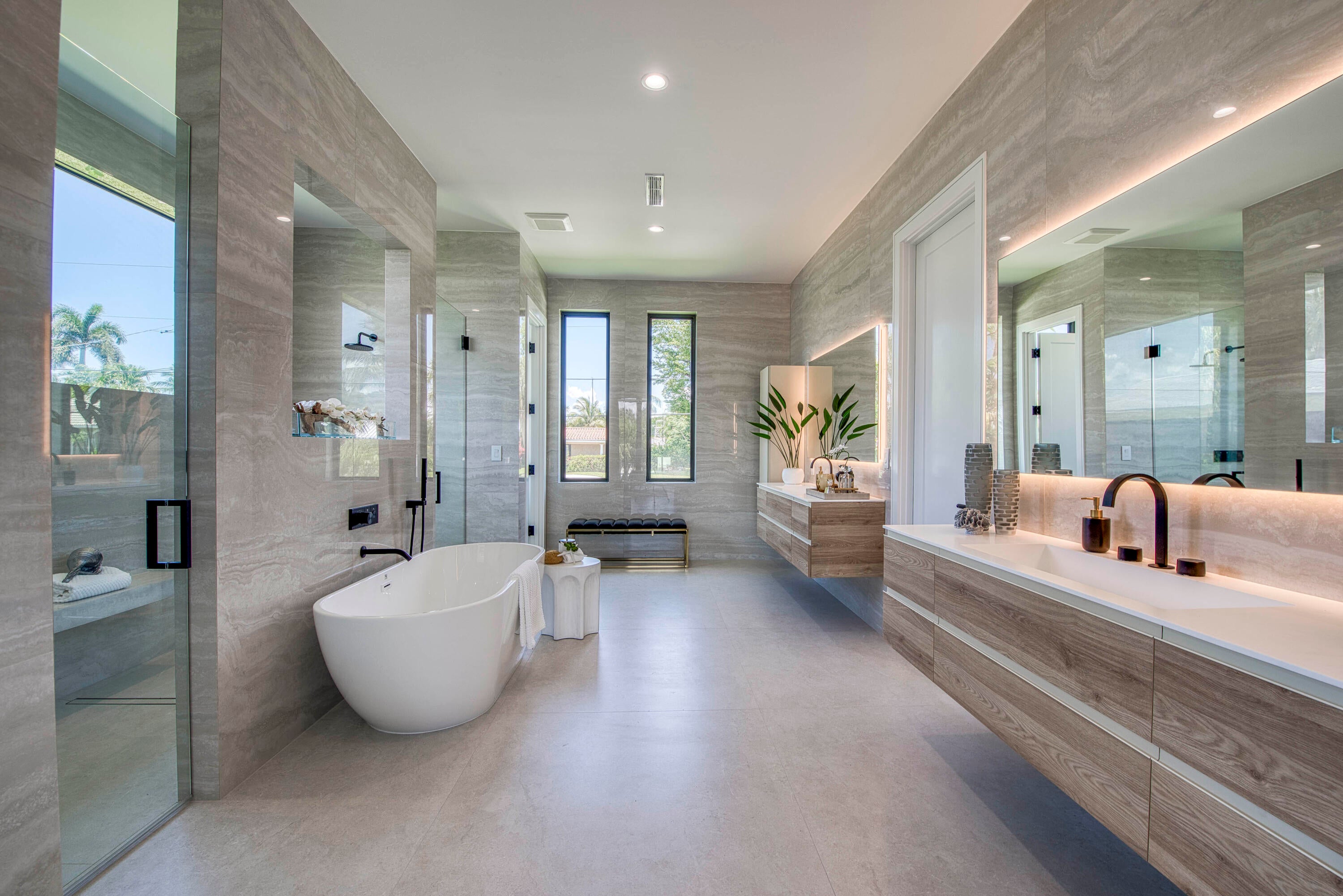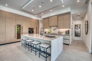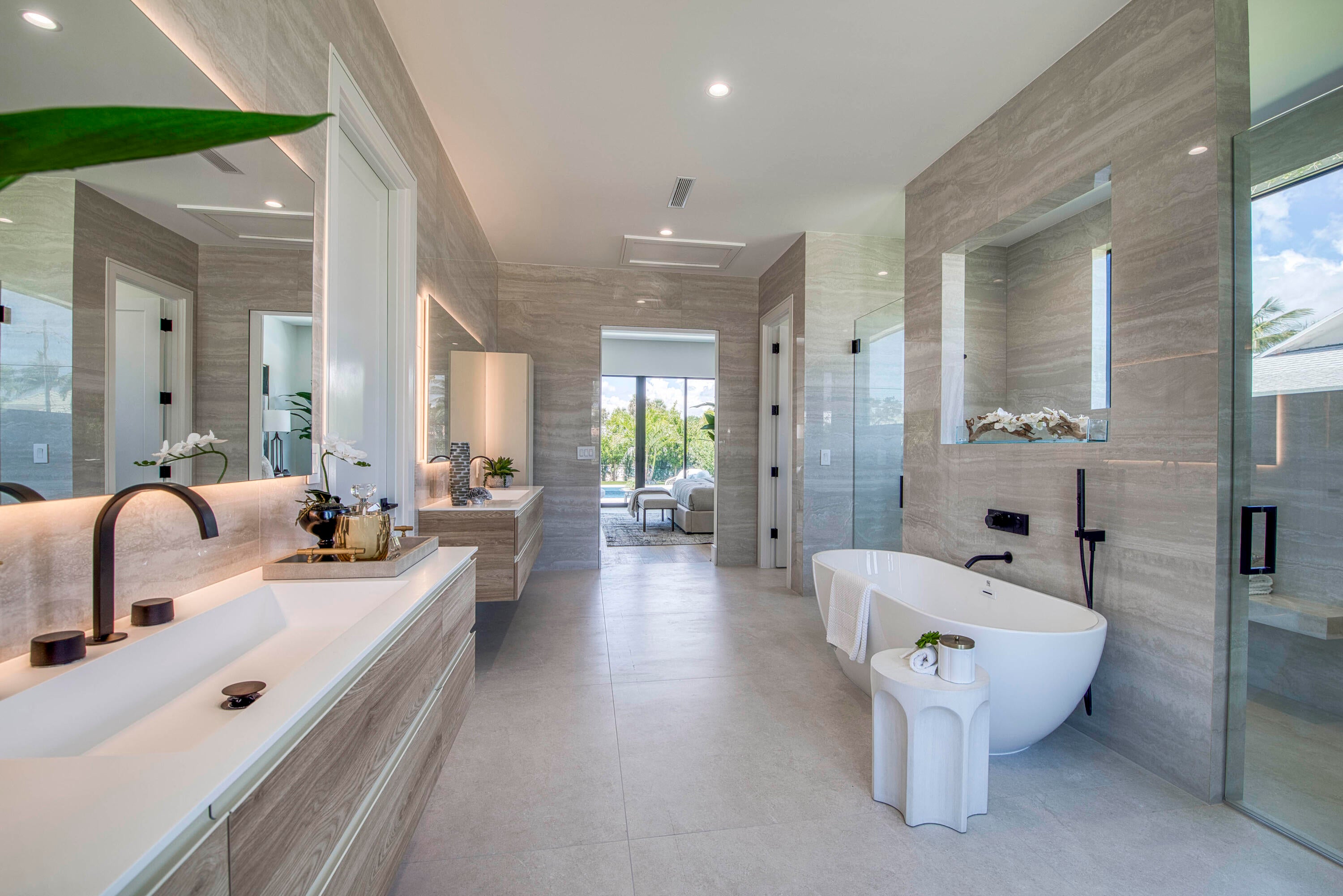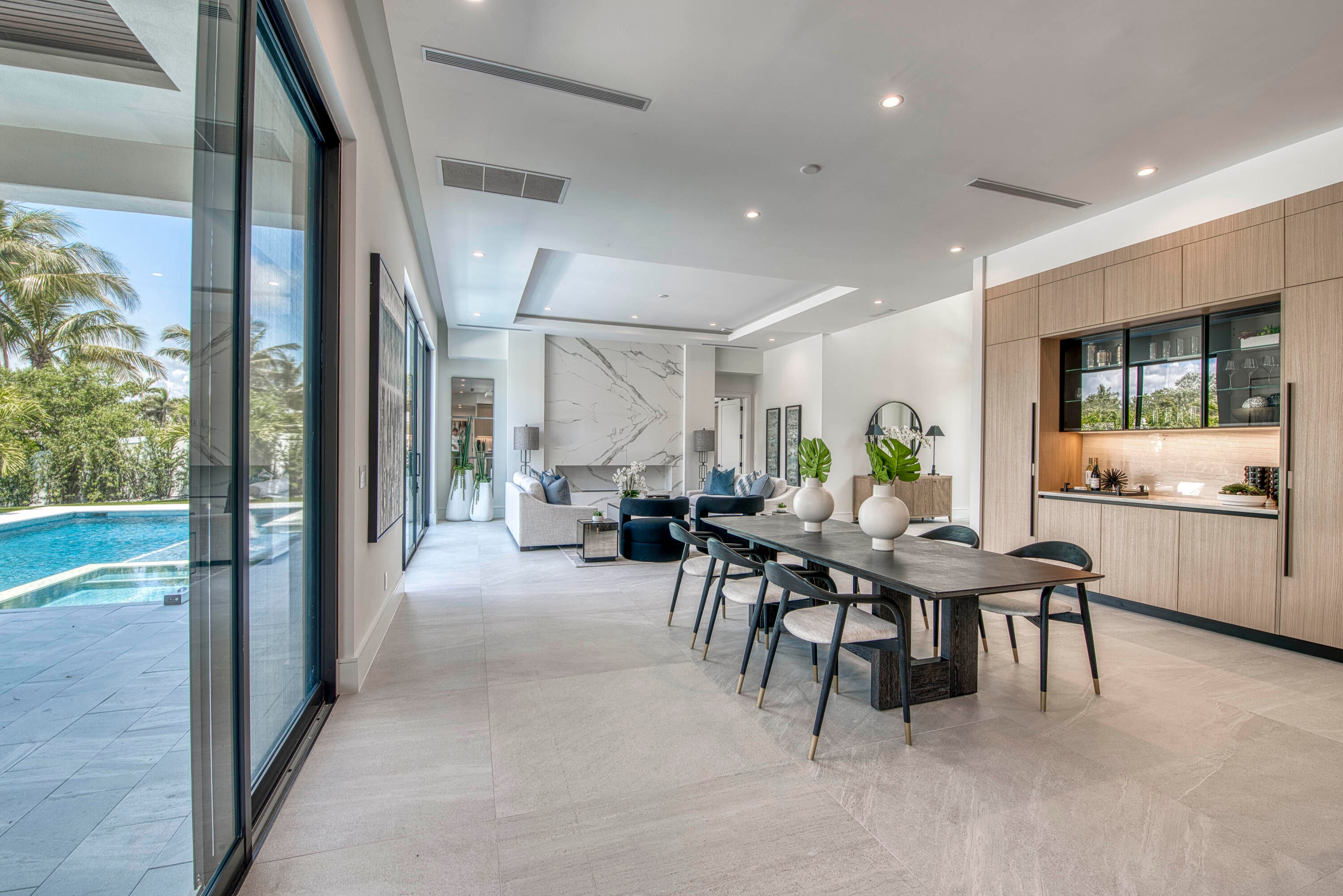 Balancing modern elegance with a true waterfront lifestyle, this brand-new construction by Dell Development is a standout offering in the prestigious boating community of Paradise Port, located in the heart of Palm Beach Gardens. This exceptional 4,920-square-foot estate boasts 95 feet of waterfrontage with a brand-new seawall and delivers refined luxury in a thoughtfully designed two-story layout. Featuring 5 bedrooms and 6 bathrooms, the home seamlessly blends sophisticated design with functional comfort. From the moment you enter, clean architectural lines and a light-filled open layout make a lasting impression. The main living area showcases neutral-toned large-format tile, a sleek stone-surround fireplace, and expansive 10-foot floor-to-ceiling sliders that blur the linebetween indoor and outdoor living. The open-concept kitchen and dining area is both elegant and highly functional, anchored by a wall of custom sleek cabinetry and outfitted with premium Sub-Zero and Wolf appliances. Alabaster-toned lower cabinets pair beautifully with coordinating quartz countertops, full-height backsplashes, and a striking waterfall island. The ground-floor primary suite serves as a serene private retreat, featuring warm European white oak flooring, dual walk-in closets, and a spa-style bathroom with a soaking tub, dual showers, and dramatic floor-to-ceiling large-format porcelain tile. Upstairs, a spacious loft and office provide flexible living options, while four additional guest suites each offer en-suite baths and walk-in closets, ensuring privacy and comfort for family and guests. Outdoor living is equally impressive, with a full summer kitchen, a sparkling pool and spa with elegant deck jets, and a see-through fireplace with a built-in media wall. The open-air patio is framed by lush tropical landscaping and includes multiple zones for entertaining, sunbathing deck, lounge seating, and al fresco dining area. Just off the patio, a private stairway leads to the dock on a tranquil interior canal with direct access to the Intracoastal. Completing this exceptional backyard paradise is an outdoor tackle room for convenient boat and gear storage.