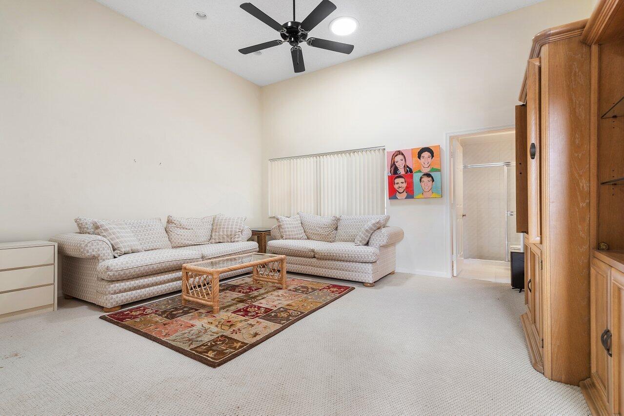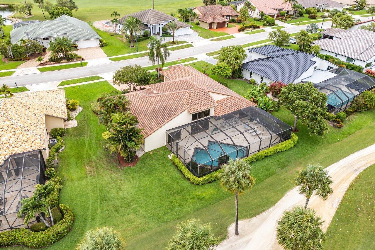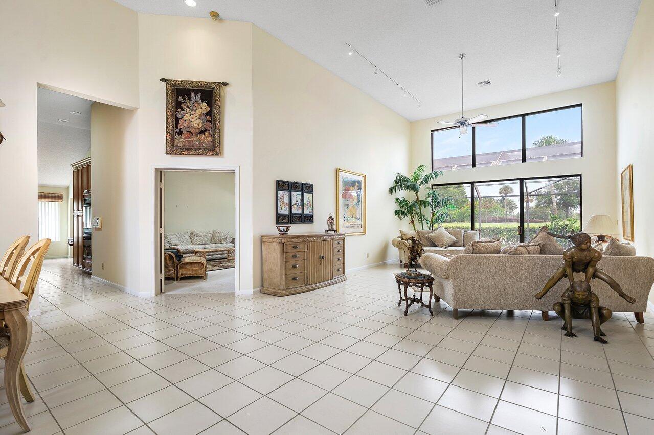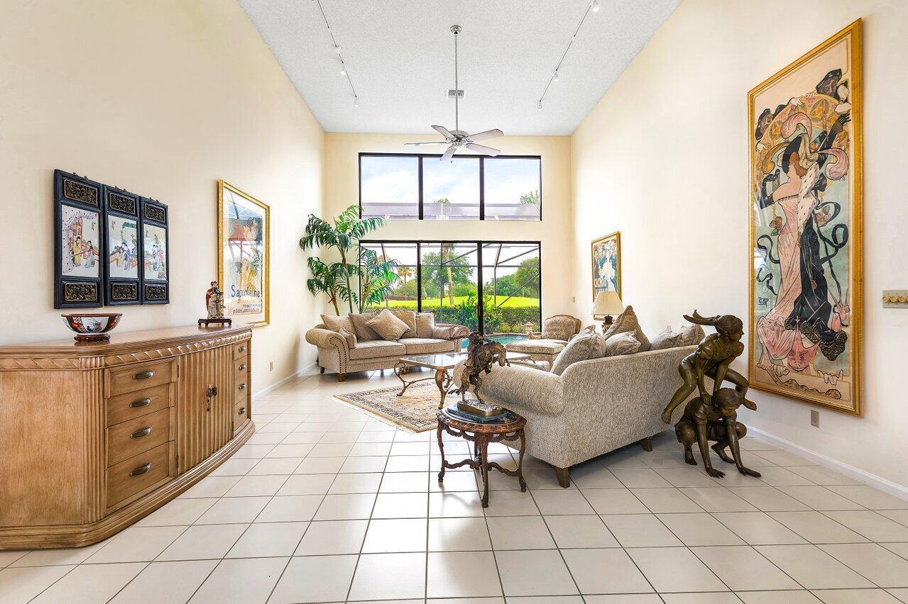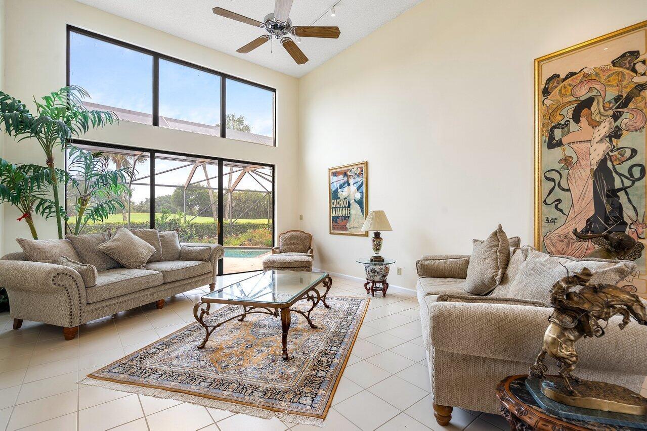 Spectacular golf course views from this 2-bedroom, 3.5-bath home featuring two expansive primary suites and a versatile office/den that can easily serve as a third bedroom. The open-concept layout boasts soaring 16-ft ceilings and dramatic double-height windows, flooding the home with natural light. Additional features include a separate golf cart entrance, two-car garage, laundry room, and a generous lot with mature fruit trees and panoramic fairway views. Roof replaced in 2018. Boca Woods Country Club Community offers resort style amenities, including two championship golf courses, Har Tru tennis courts, pickleball courts, state of the art fitness center, spa, game room, fully renovated clubhouse with fine dining and much more! Mandatory Country Club membership required $120,000.