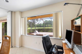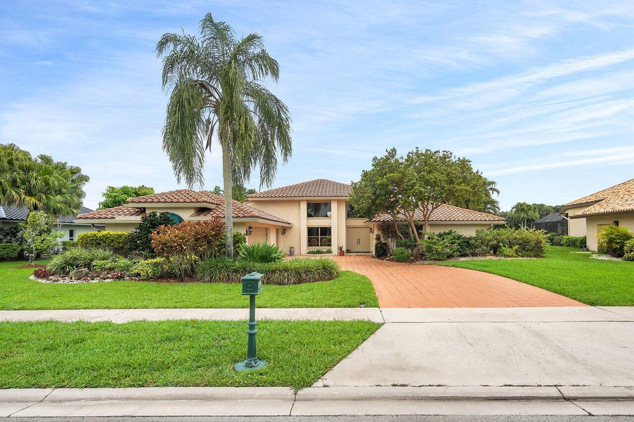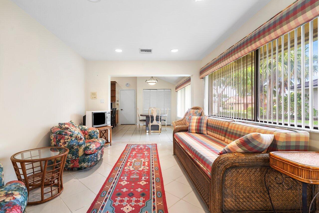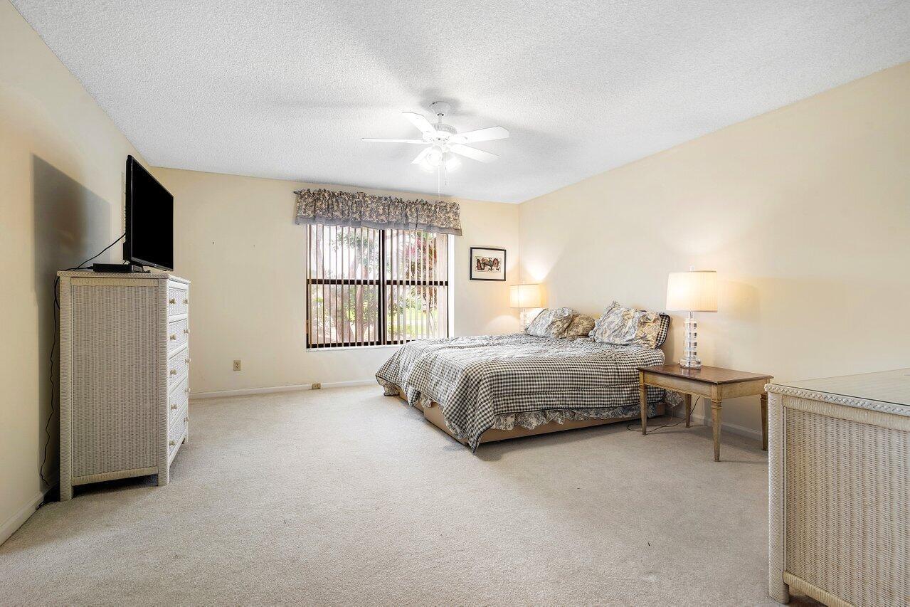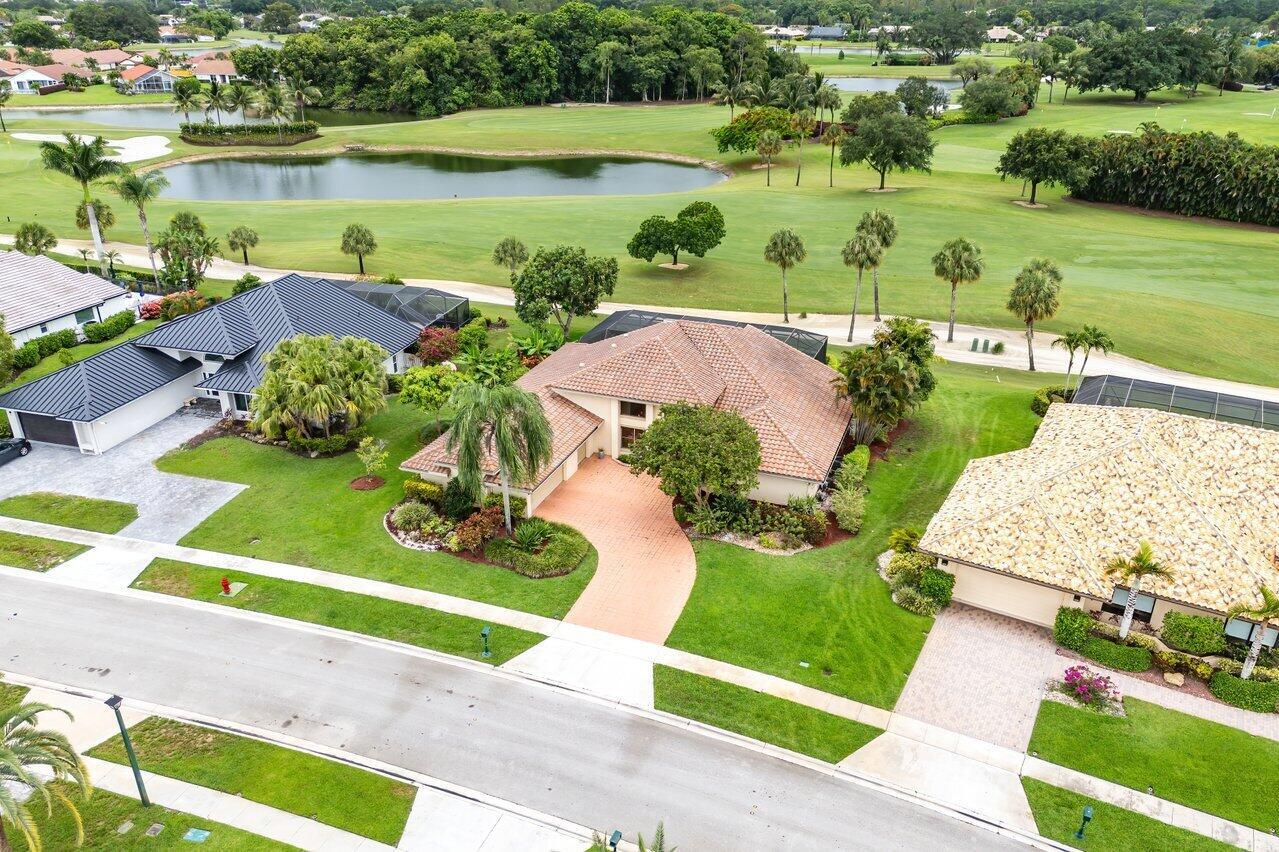 Spectacular golf course views from this 2-bedroom, 3.5-bath home featuring two expansive primary suites and a versatile office/den that can easily serve as a third bedroom. The open-concept layout boasts soaring 16-ft ceilings and dramatic double-height windows, flooding the home with natural light. Additional features include a separate golf cart entrance, two-car garage, laundry room, and a generous lot with mature fruit trees and panoramic fairway views. Roof replaced in 2018. Boca Woods Country Club Community offers resort style amenities, including two championship golf courses, Har Tru tennis courts, pickleball courts, state of the art fitness center, spa, game room, fully renovated clubhouse with fine dining and much more! Mandatory Country Club membership required $120,000.