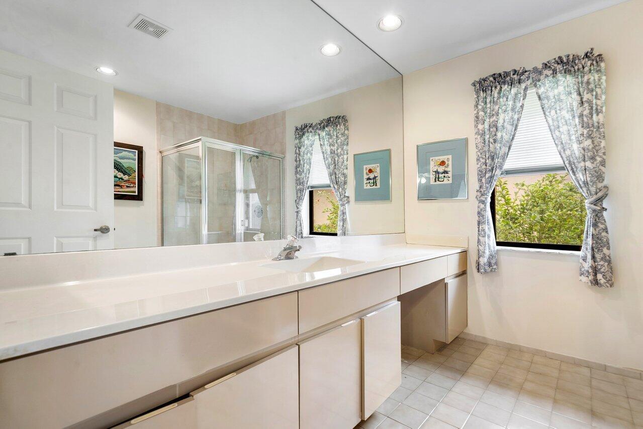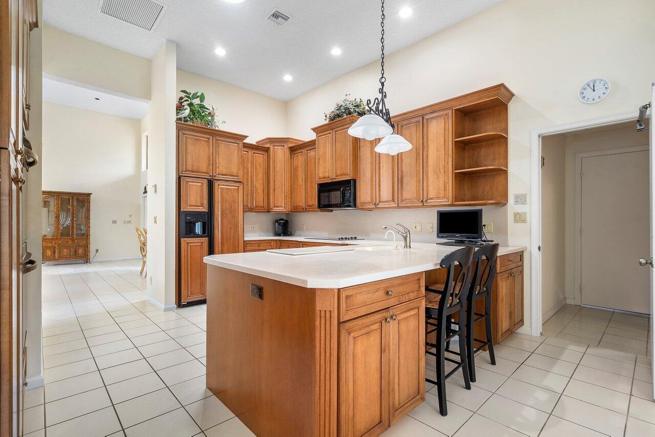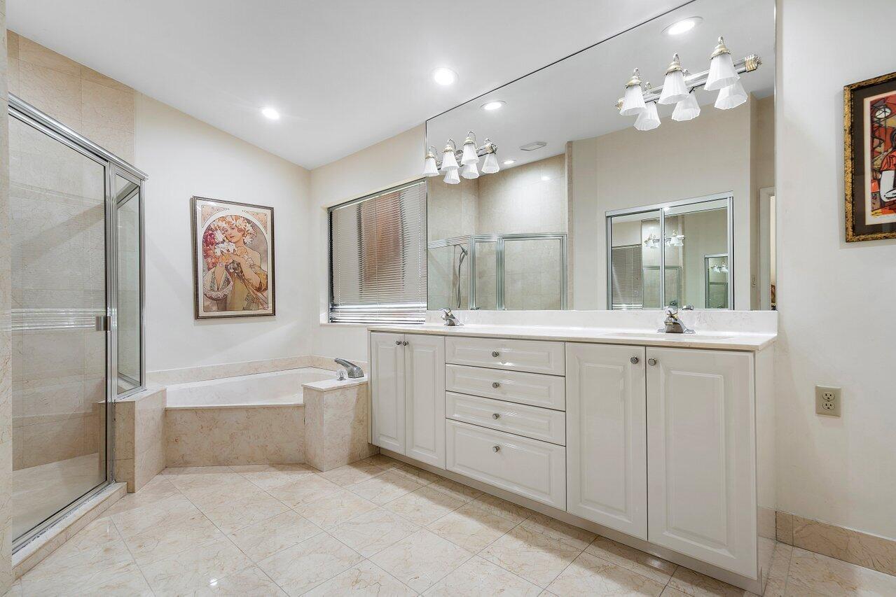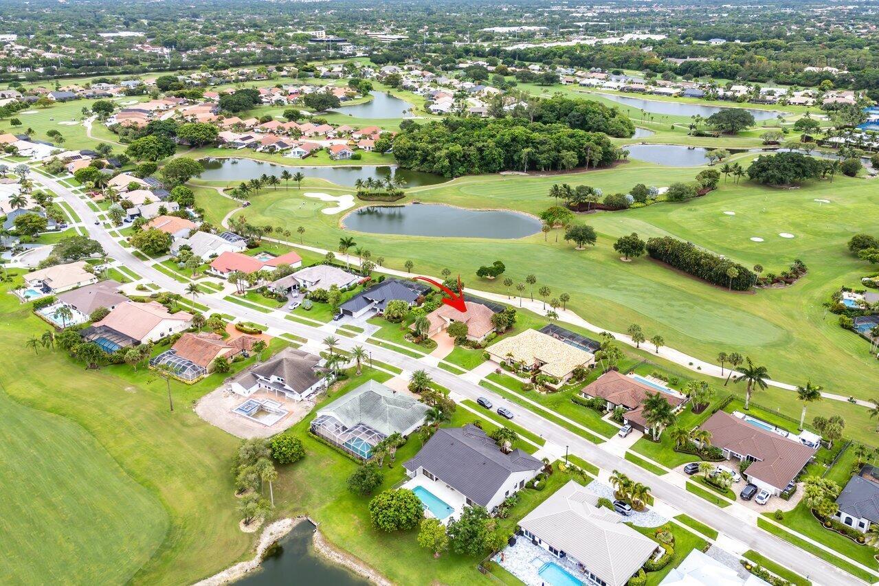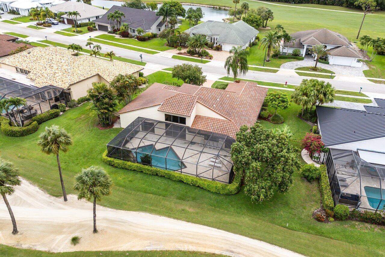 Spectacular golf course views from this 2-bedroom, 3.5-bath home featuring two expansive primary suites and a versatile office/den that can easily serve as a third bedroom. The open-concept layout boasts soaring 16-ft ceilings and dramatic double-height windows, flooding the home with natural light. Additional features include a separate golf cart entrance, two-car garage, laundry room, and a generous lot with mature fruit trees and panoramic fairway views. Roof replaced in 2018. Boca Woods Country Club Community offers resort style amenities, including two championship golf courses, Har Tru tennis courts, pickleball courts, state of the art fitness center, spa, game room, fully renovated clubhouse with fine dining and much more! Mandatory Country Club membership required $120,000.