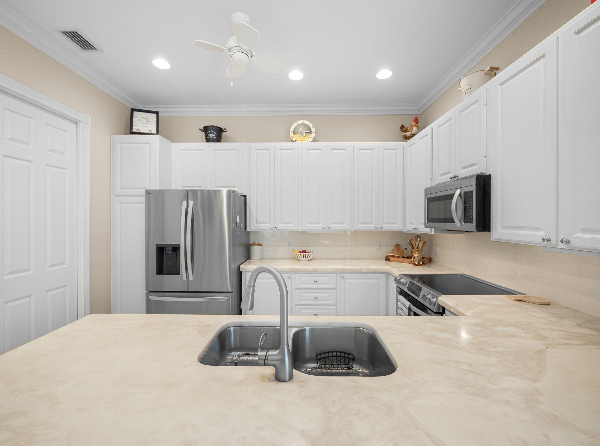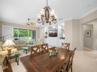 Welcome to this beautifully maintained 2 bedroom, 2 bath home with a spacious den and inviting great room, located in the sought-after, gated golf course community of The Florida Club. This residence features an upgraded kitchen with sleek finishes, tile flooring throughout, and built-in bookshelves for added character and storage. The split floorplan offers comfort and privacy, while the fenced backyard is perfect for pets or outdoor relaxation. Accordion shutters provide peace of mind during storm season, and the 2-car garage offers ample space for vehicles and storage. Enjoy resort-style living with a low HOA that includes full lawn and landscape care, cable TV, a heated community pool, and tennis/pickleball courts. The Florida Club boasts a scenic pay-as-you-play 18-hole golf course--