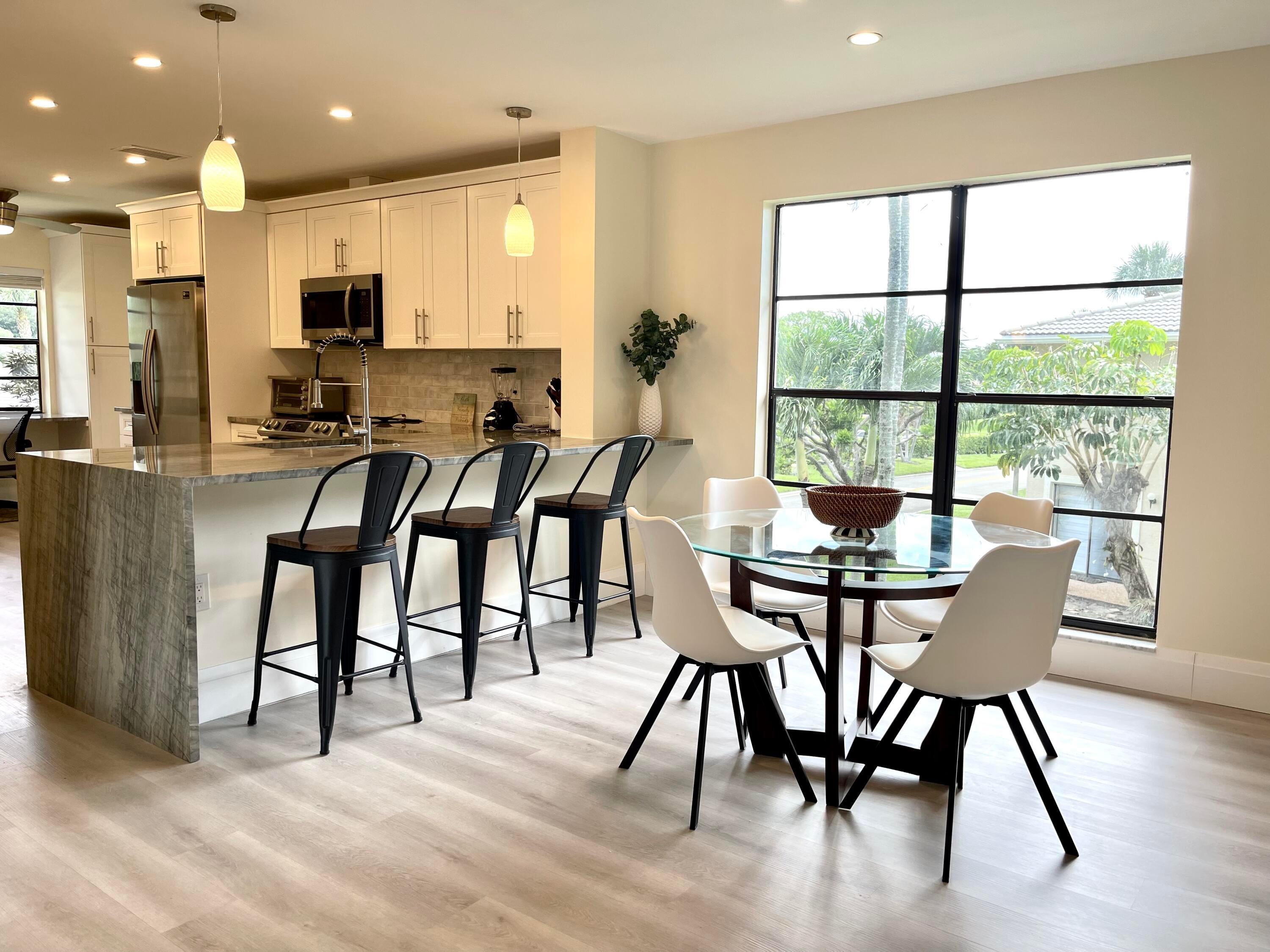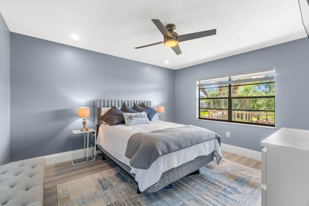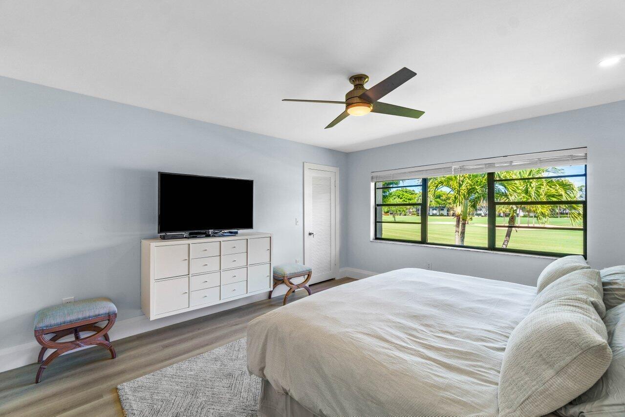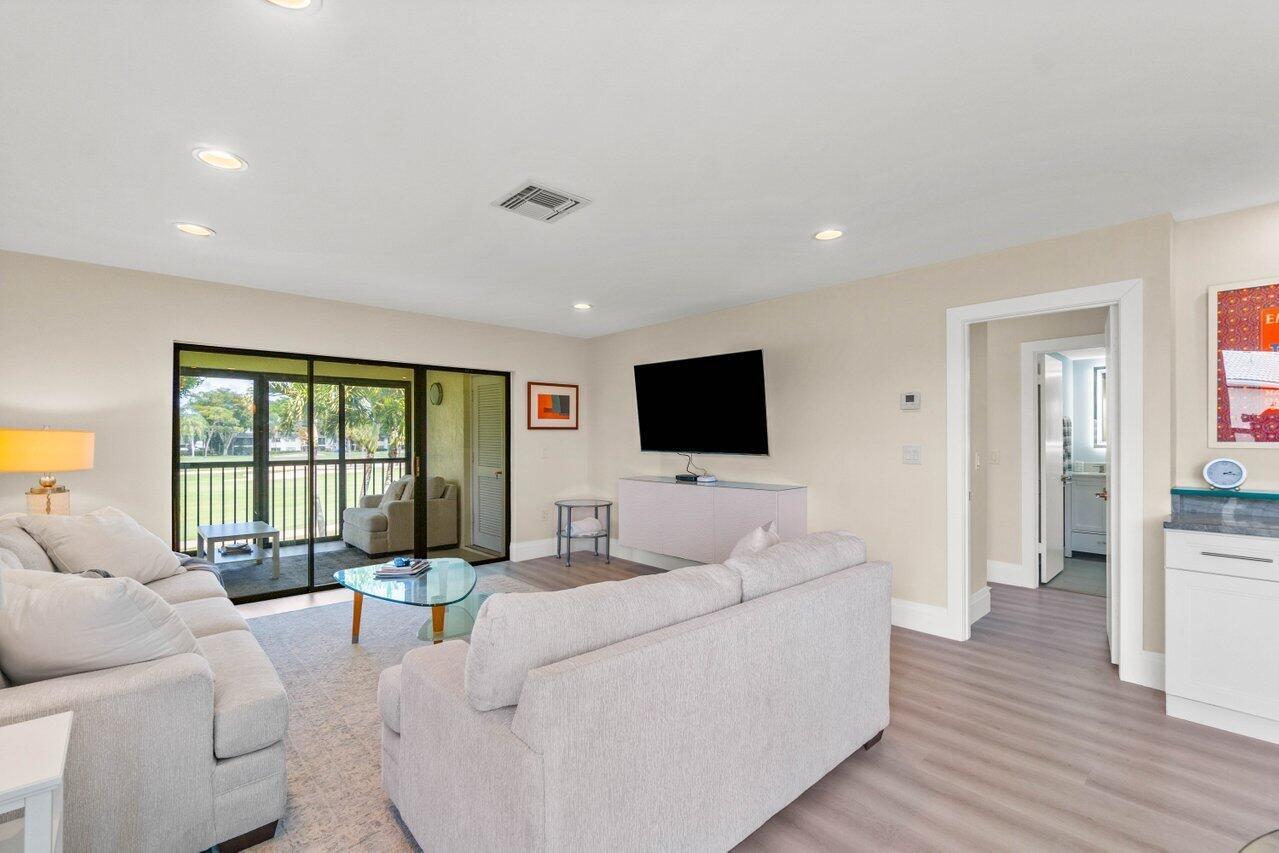 Experience luxury living at Hunters Run Country Club in this beautifully remodeled 2BR, 2BTH corner condo with sweeping golf course views. Located on the 2nd floor, this contemporary retreat offers an open-concept kitchen with white cabinetry, striking quartzite countertops, a waterfall breakfast bar, under-cabinet lighting, and a pantry closet with hidden water cooler. A built-in desk overlooks the lake, while the chic bathrooms feature LED-lit mirrors. Custom closets, stylish finishes, and TURNKEY convenience make it a move-in ready rental. Perfectly positioned across from the subdivision pool. Your ideal seasonal or off-season getaway awaits!Hunters Run CC is an amenities-filled country club, providing a fabulous active & social lifestyle; featuring 3 golf courses, 18 tennis courts, 12 pickleball courts, teams, tournaments, a resort-style pool & poolside bar & dining, subdivision pools, several dining venues, a gym with trainers and classes, a spa & salon, entertainment, events, and so much more. Located just minutes from Delray Beach's famed Atlantic Ave, the Intracoastal & beaches.