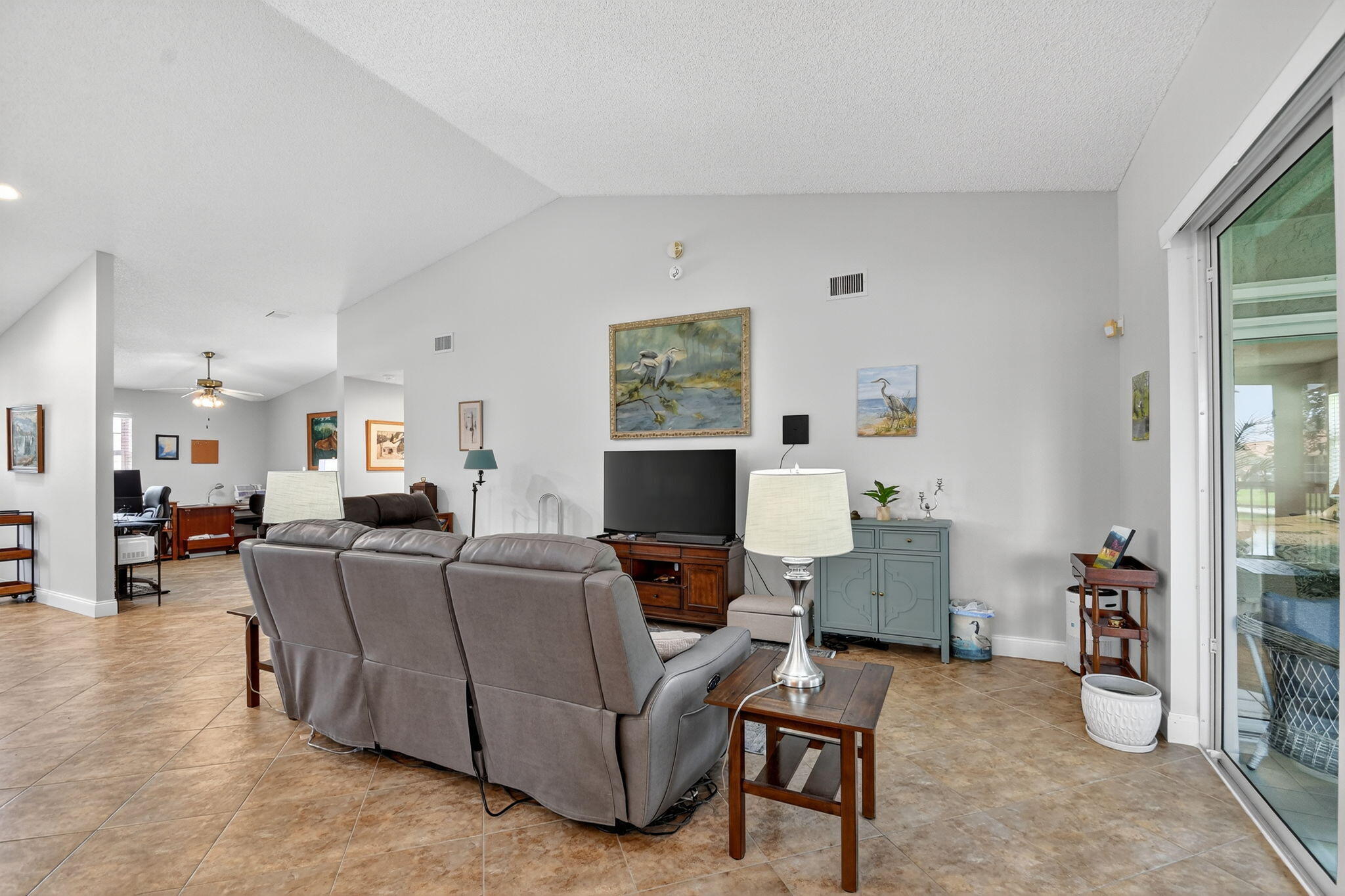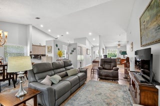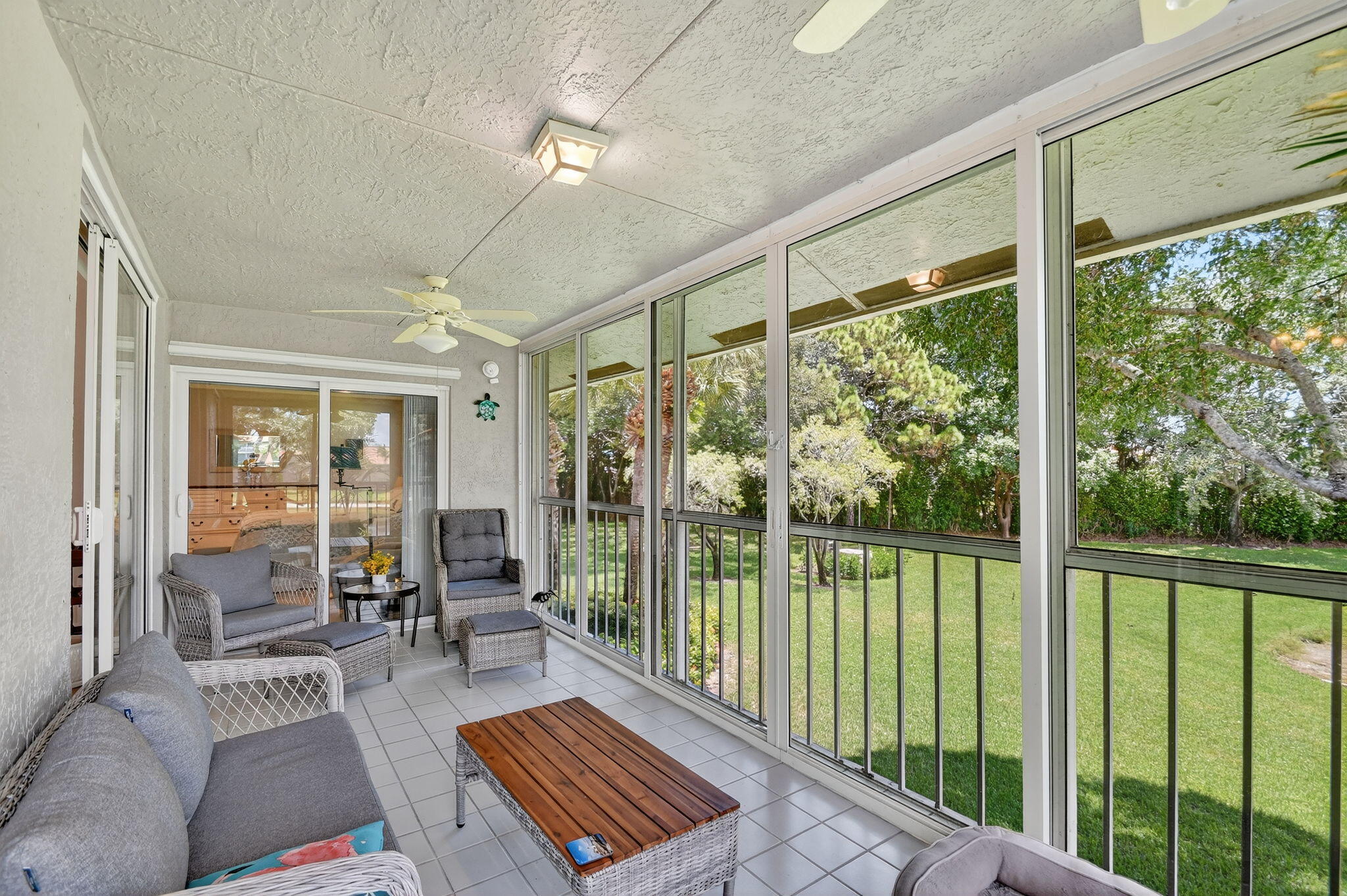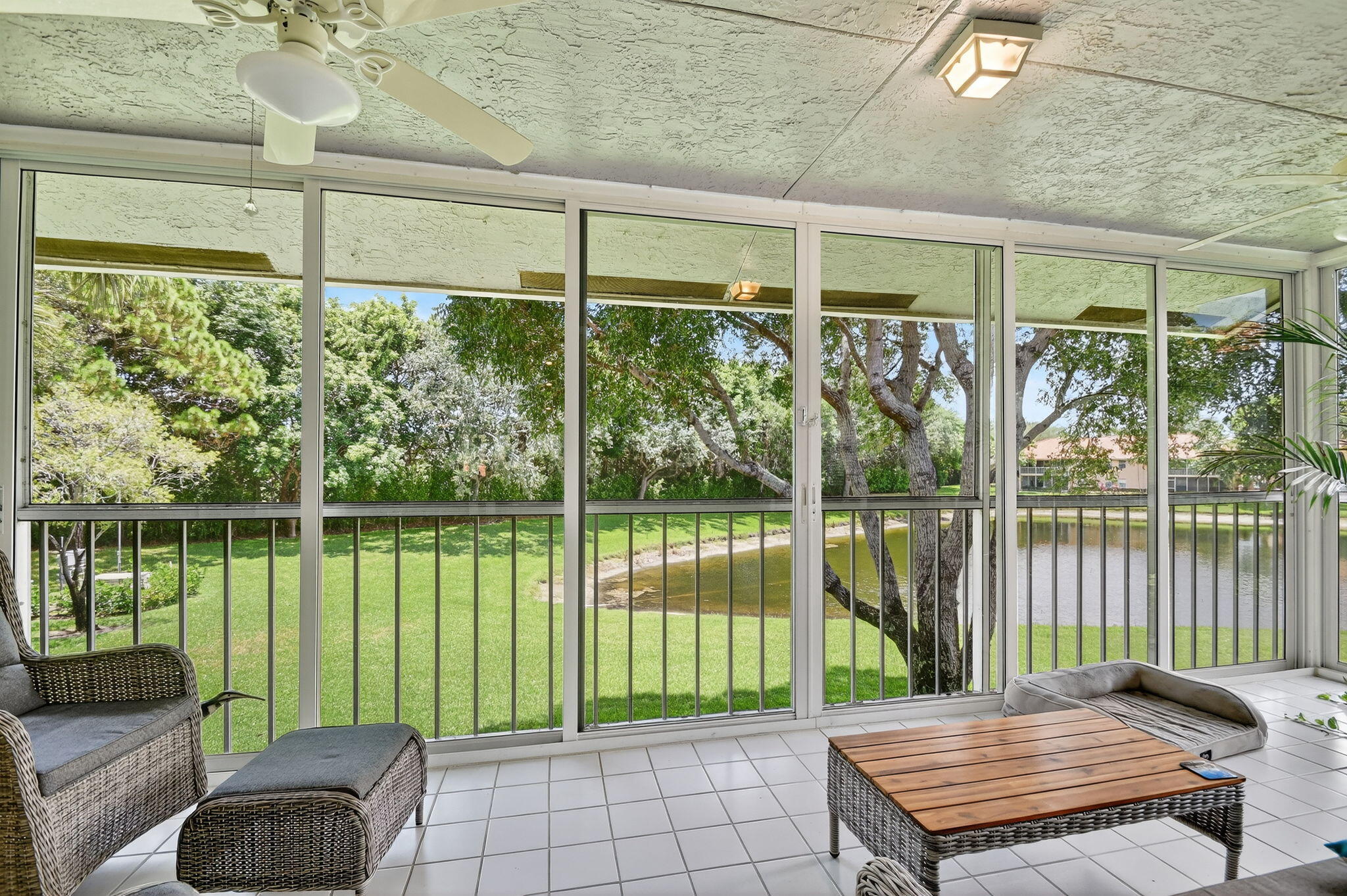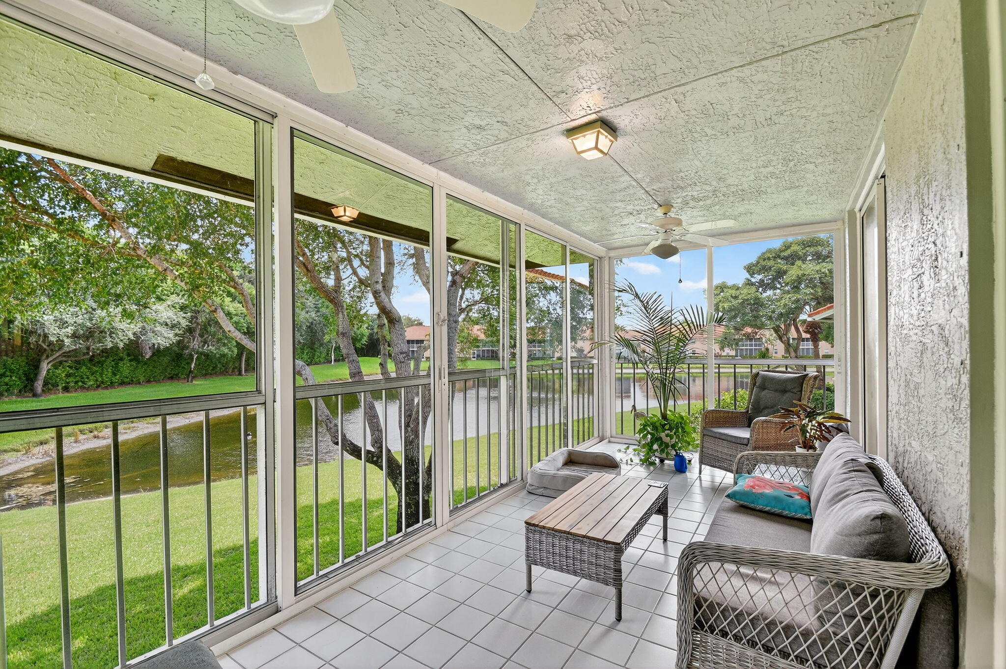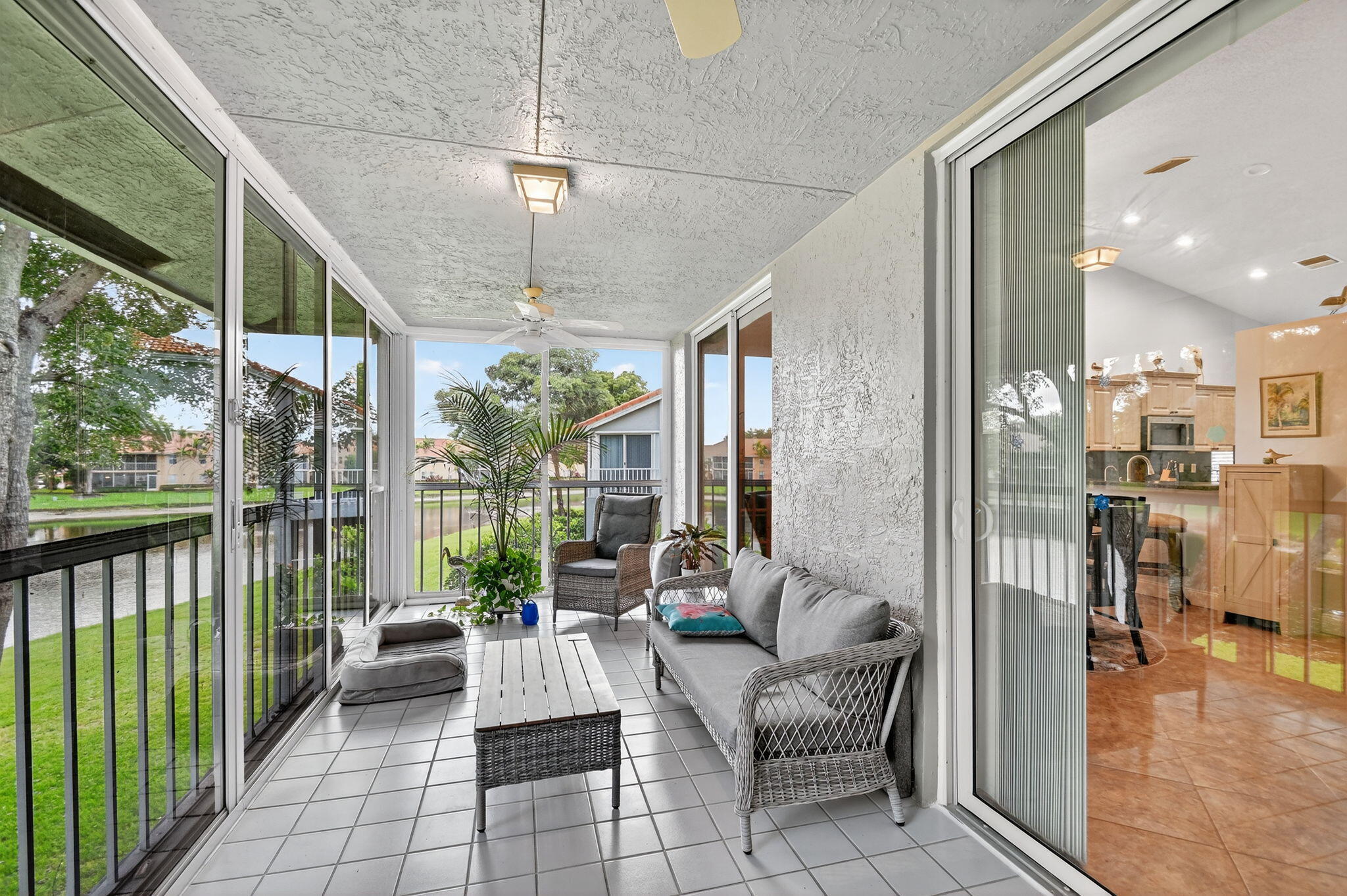 Come experience Florida living at its finest in this beautiful end unit with open floor plan and perfect, serene location with lake views. Home has new AC with new impact windows and sliders throughout. Spacious 3 bedroom, 2 bathroom with third bedroom being used as an office. The private, glassed in and screened, lania provides ample space for outdoor entertaining and relaxation while overlooking the lake. Eat in kitchen has all new stainless steel appliances and a reverse osmosis drinking water filtration system. Full washer and dryer in unit. . Guest bathtub replaced with beautifully tiled walk in shower with niche. Newly renovated club house will be opened soon and hosts loads of amenities. Open 7 days on-site cafe. Special assessments for completion of clubhouse all paid.