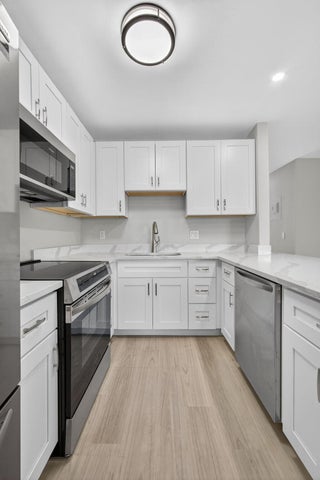 Stunning Fully Renovated Condo in Premier 55+ Community ~ Step into luxury with this beautifully renovated 2-bedroom, 1-bath condo showcasing high-end finishes throughout. From the moment you enter, you'll appreciate the sophisticated open design, featuring top-tier woodgrain plank laminate flooring that seamlessly flows through every room. The open-concept kitchen with separate dinette area is a showstopper, offering brand-new stainless steel appliances, custom cabinetry with gleaming quartz countertops, and a spacious island--perfect for entertaining or casual dining. The bathroom has designer tile with a modern vanity and light fixture. The open and airy layout is bathed in natural light, enhancing the serene, upscale atmosphere of the home. Located in one of the area's most desirable55+ communities, residents enjoy access to exceptional amenities including bus service, clubhouse, fitness center, resort-style pool, walking paths, and a vibrant calendar of social activities. This is truly turnkey living at its finestjust bring your suitcase and start enjoying the lifestyle you deserve. Don't miss your opportunity to own this gorgeous, move-in ready home in a community where luxury and leisure go hand in hand.
