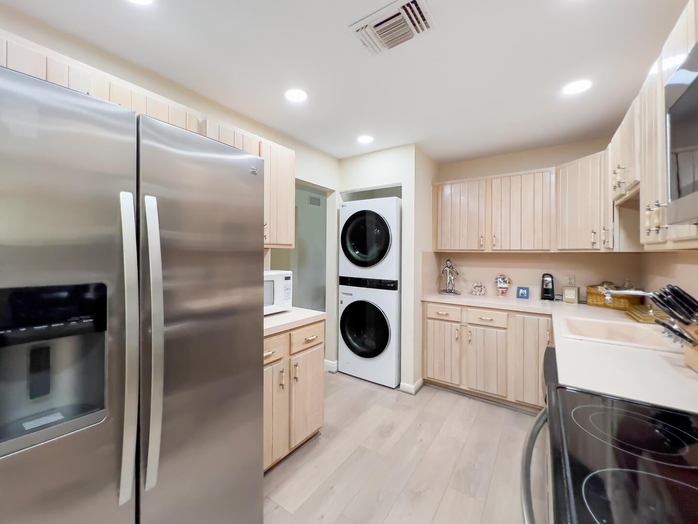Welcome to this inviting first-floor condo in the serene community of Hunters Run. This spacious residence features 2 bedrooms plus a versatile den, ideal for a home office or additional living space. Neutral 24-inch diagonal tile flooring enhances the open layout, while high-hat lighting brightens the modern kitchen--complete with abundant cabinetry, a pantry with pull-outs, and sleek stainless-steel appliances. A cozy breakfast nook provides the perfect spot for casual dining or your morning coffee. The primary suite is a true retreat, offering a large walk-in closet, a luxurious bath with a soaking tub, and a separate walk-in showerPractical touches include an LG washer and dryer, three linen closets, and a storage closet on the patio. Relax or entertain in the spacious screen-enclosed patio with tranquil views. Set within the sought-after Hunters Run Country Club, this home offers access to exceptional amenities, including community pools, tennis courts, and a clubhouse. Beyond your front door, Hunters Run delivers the ultimate country club lifestyle: 54 holes of championship golf, 30 tennis courts, a state-of-the-art fitness center, seven on-site restaurants, and more than 20 special interest clubs. With pristine beaches, fine dining, shopping, and cultural attractions just minutes away, Hunters Run is the perfect blend of comfort, convenience, and endless opportunity.