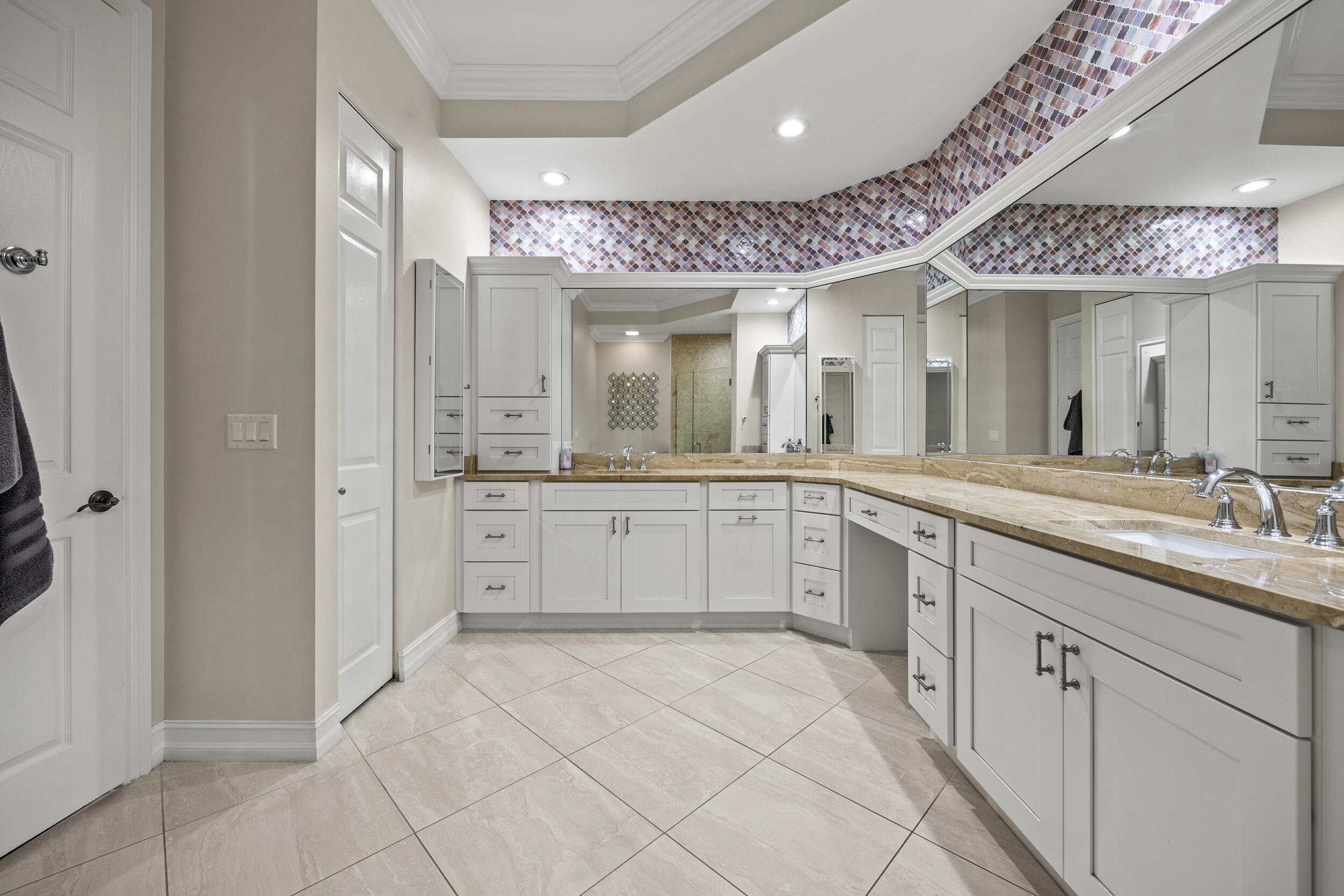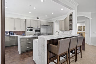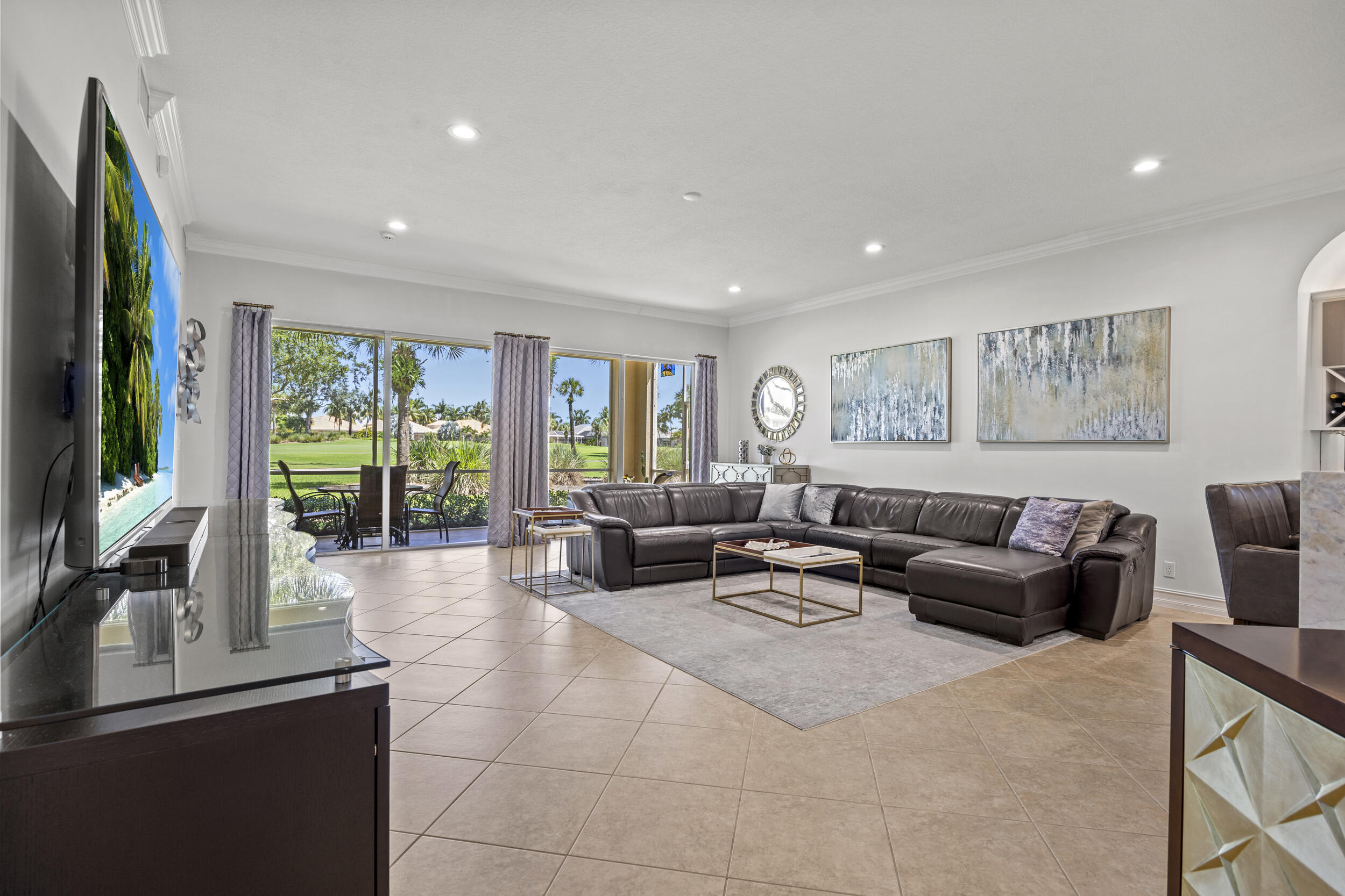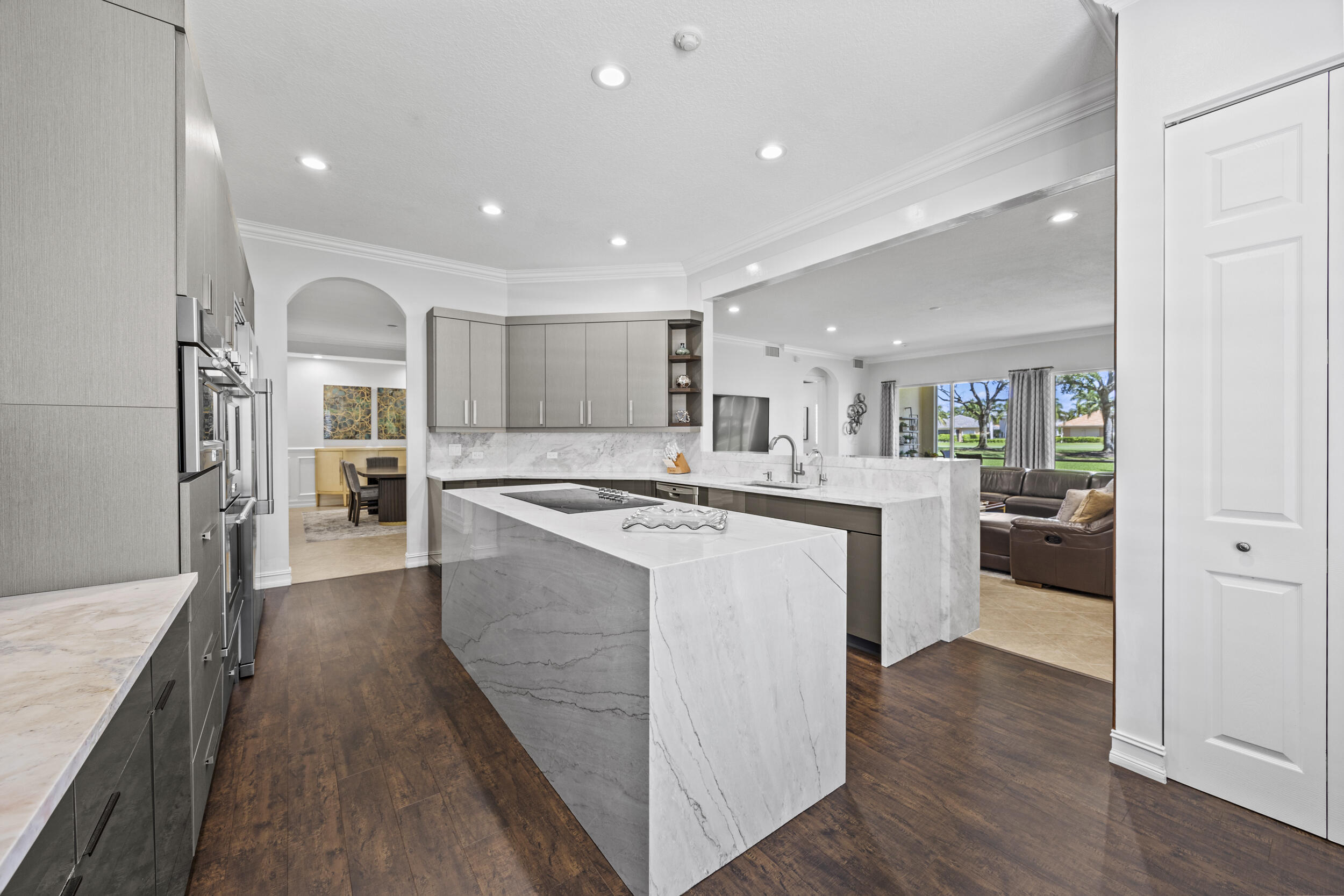 Spectacular golf course view and a fully renovated custom kitchen make this first-floor luxury condo with impact windows a special find. With nearly 2,400 square feet of living space, this 2BR/2BA + DEN home is a must see. Recent renovations include a redesigned kitchen which enhances the great room concept, flow and functionality of the entire space. Luxurious quartzite countertops, Frigidaire Professional appliances, undercabinet lighting, coffee bar and reverse osmosis system are just a few of the things that make this contemporary kitchen a chef's dream. The beautiful and functional dry bar compliments the large open living space, as does the well-appointed dining room. Gorgeous wainscoting, crown molding, millwork, and bright white plantation shutters throughout. Much desired woodfloors have been added to all bedrooms, closets, and den. The primary bedroom is generously sized and has dual walk-in closets while updates to the ensuite bath include: marble countertops, updated vanities, flooring, plumbing fixtures, and frameless shower. Newer LED recessed lighting and ample natural light create a bright and inviting space. The screened patio is a perfect spot for dining or relaxing while taking in the views of the Tradition golf course. The Club at Ibis is an award-winning community that boasts 3 Nicklaus-designed golf courses, 20-acre practice facility, 16 tennis courts, 7 pickle ball courts, 4+ restaurants, fitness center with spa/salon, resort style pool and lap pool. 24-hour gated security and impeccably landscaped grounds. Come enjoy the Florida lifestyle and call 10383 Orchid Reserve your home!