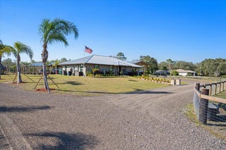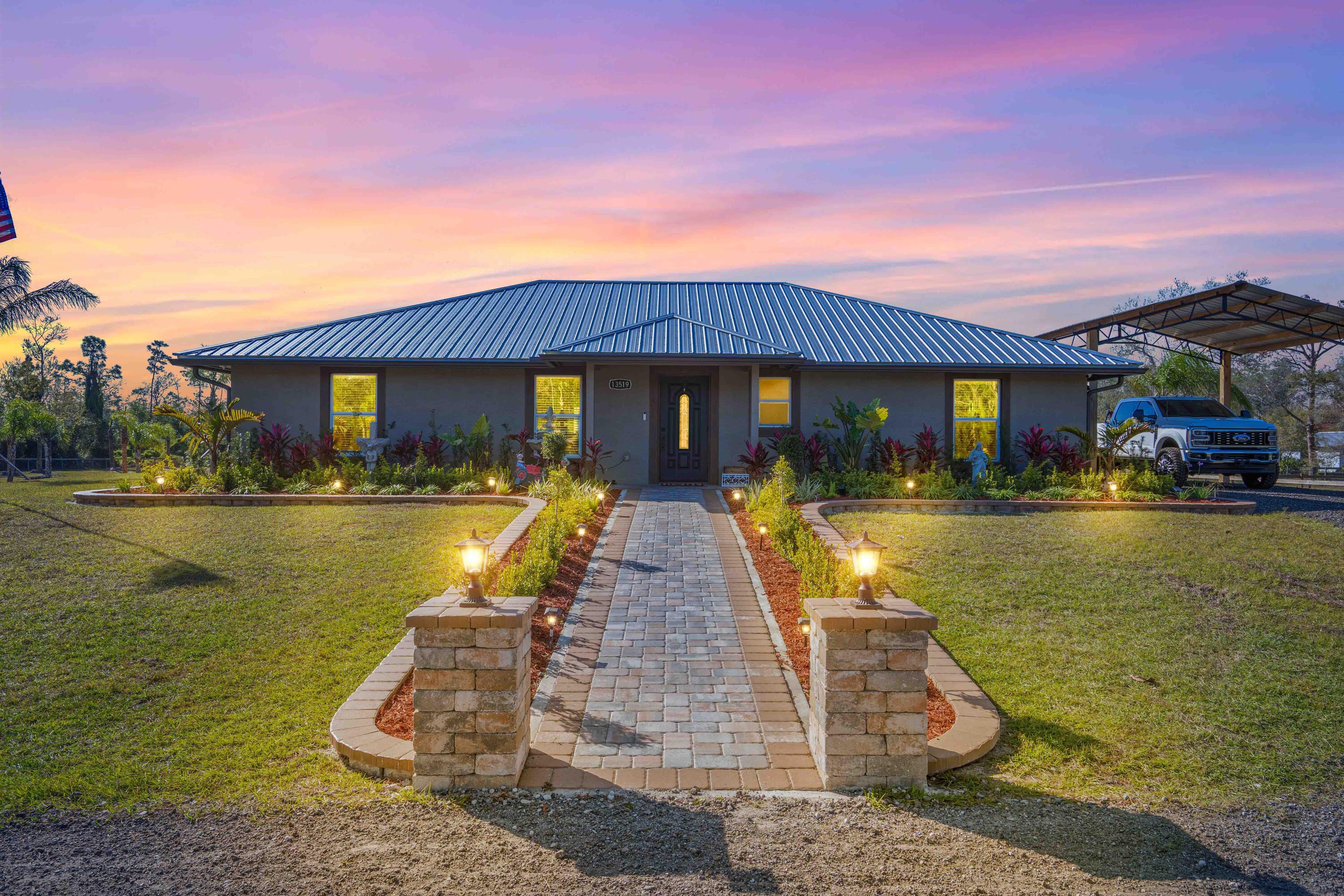 WELCOME TO COUNTRY LIVING PARADISE! Anything and everything you could want, this property has it! Welcome to this CUSTOM 2022 built Modern-Farmhouse home on 4.73 acres. Featuring 3 large bedrooms, 3 luxury bathrooms with walk-in tiled showers and glass doors. Custom doors and trim work (all burned & sealed). Chef's kitchen has granite countertops, a Forno SS 8 burner gas stove, Commercial exhaust hood, pot filler, dual-ovens, & custom wood cabinets. Wood plank tile flooring, IMPACT windows/doors, color matched gutters, tankless water heater, AND upgraded security and fire alarms. Custom TIKI HUT with DOCK on the POND, which is treated and stocked with FISH! 2024 built 40x100 & 20x30 pole barns. Fresh milling driveway, fenced & cross fenced for animals, double automatic gated entry!!