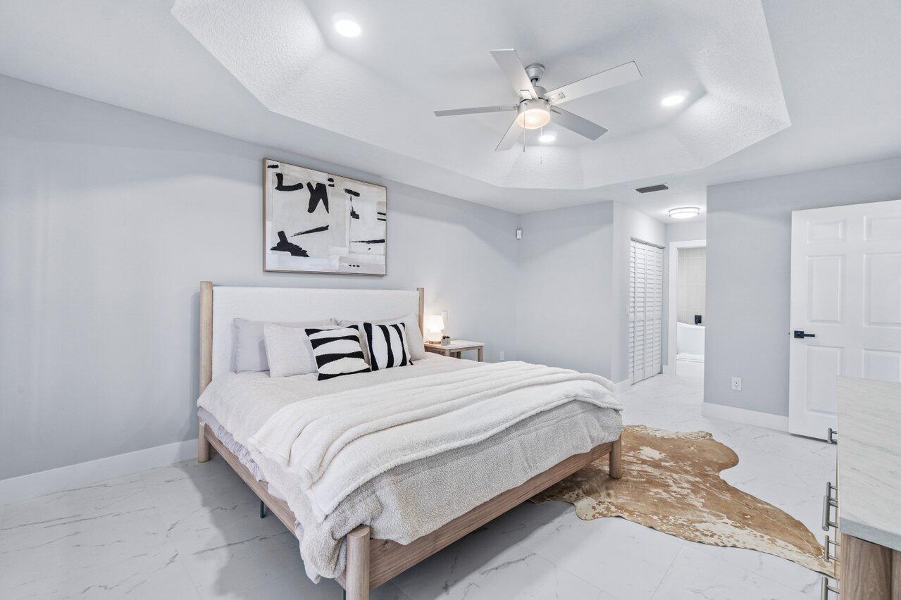 Welcome to your dream home in the picturesque Valencia Lakes! This BEAUTIFULLY RENOVATED 3-bedroom, 2-bathroom residence offers unparalleled lake views, arguable the best in the community. NEW 2025 AC. Step inside to an open floor plan adorned with exquisite marble-style porcelain flooring that seamlessly flows throughout all living spaces. Chef's kitchen, featuring brand new Samsung stainless steel appliances, kitchen island, ample storage, and sleek recessed & pendant lighting. It's the perfect space for culinary creations and entertaining guests. Retreat to the luxurious primary suite, where relaxation awaits. Indulge in the separate soaking tub or the walk-in shower, complemented by his and hers vanities, offering both convenience and elegance.