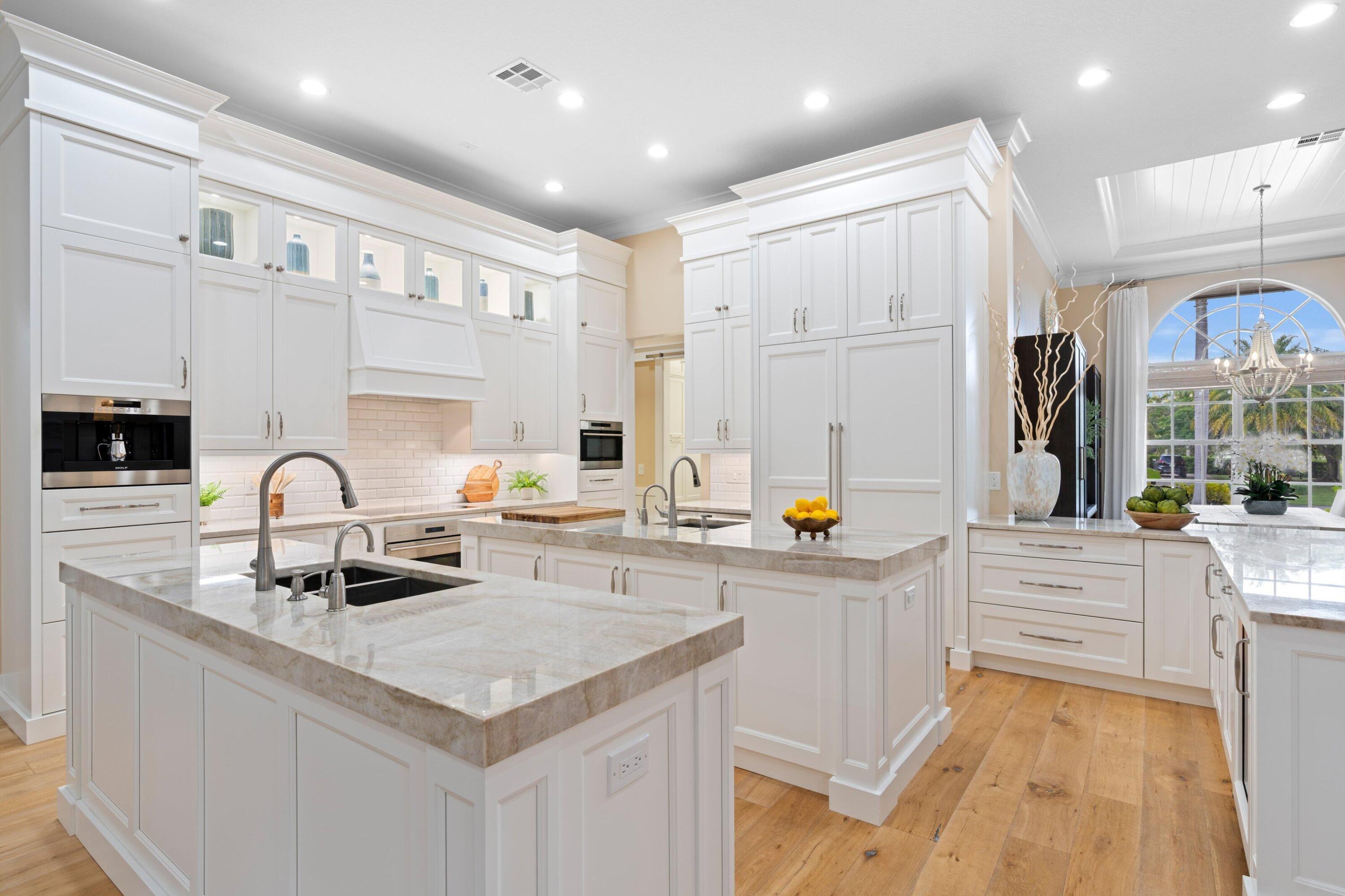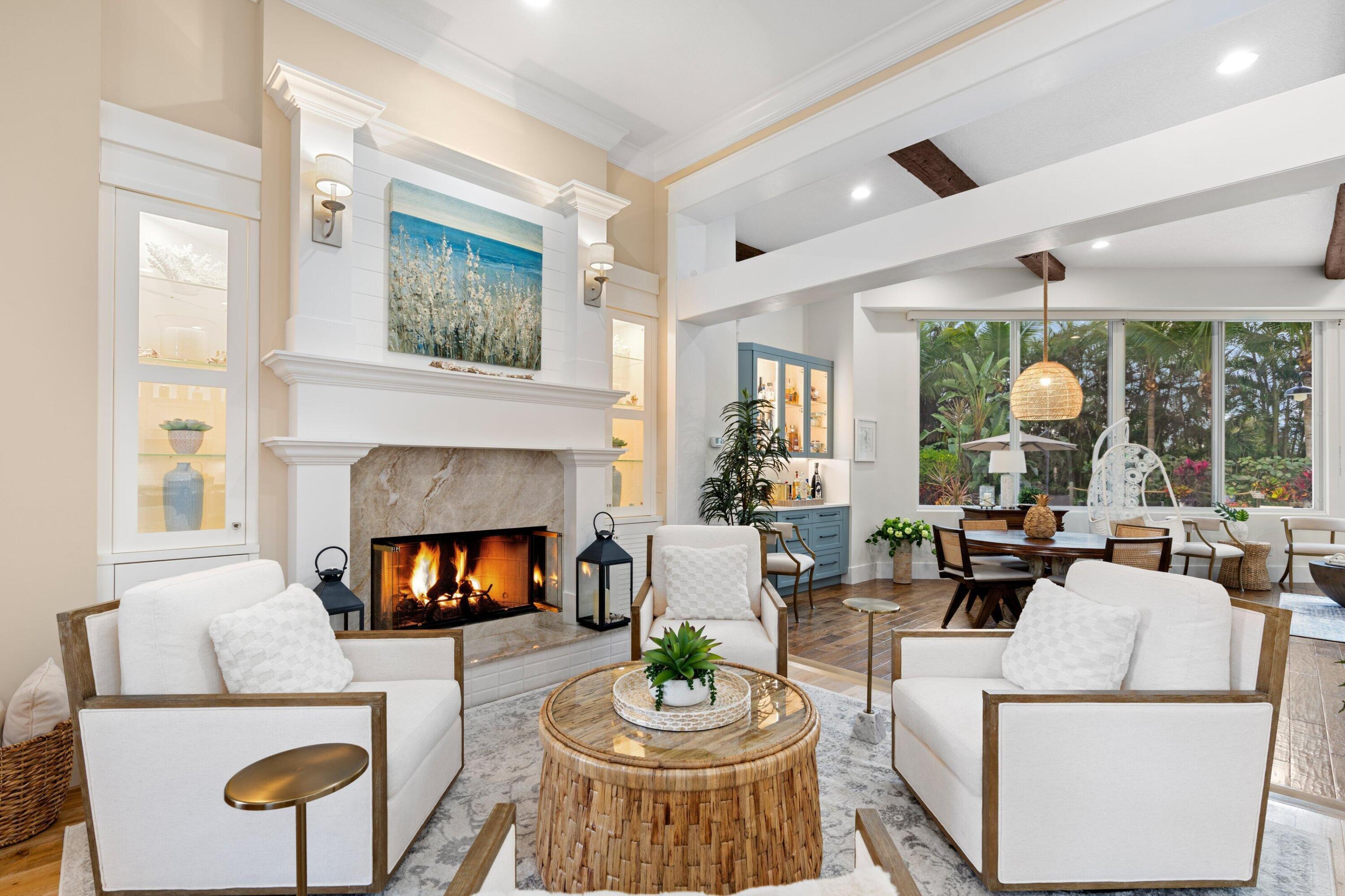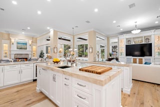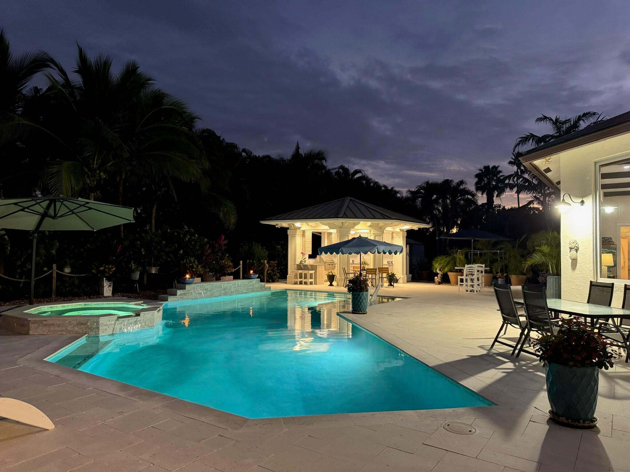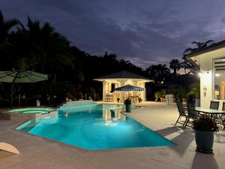 An exceptional custom estate in the prestigious 24/7 guard-gated community of Rio Poco, has 4,344 square feet of interior living space plus an 885 square foot three-car garage on a full acre. Designed for both luxury and family comfort, the home features 4 spacious bedrooms plus a dedicated office. The gourmet kitchen showcases custom cabinetry along with Wolf, Sub-Zero, and Cove appliances, complemented by Taj Mahal quartzite countertops to create a refined space for cooking and entertaining. Expansive living areas flow seamlessly across hardwood floors, highlighted by a built-in bar and a cozy gas fireplace that invite gatherings of family and friends. Outdoors, a resort-style heated saltwater pool and spa with sun shelf is surrounded by lush tropical landscaping.