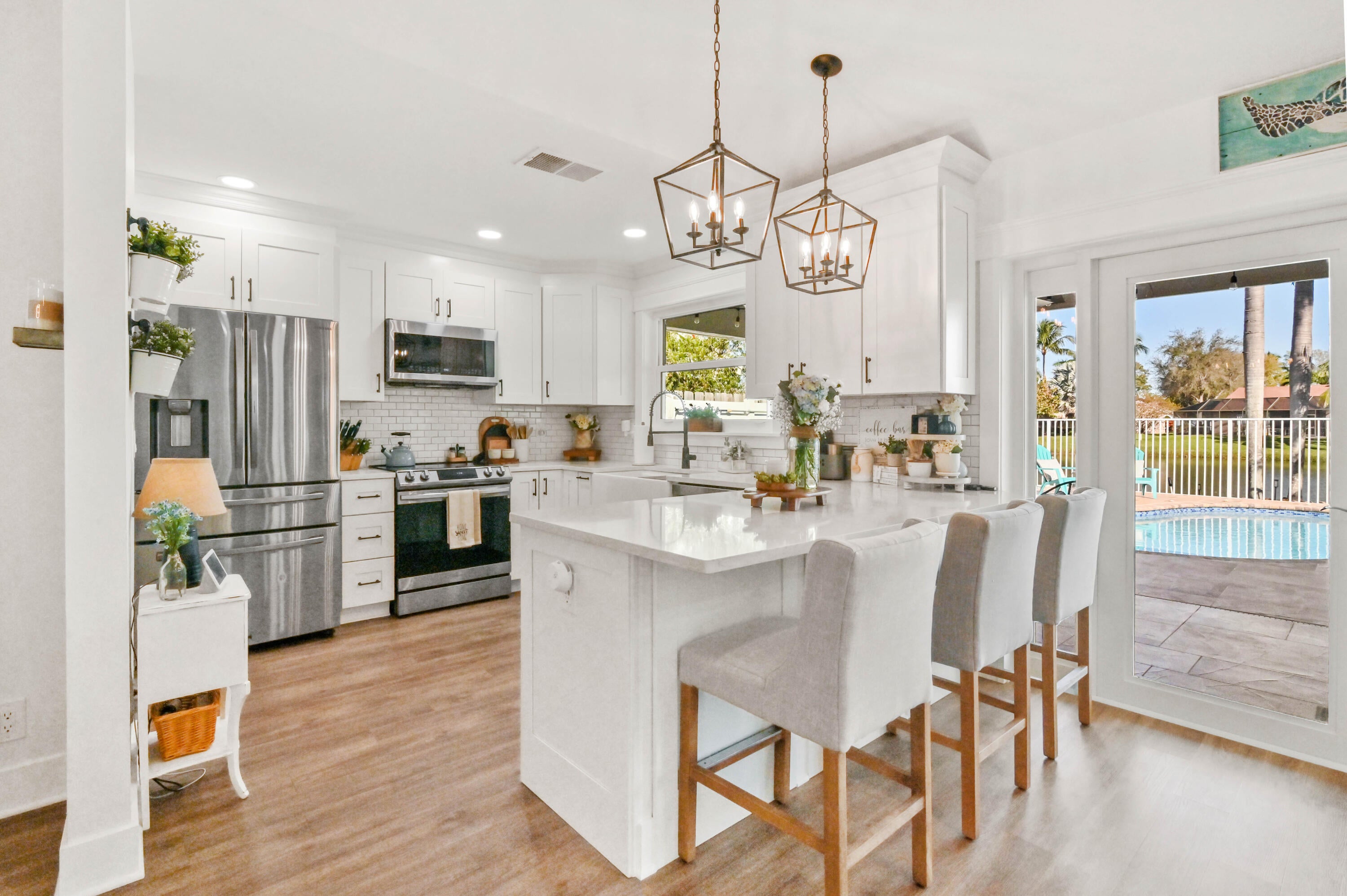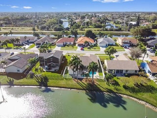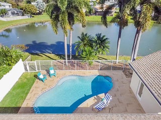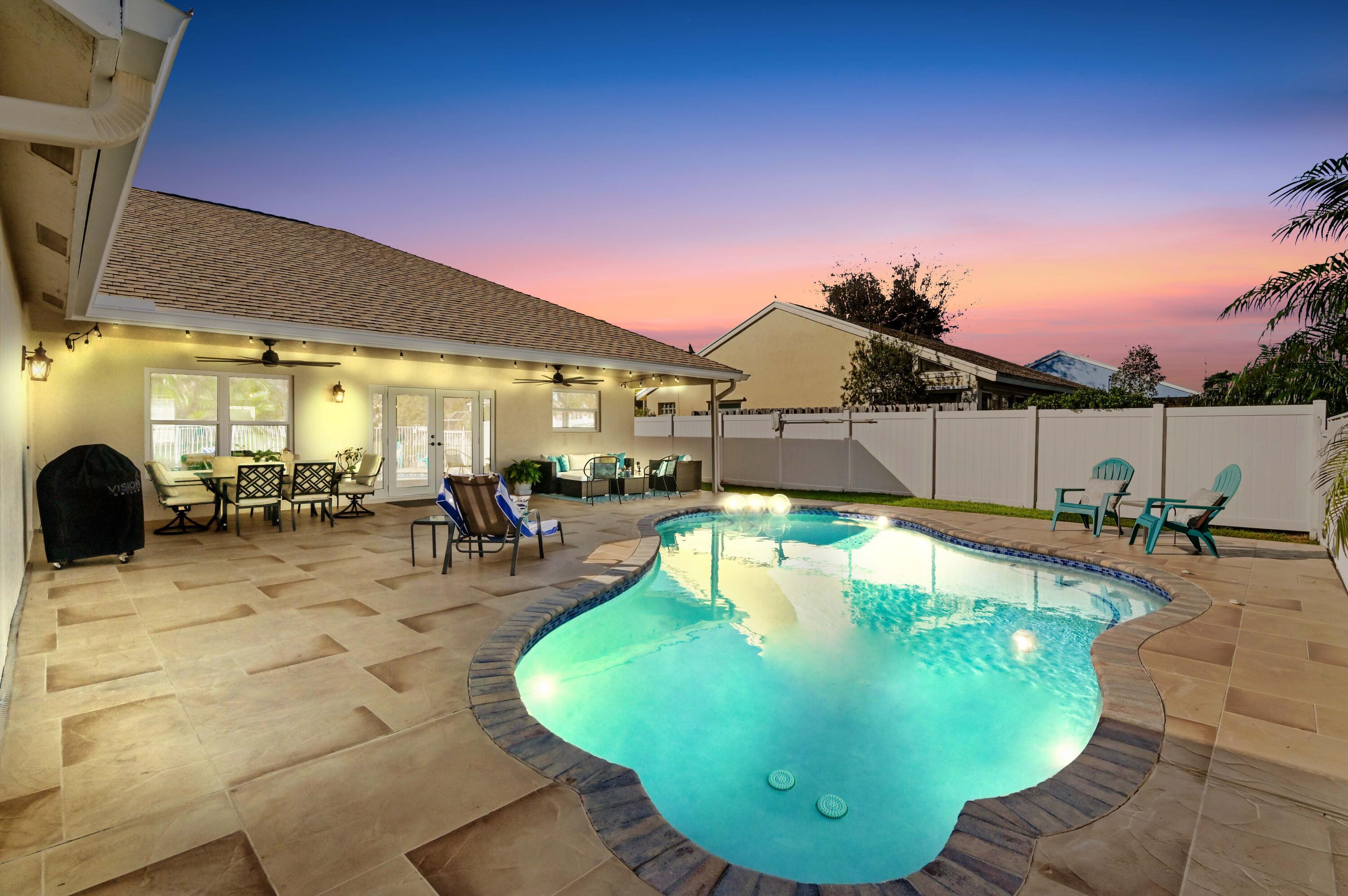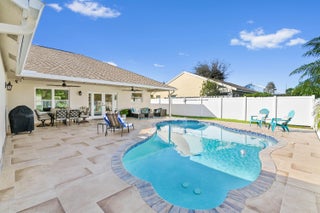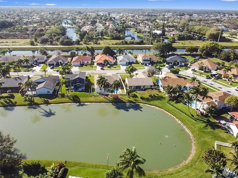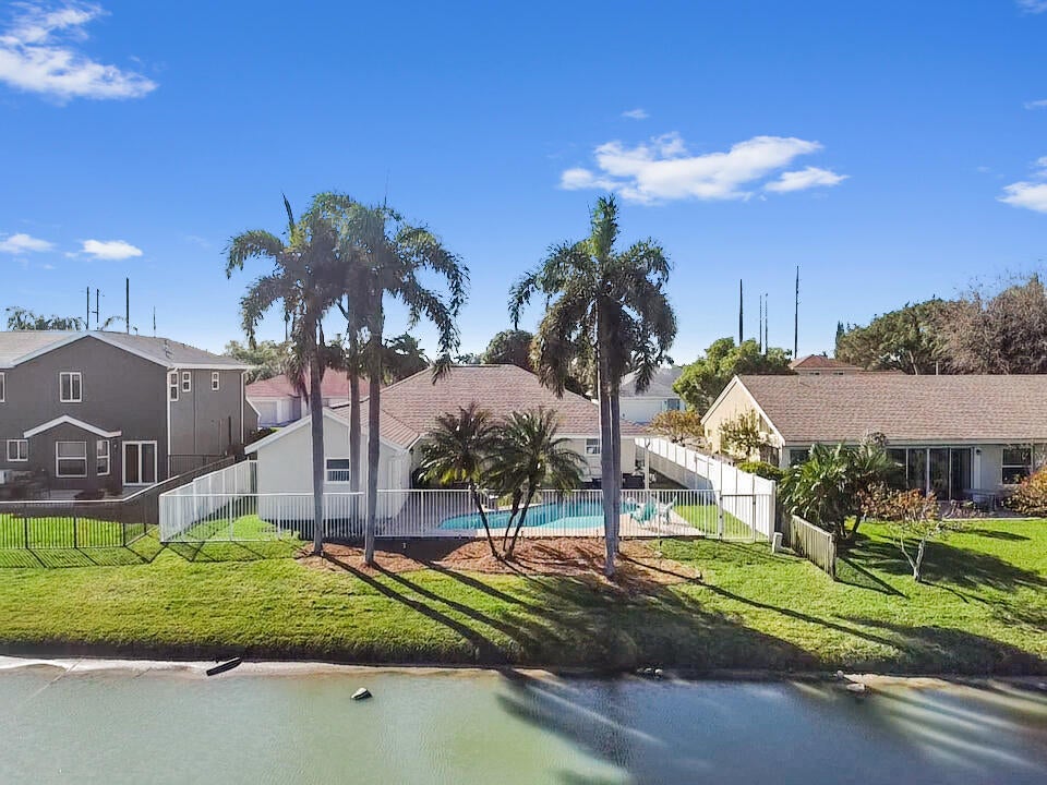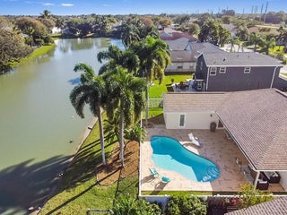 Welcome to this meticulously maintained 4-bedroom, 2-bath waterfront haven with a private pool, nestled in a serene setting with a fenced rear yard and breathtaking lake views. Step inside this true 4-bedroom gem, where an immaculate open floor plan unfolds seamlessly, offering a family room, living room, and formal dining area. The kitchen, adorned with modern appliances and quartz countertops boasts generous counter space, and a spacious pantry, ensuring culinary delights in a stylish setting. This beautiful home also features luxury vinyl flooring throughout, vaulted ceilings with a wood beam, custom trim around doors, and a full size washer and dryer.The masterfully designed home features a tub in the guest bath and a shower with frameless doors in the master bath, enhancing the luxurious appeal. The water view captivates from the salt water pool and expansive covered lanai with 72 inch fans, providing an idyllic spot to unwind. Impact doors and windows throughout and master suite open to the pool/patio, creating a seamless indoor-outdoor living experience. Practicality meets style with a large 2-car garage and a separate laundry room. Enjoy the ease of living with low HOA fees, making this delightful residence even more appealing. This property is available for viewings by appointment only. Conveniently located just minutes away from upscale shopping, dining, and entertainment options, this home is situated in a meticulously maintained community to enhance your lifestyle. Experience the perfect blend of comfort, elegance, and convenience in this remarkable home - schedule your appointment today!
