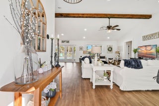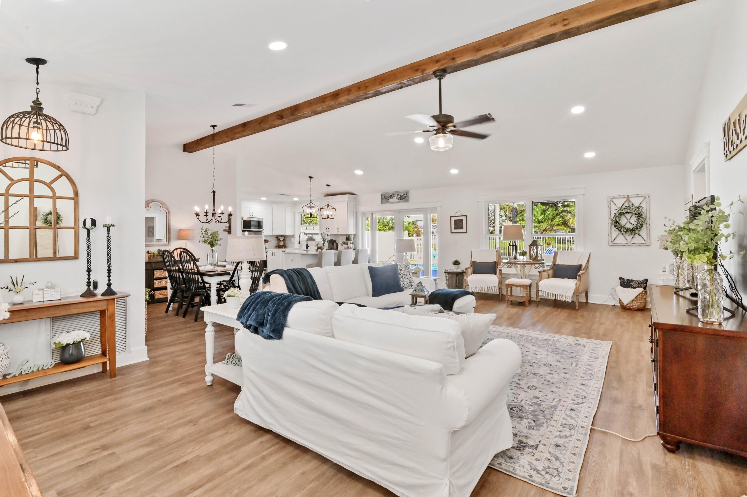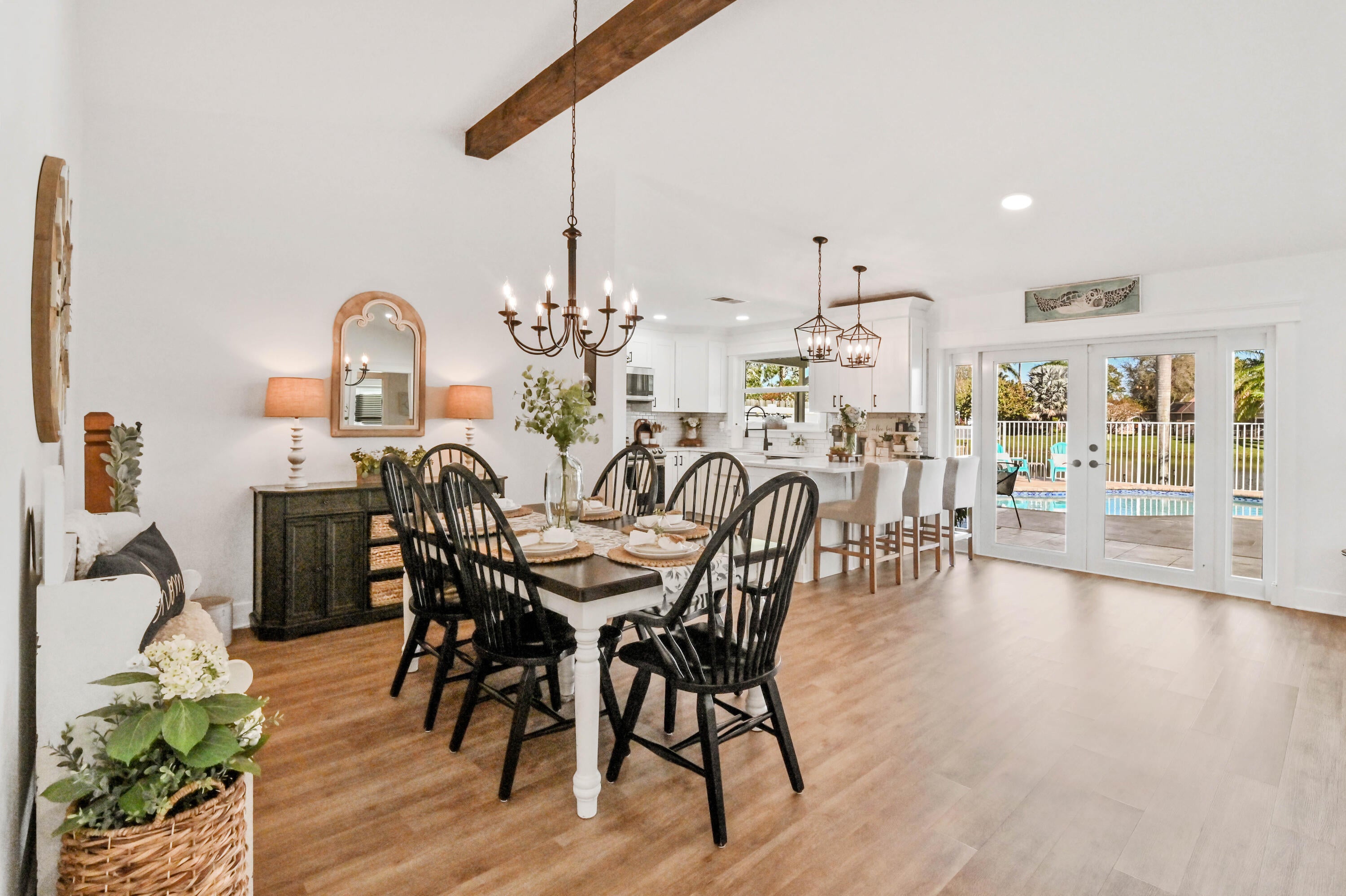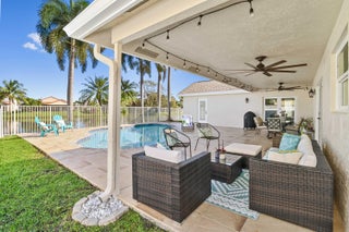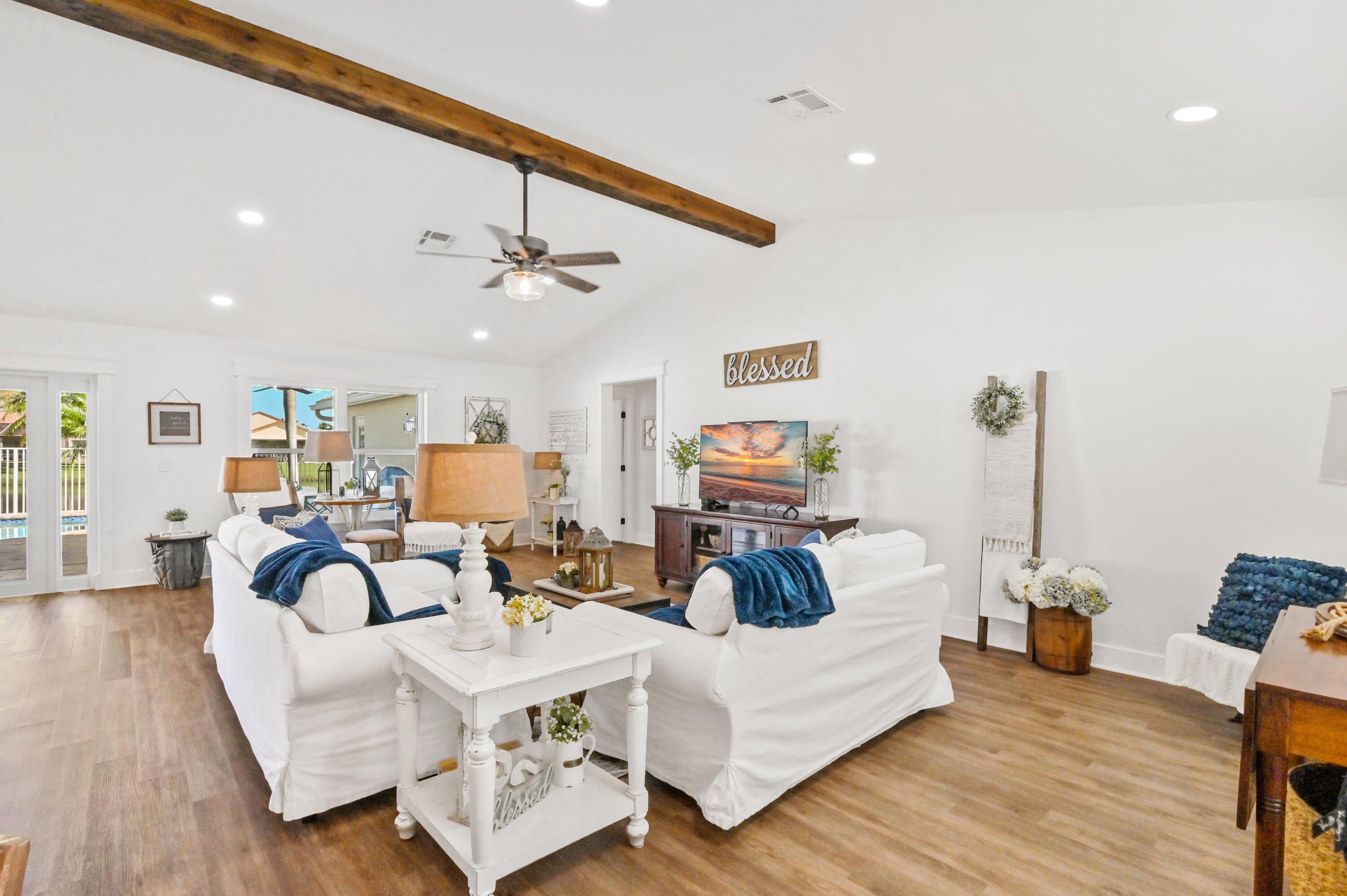 Welcome to this meticulously maintained 4-bedroom, 2-bath waterfront haven with a private pool, nestled in a serene setting with a fenced rear yard and breathtaking lake views. Step inside this true 4-bedroom gem, where an immaculate open floor plan unfolds seamlessly, offering a family room, living room, and formal dining area. The kitchen, adorned with modern appliances and quartz countertops boasts generous counter space, and a spacious pantry, ensuring culinary delights in a stylish setting. This beautiful home also features luxury vinyl flooring throughout, vaulted ceilings with a wood beam, custom trim around doors, and a full size washer and dryer.The masterfully designed home features a tub in the guest bath and a shower with frameless doors in the master bath, enhancing the luxurious appeal. The water view captivates from the salt water pool and expansive covered lanai with 72 inch fans, providing an idyllic spot to unwind. Impact doors and windows throughout and master suite open to the pool/patio, creating a seamless indoor-outdoor living experience. Practicality meets style with a large 2-car garage and a separate laundry room. Enjoy the ease of living with low HOA fees, making this delightful residence even more appealing. This property is available for viewings by appointment only. Conveniently located just minutes away from upscale shopping, dining, and entertainment options, this home is situated in a meticulously maintained community to enhance your lifestyle. Experience the perfect blend of comfort, elegance, and convenience in this remarkable home - schedule your appointment today!