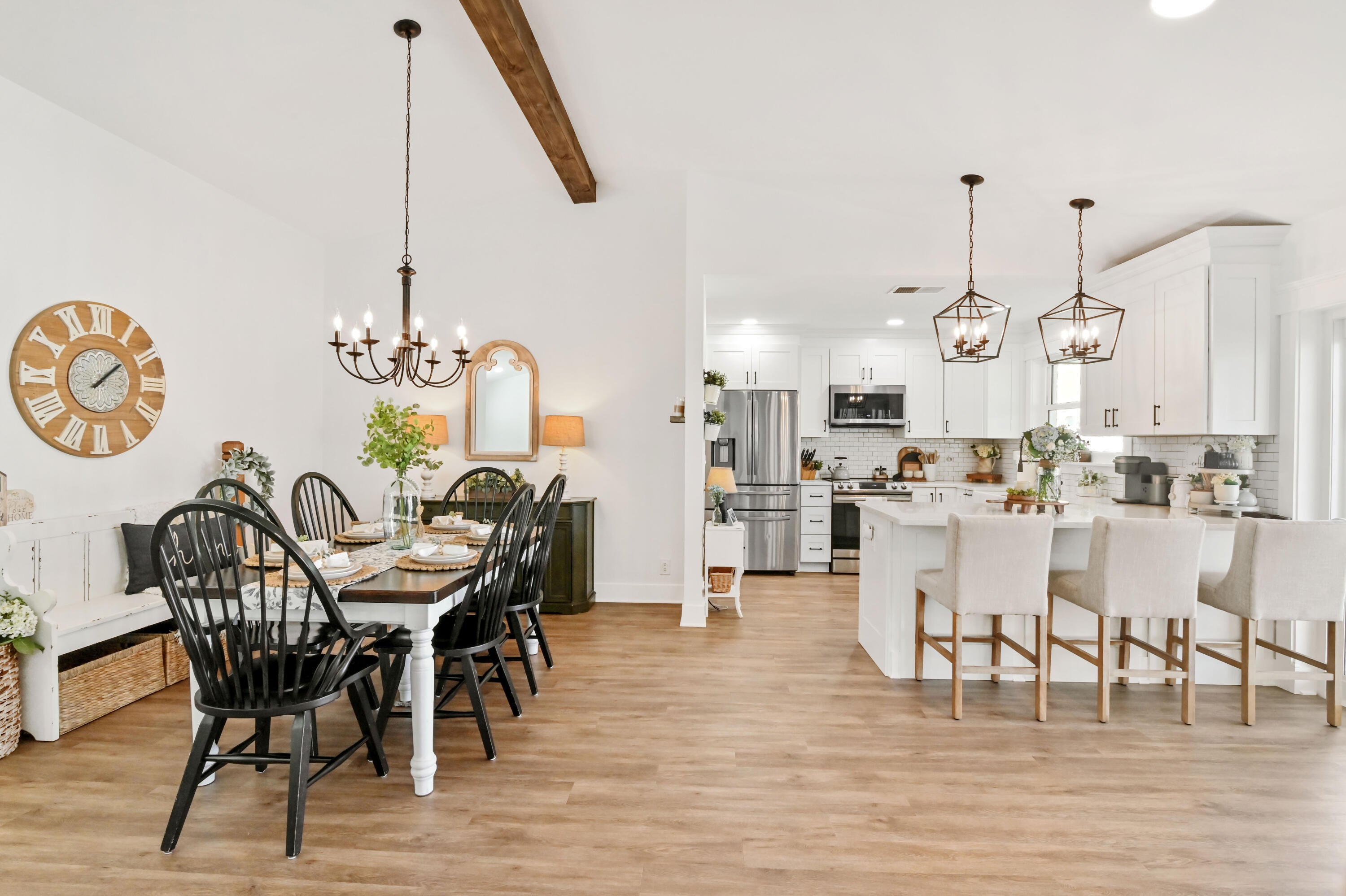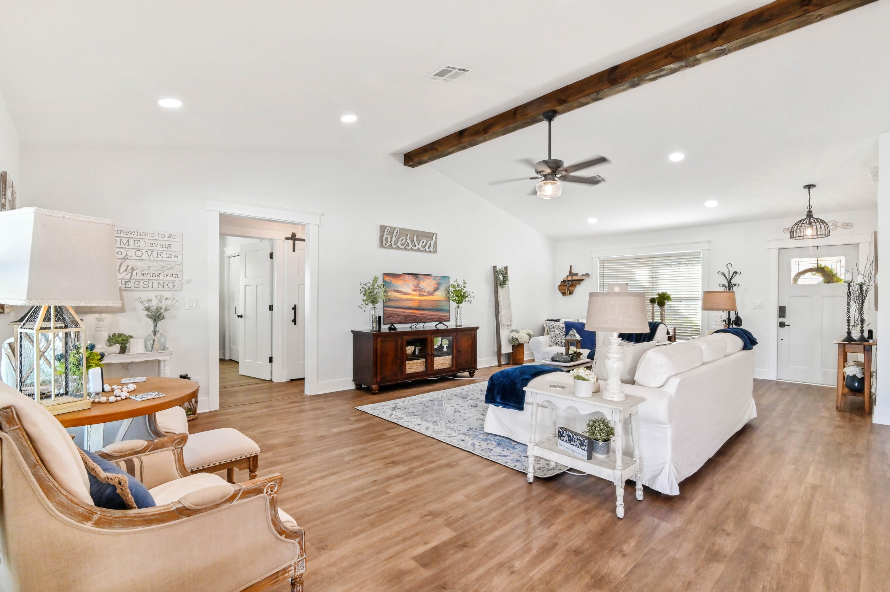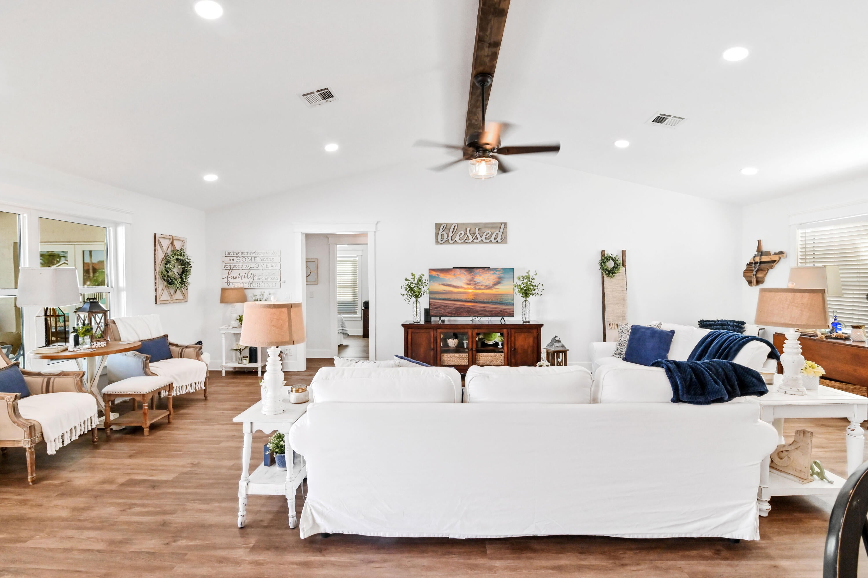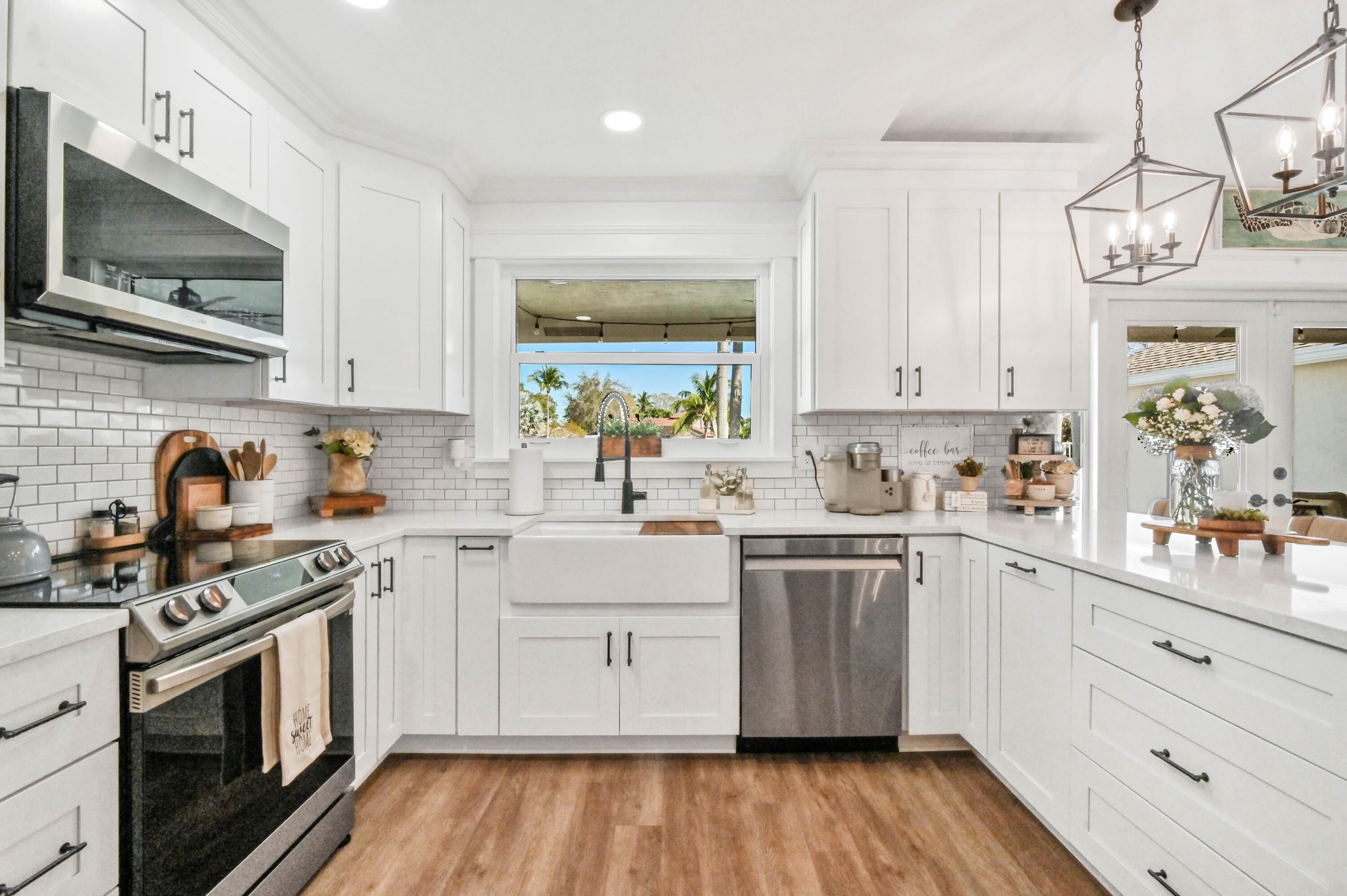 Welcome to this meticulously maintained 4-bedroom, 2-bath waterfront haven with a private pool, nestled in a serene setting with a fenced rear yard and breathtaking lake views. Step inside this true 4-bedroom gem, where an immaculate open floor plan unfolds seamlessly, offering a family room, living room, and formal dining area. The kitchen, adorned with modern appliances and quartz countertops boasts generous counter space, and a spacious pantry, ensuring culinary delights in a stylish setting. This beautiful home also features luxury vinyl flooring throughout, vaulted ceilings with a wood beam, custom trim around doors, and a full size washer and dryer.The masterfully designed home features a tub in the guest bath and a shower with frameless doors in the master bath, enhancing the luxurious appeal. The water view captivates from the salt water pool and expansive covered lanai with 72 inch fans, providing an idyllic spot to unwind. Impact doors and windows throughout and master suite open to the pool/patio, creating a seamless indoor-outdoor living experience. Practicality meets style with a large 2-car garage and a separate laundry room. Enjoy the ease of living with low HOA fees, making this delightful residence even more appealing. This property is available for viewings by appointment only. Conveniently located just minutes away from upscale shopping, dining, and entertainment options, this home is situated in a meticulously maintained community to enhance your lifestyle. Experience the perfect blend of comfort, elegance, and convenience in this remarkable home - schedule your appointment today!