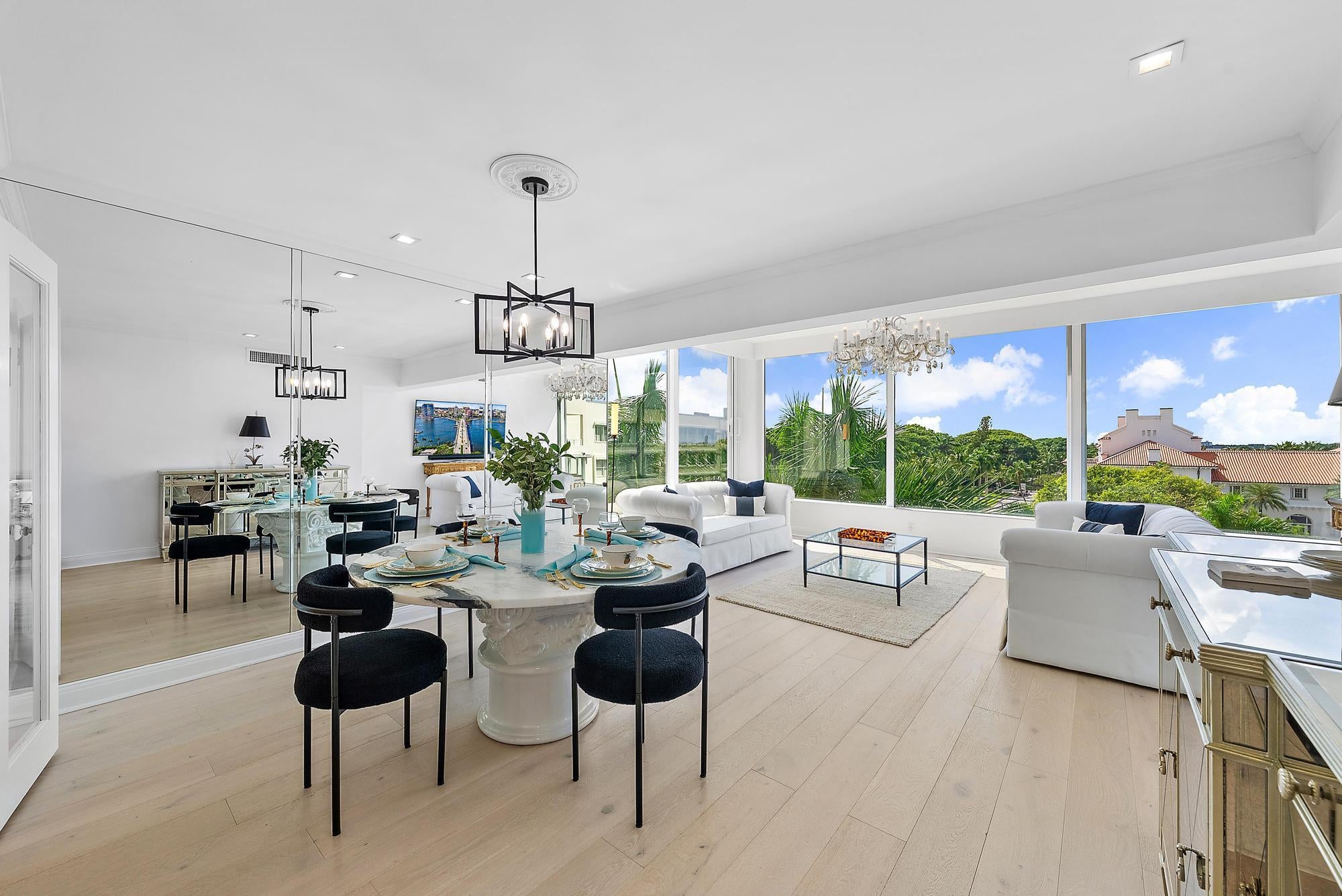 Modern and stylish renovated turnkey/furnished two bedroom two bath residence in the center of Palm Beach, minutes to Publix, beach, bike path, a half dozen world class restaurants, the new Glazer Hall theater, The Royal Poinciana Plaza and more! New roof and all new refurbished elevators in process. Lobby and common areas just renovated. Apartment includes custom wood closets and carpentry, top of the line appliances, double ovens, spa bath, full size washer/dryer, impact windows, glass and hardwood floors, filtered AC, electronic blinds in all rooms and Victoria and Albert clawfoot soaking tub. Fifth floor huge windows provide beautiful bright southern open views over the Flagler Museum, Breakers Golf Course and a peak at the Intracoastal. One assigned parking space close by.The Palm Beach Towers is a full service building with significant reserves and no current assessments. Glorious pool, gym, tailor, beauty salon and Salute, sister of Bice Ristorante, ready to provide room and pool service, located on Terrace level in building!