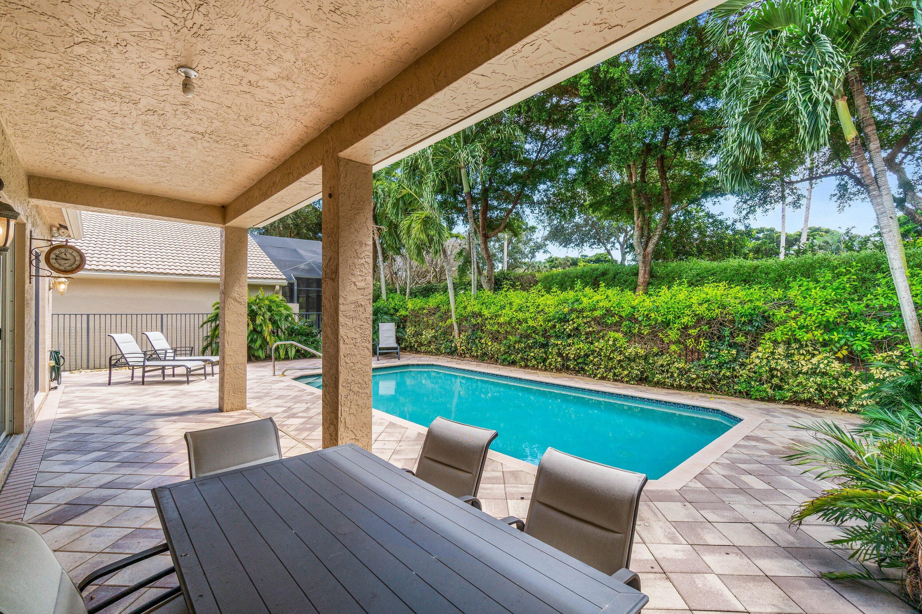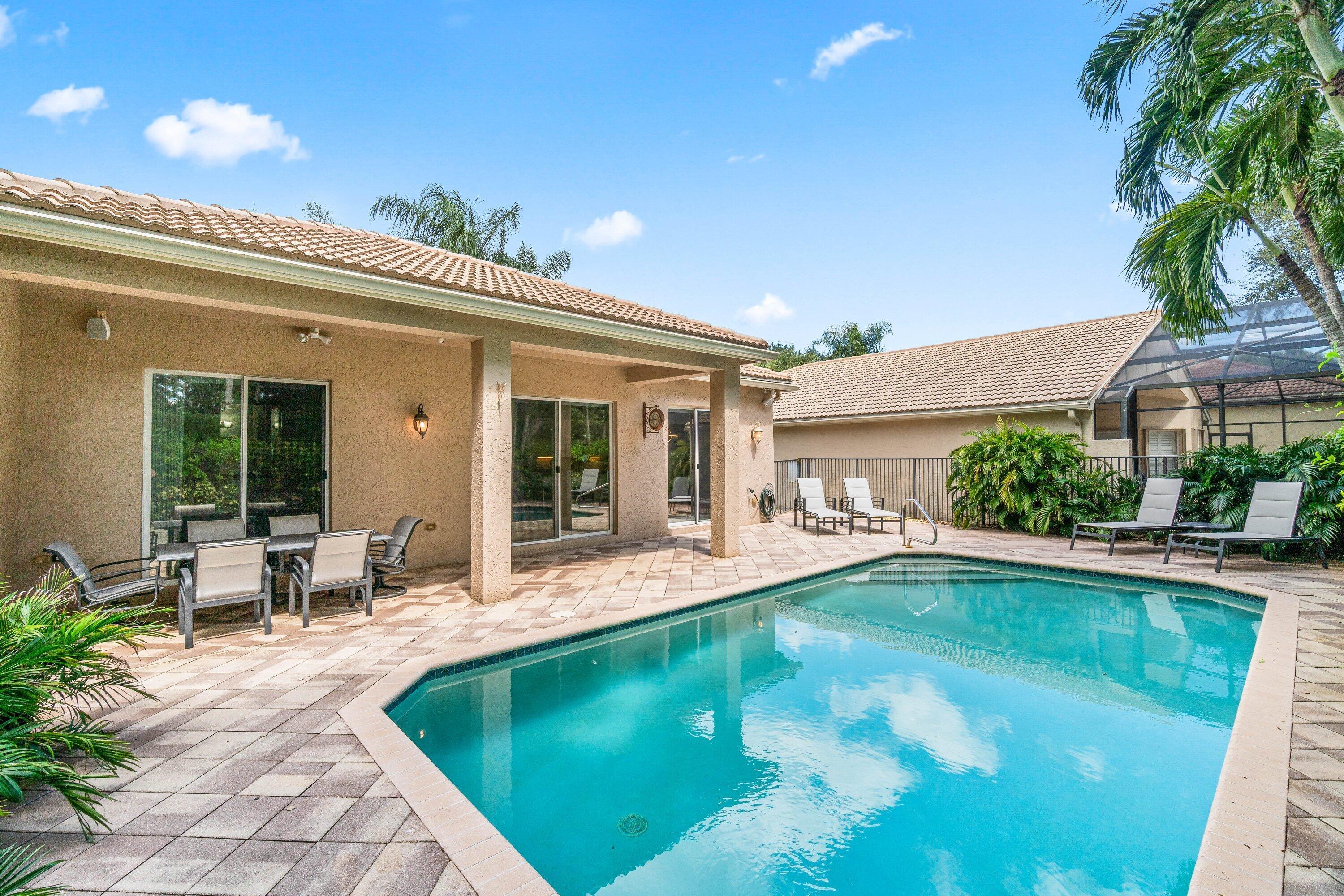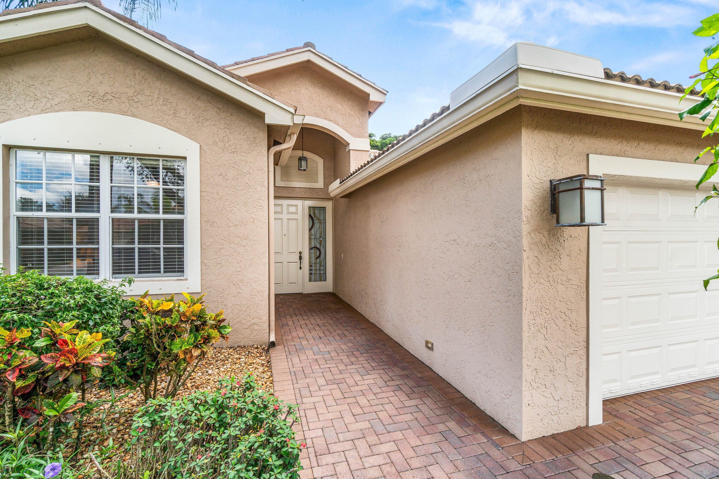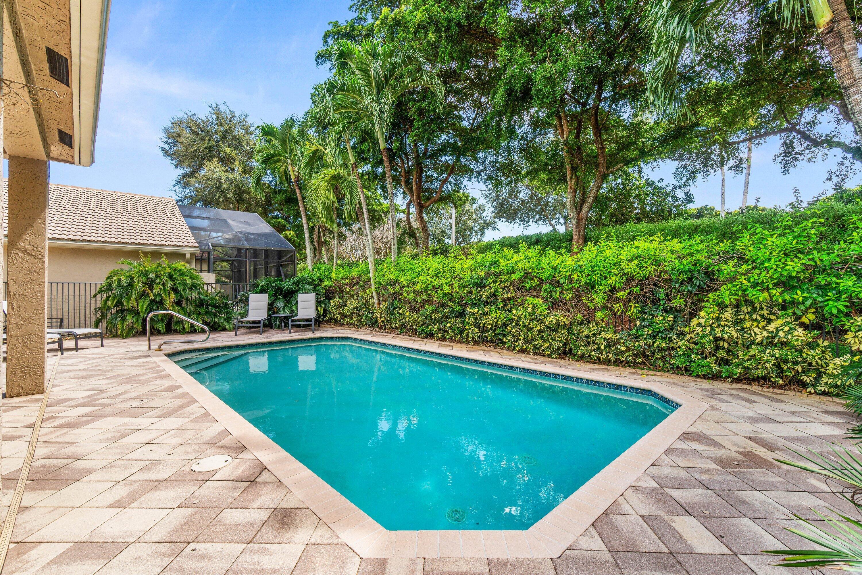 Lovely Catherine model features 2 bedrooms, 2 baths and a fenced in pool surrounded by landscaping providing beauty and privacy. Upgrade highlights include neutral tile on a diagonal throughout (no carpet), Carrier AC and water heater installed in 2020, tons of kitchen and bath upgrades such as glass door shower enclosures with tile to ceiling, a beautiful custom barn door at closet/bathroom entry in Primary bedroom, upgraded lighting, fan fixtures and hi hats throughout, newer washer and dryer, upgraded patio and pool deck pavers installed on a diagonal, widened walkway pavers with no front step, gutters and more!