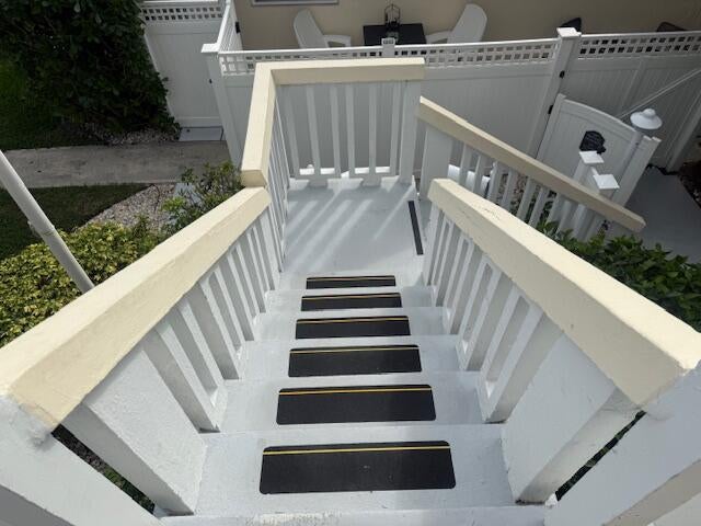 Second floor unit. Two master suites. Granite countertops and stainless appliances. Tile flooring throughout. Water included. Open front balcony. Laundry in the back of the building. One spot in the carport. There is also street parking. Cameras for security around the building. The fenced patio has an umbrella, patio table and chairs, 2 lounge chairs and a BBQ Pit. A couple blocks from the water and the park!