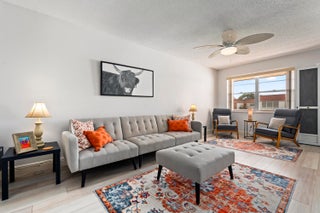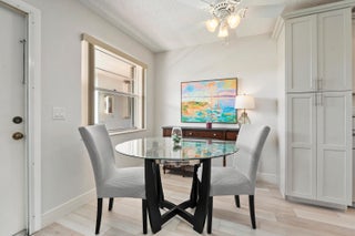 Partially furnished 1Bed 1.5Bath bright and airy end unit. Stunning remodeled kitchen featuring solid Wood 36'' Gray shaker cabinets, built in pantry, 3cm Granite Counters, high hat lighting, under cabinet lighting, glass accent doors, wine rack, white Whirlpool & Samsung appliance package. Recent upgrades include laminate & tile floors, hardwired Hunter ceiling fans, 6'' baseboards, decor electrical switches, lighting, screened front door, new toilets. Impact Sliding Glass door to glass enclosed screen patio with storage. Accordion Hurricane Shutters, Roof 2023, A/C 2022, newer screens & water heater. Great location just a short walk to community club house with Pool, Dance Hall, Library, Gym, Shuffleboard & workshop. Close to shopping, restaurants, and beaches. No pets or Pick-up trucks.