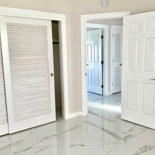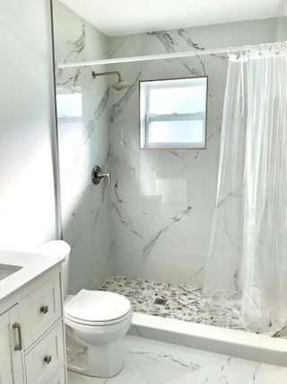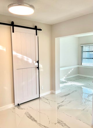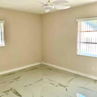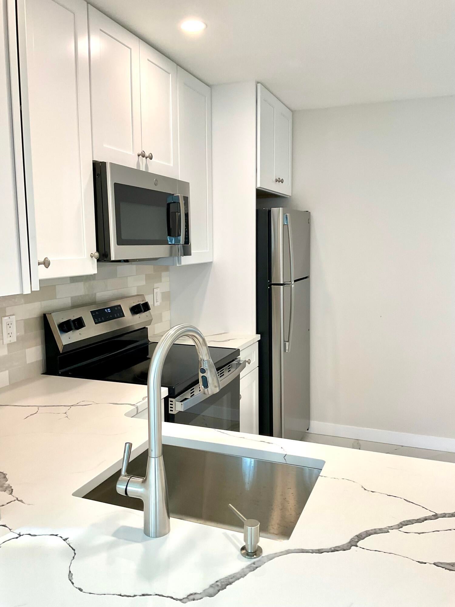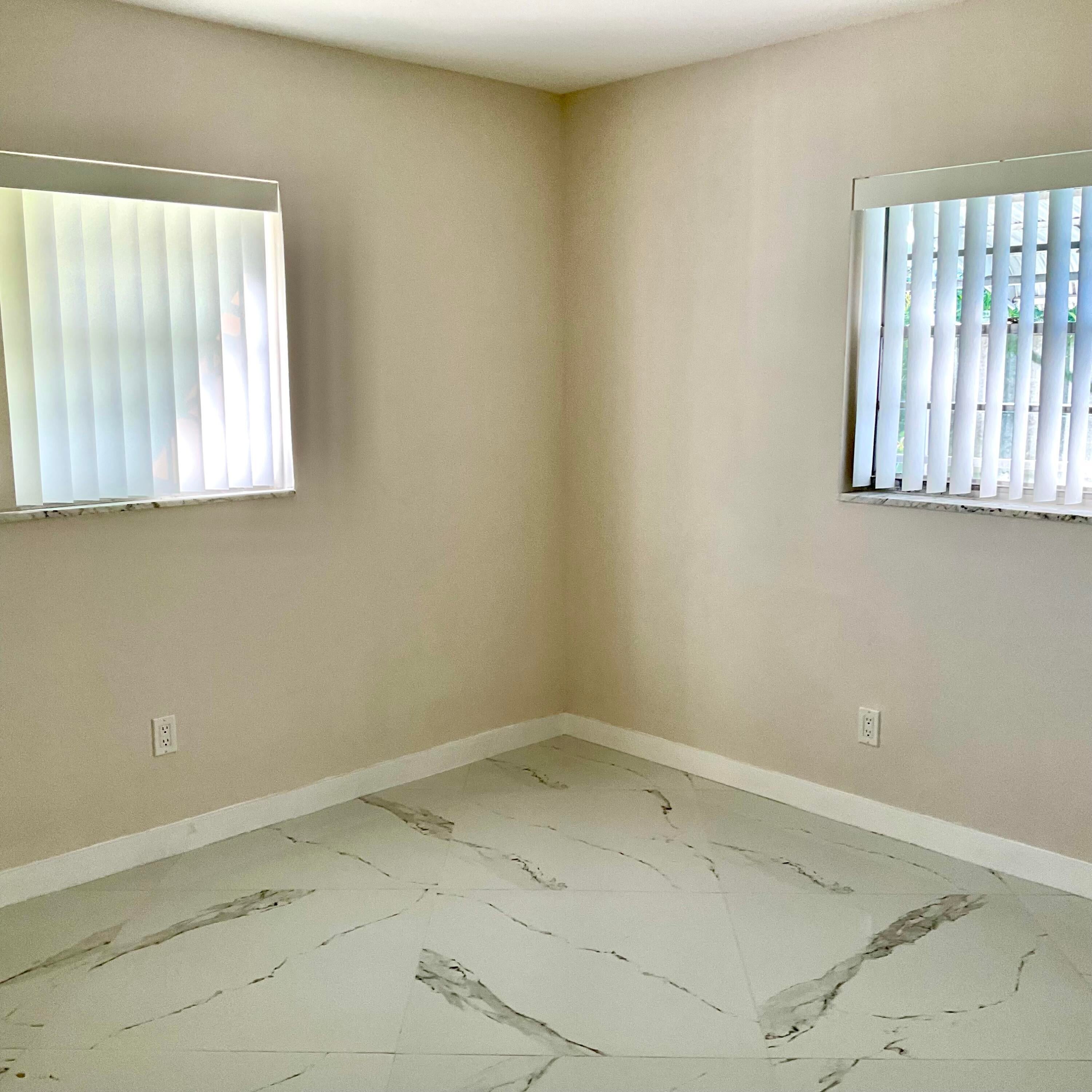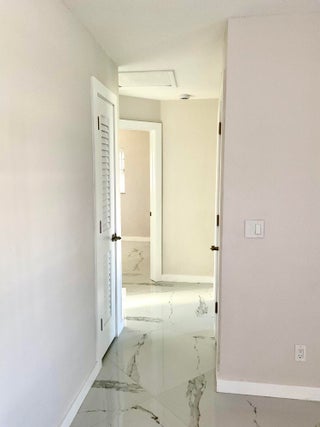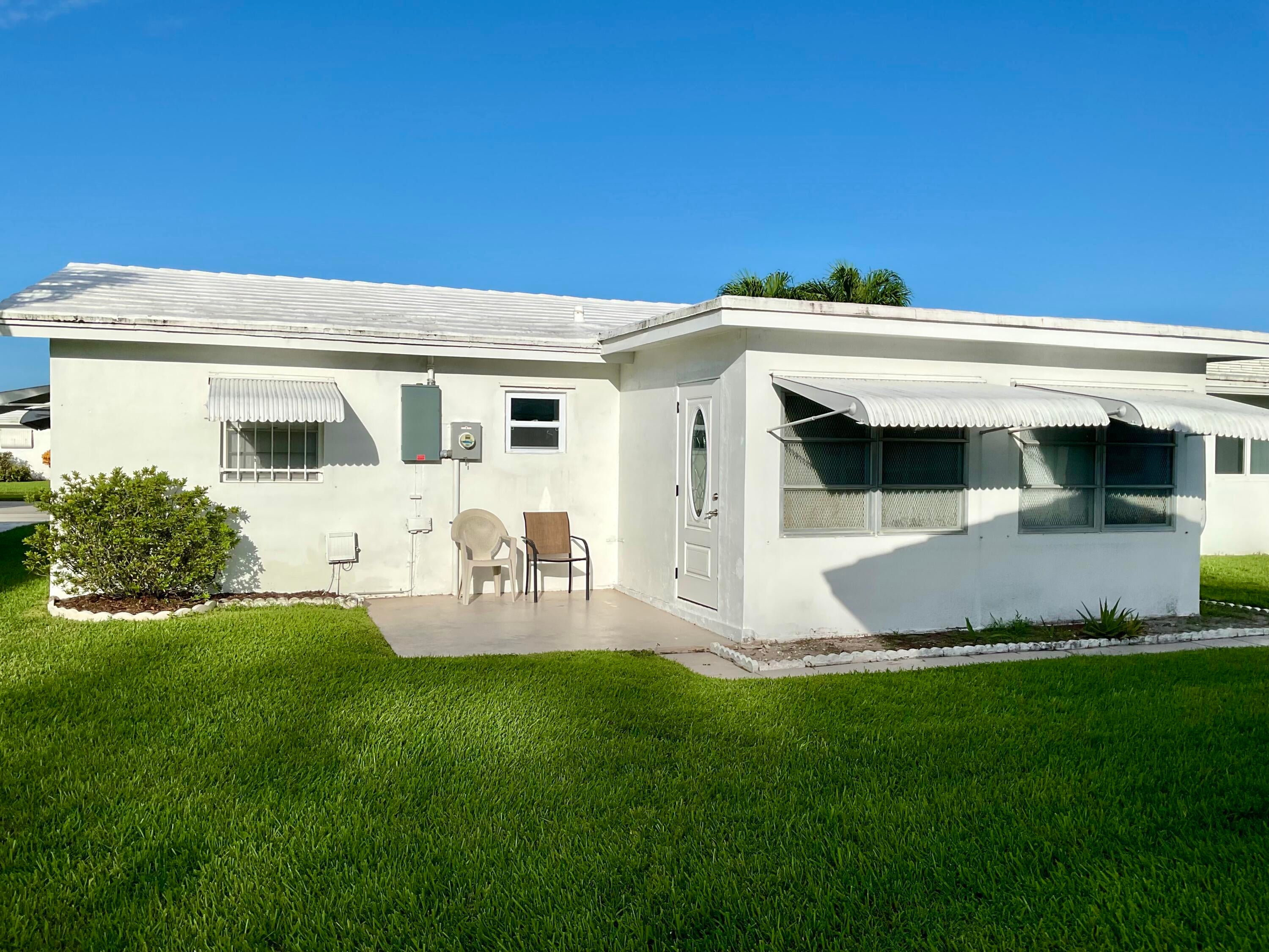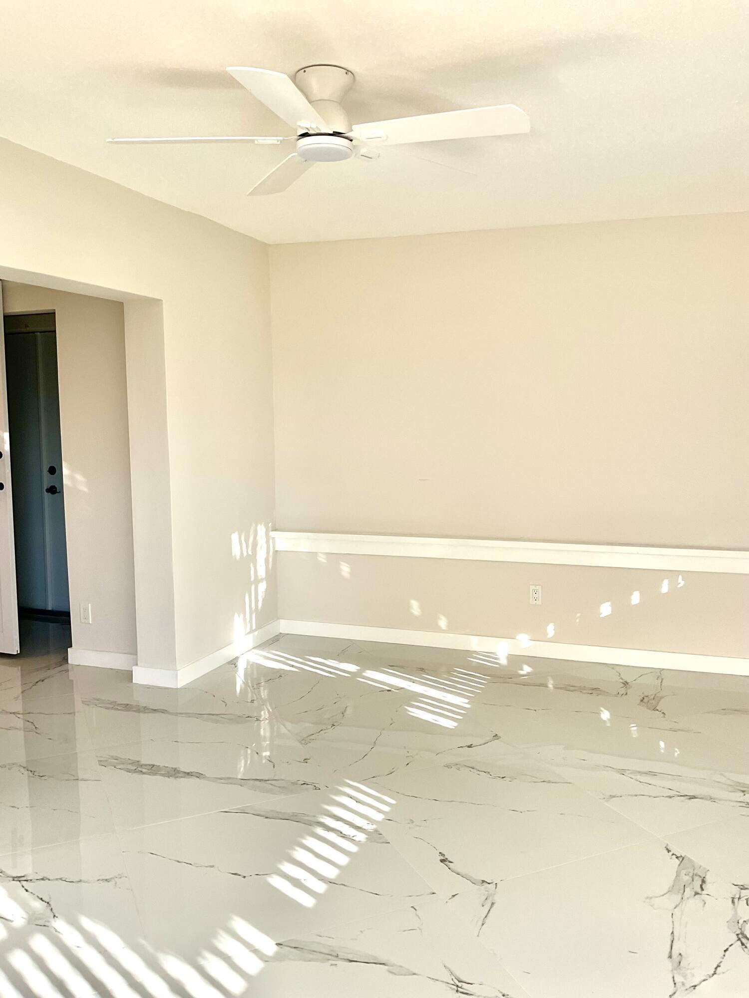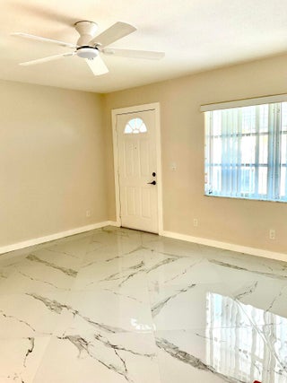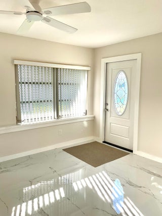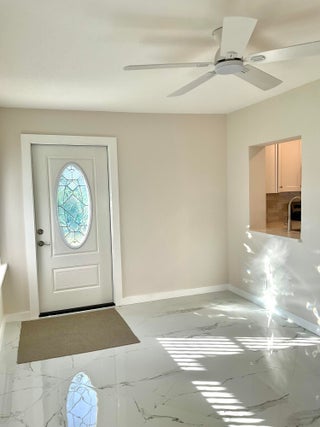 Beautifully updated light and bright 2BR/1BA home with 32X32' porcelain tile set on the diagonal throughout. Open kitchen with new wood cabinetry with pullouts, Quartz counters, tile backsplash, new appliances including barndoor feature to utility room w/ new water heater, W/D hookup and pantry, all new interior doors.The bathroom has a floor to ceiling tiled walk-in shower with niche, new vanity, lighted mirror and new toilet. Other features include fully updated electrical panels in and out and a hurricane impact back door out to a nice patio. Come enjoy the vibrant lifestyle of Palm Beach Leisureville with many amenities, teams and clubs including an 18 hole golf course free to owners, 3 clubhouses with pools, bocce ball, cornhole and so much more!!!