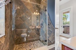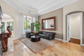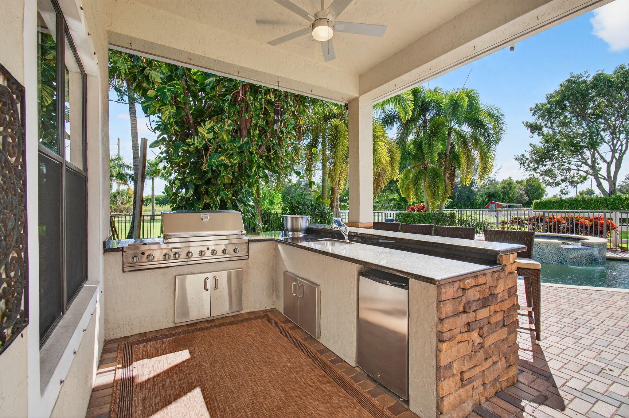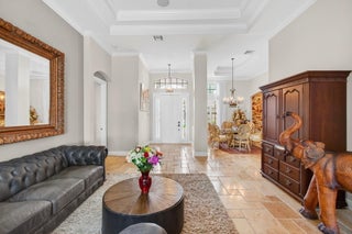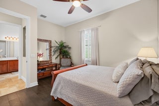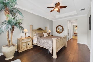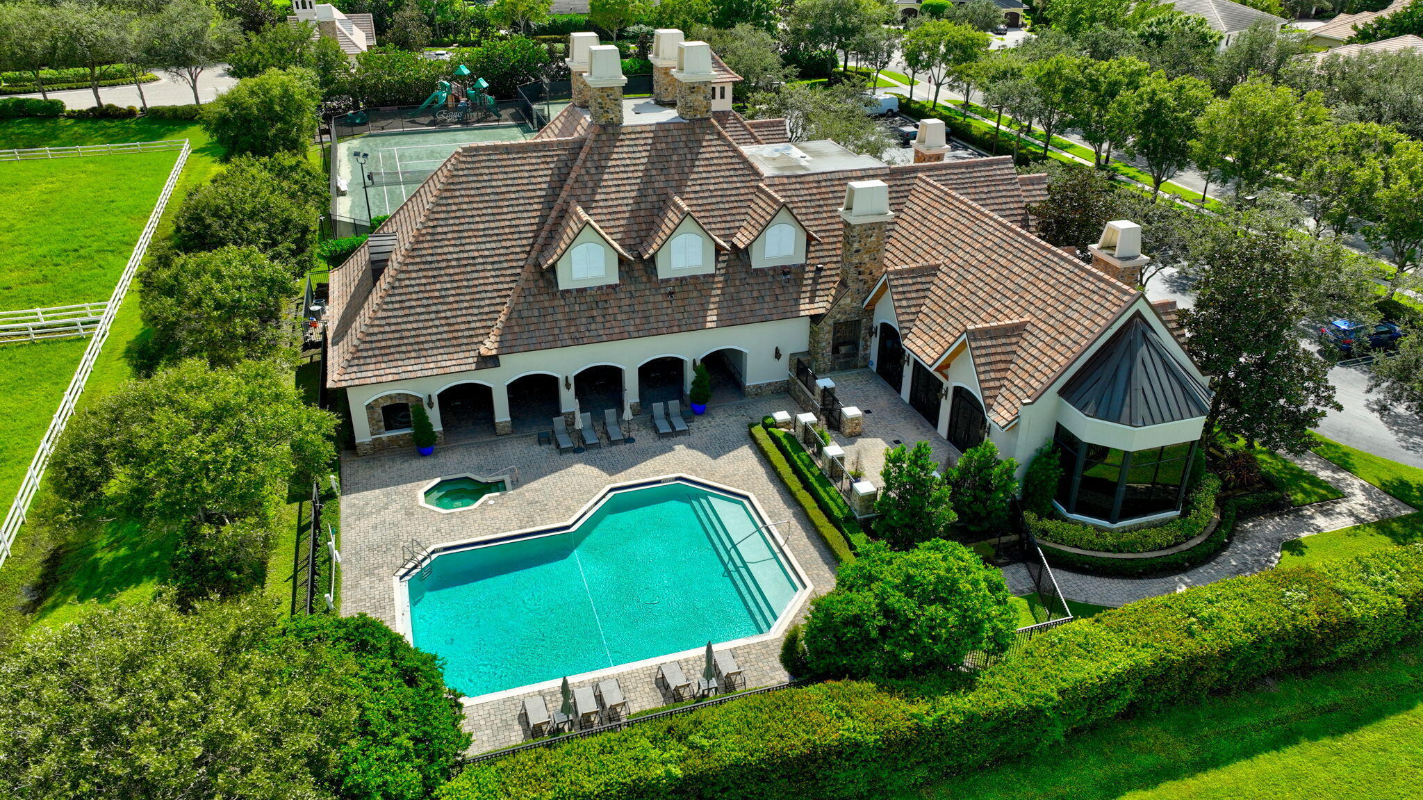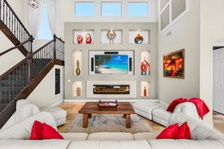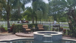 Exquisite 2 Story in the prestigious Equus community! Elegant soaring coffered ceilings and tumbled travertine marble flooring throughout main living areas. Wood flooring in all bedrooms & Downstairs Primary. The amazing backyard features a heated saltwater Pool & Spa with Pebble Tec, Summer kitchen, and a Large Fully Fenced Yard with numerous Palms and Fruit Trees. Alongside a Bridle Path for a spacious view & private feel. Home Warranty Included - good thru 11/4/26. HOA provides 24-hour Gated Security, ADT service, Premium Comcast services with internet, phone, cable and movie channels, Lawn irrigation, Clubhouse amenities, and Pickleball court coming soon!
