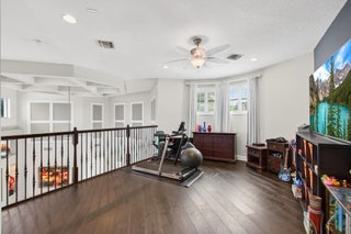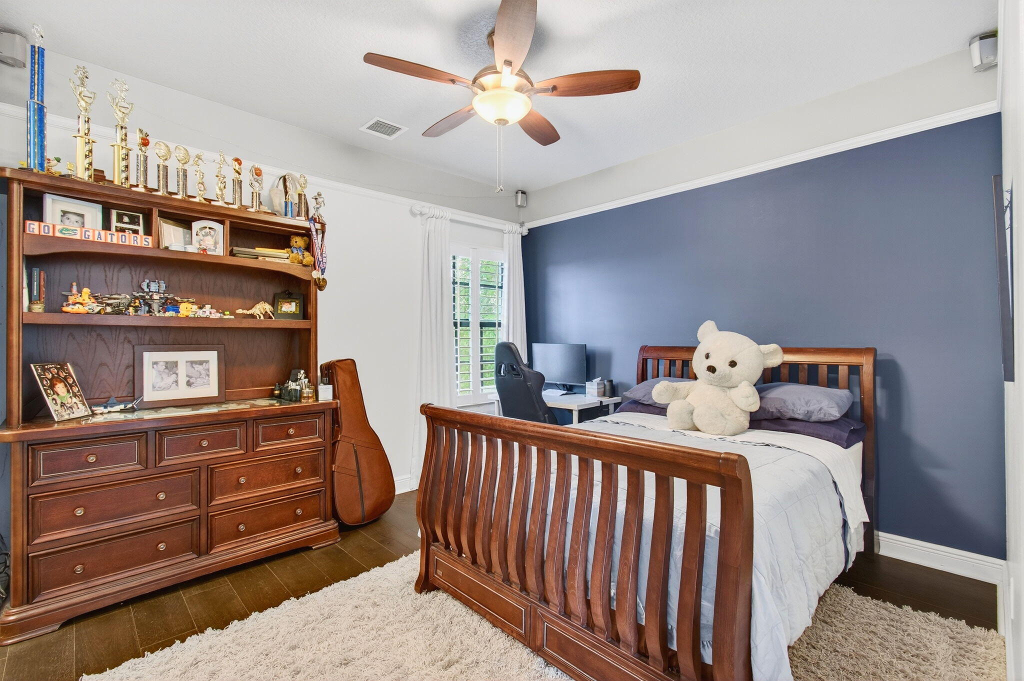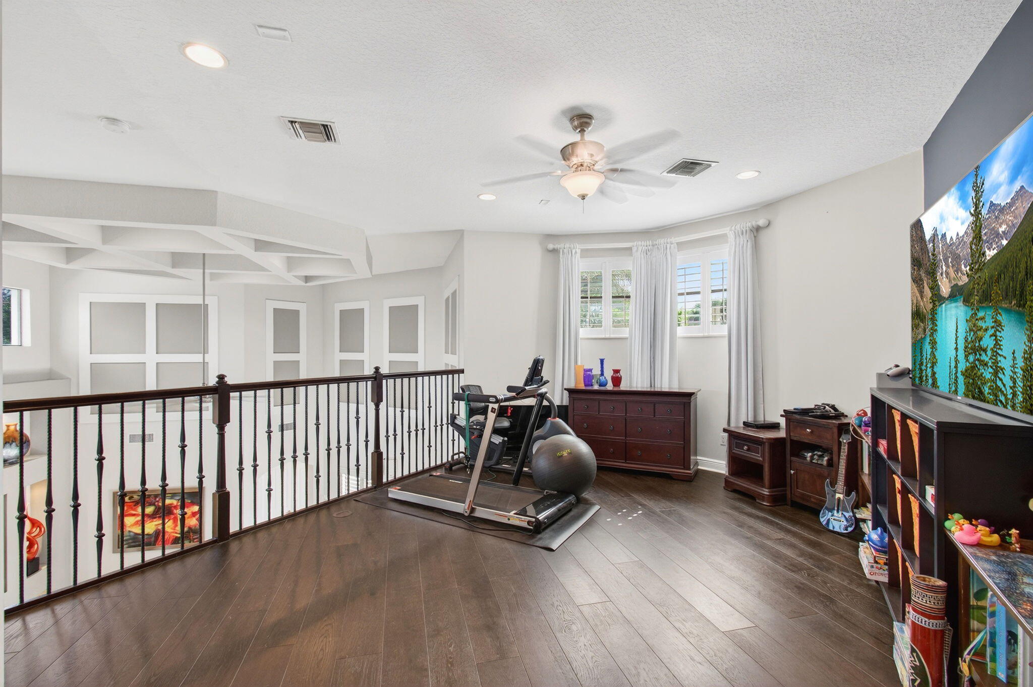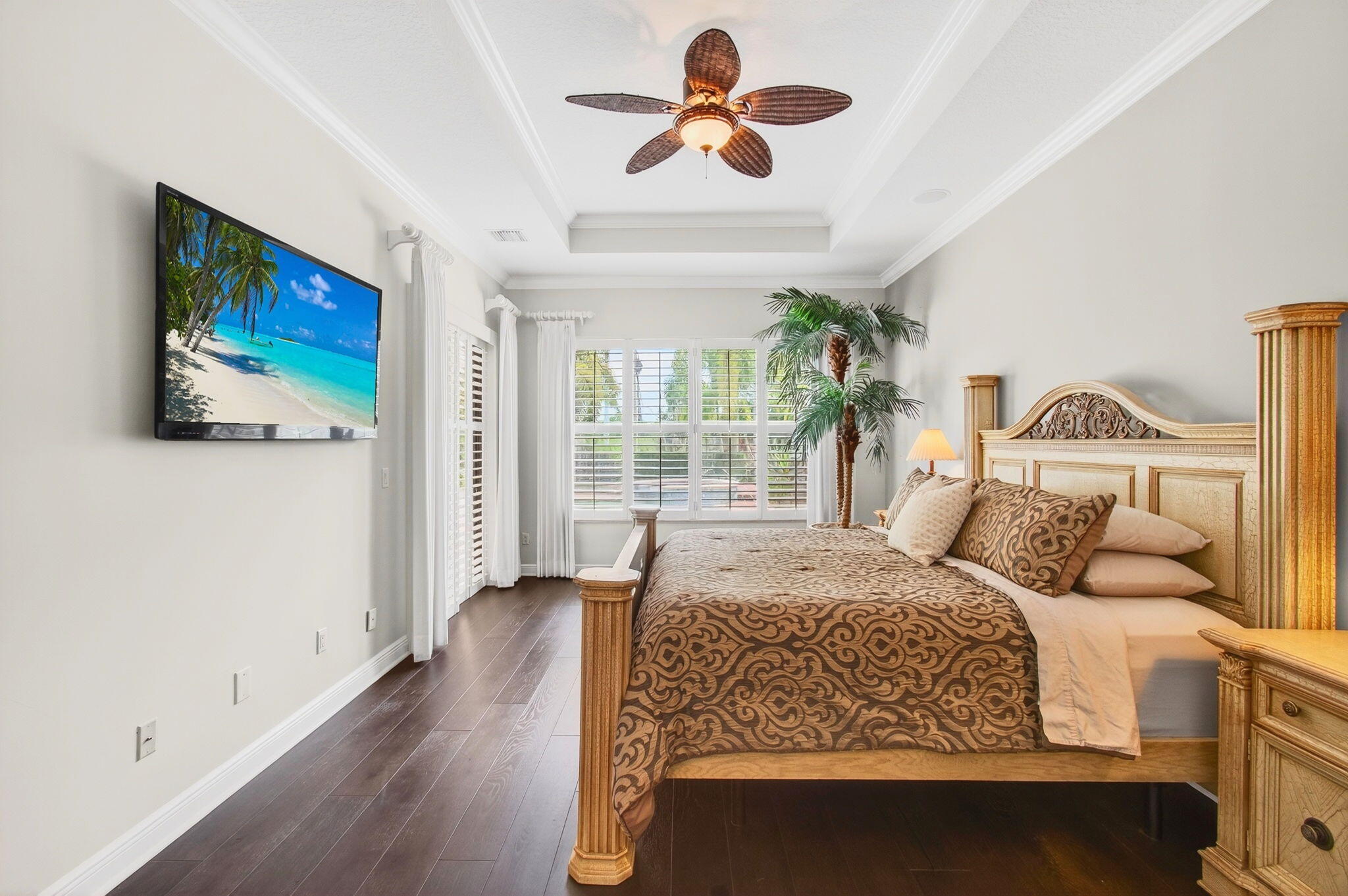 Exquisite 2 Story in the prestigious Equus community! Elegant soaring coffered ceilings and tumbled travertine marble flooring throughout main living areas. Wood flooring in all bedrooms & Downstairs Primary. The amazing backyard features a heated saltwater Pool & Spa with Pebble Tec, Summer kitchen, and a Large Fully Fenced Yard with numerous Palms and Fruit Trees. Alongside a Bridle Path for a spacious view & private feel. Home Warranty Included - good thru 11/4/26. HOA provides 24-hour Gated Security, ADT service, Premium Comcast services with internet, phone, cable and movie channels, Lawn irrigation, Clubhouse amenities, and Pickleball court coming soon!