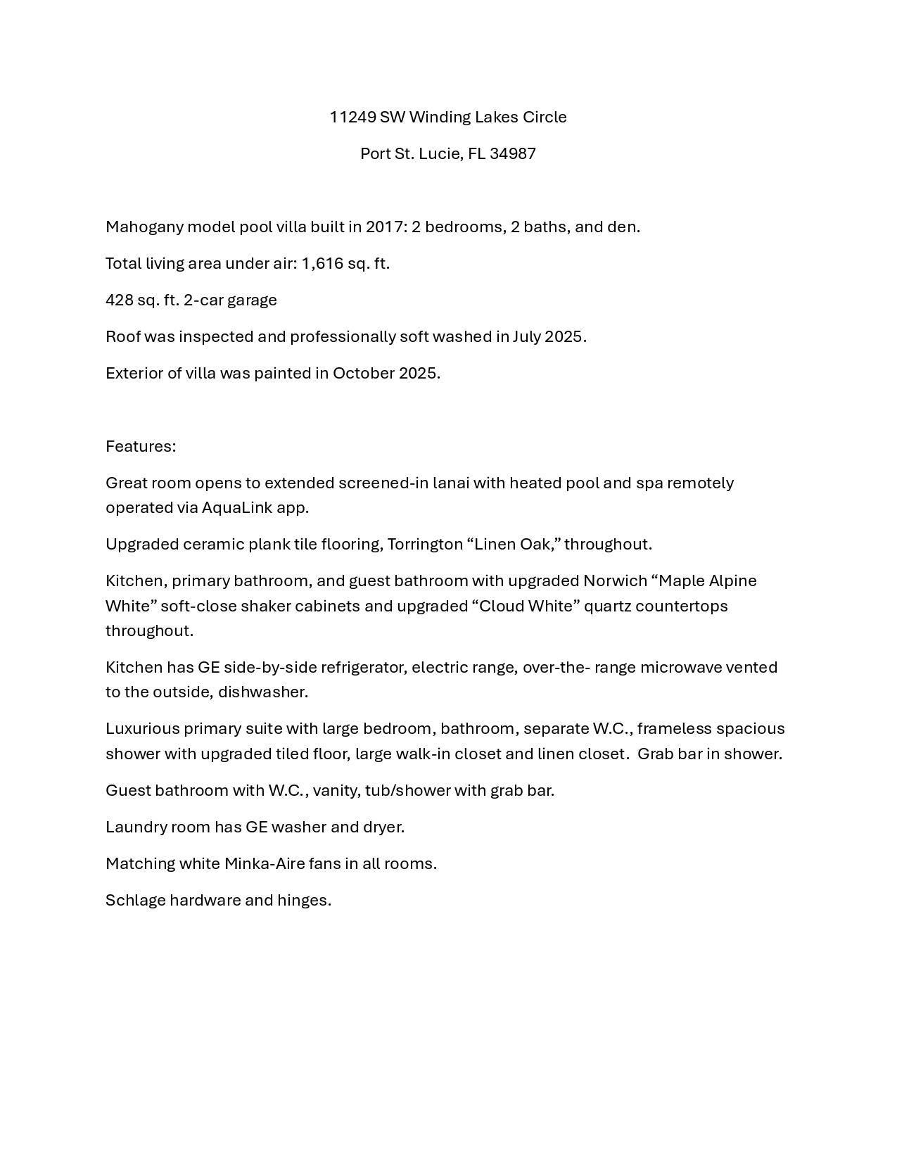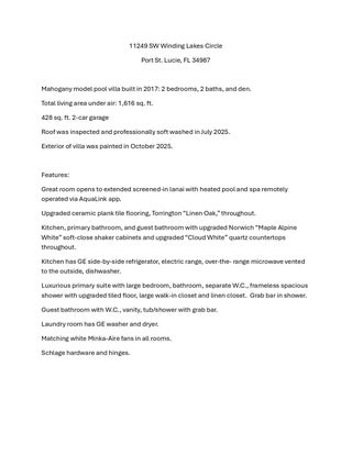 Experience refined Florida living in this exquisite Mahogany model villa, perfectly situated in the coveted LakePark at Tradition community. Designed with modern elegance in mind, this 2-bedroom plus den, 2-bathroom residence showcases a seamless blend of style, comfort, and tranquility. Step inside to an open-concept floor plan featuring contemporary tile flooring throughout, gorgeous quartz countertops, and full-impact glass windows that invite natural light and provide year-round peace of mind. The gourmet kitchen flows seamlessly into the spacious living and dining areas--perfect for entertaining or unwinding in style. Your private outdoor oasis awaits with a resort-style pool and spa overlooking lush preserve views, creating a tranquil retreat that feels worlds away.The automated pool system lets you heat the spa right from your smartphone, so it's perfectly ready for you to relax the moment you return home from dinner. Every detail of this home exudes sophisticationfrom its modern finishes to its smart technologydelivering a refined, low-maintenance lifestyle in one of Port St. Lucie's most desirable communities. Residents of Lake Park enjoy an all-inclusive HOA covering lawn care, mulching, full irrigation system use and maintenance, house phone, alarm system, high-speed internet, and cable TV; making this the perfect low-maintenance Florida lifestyle!