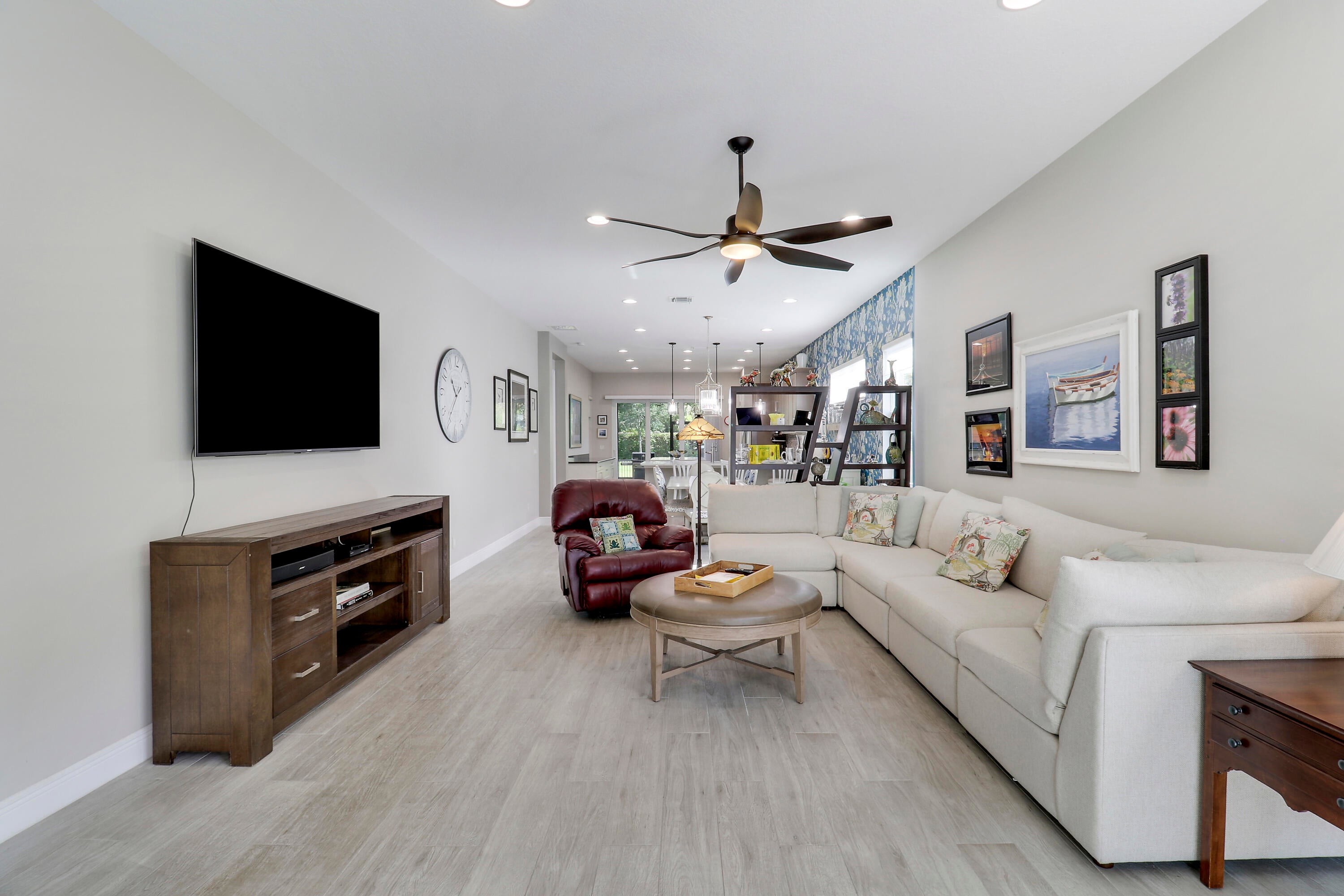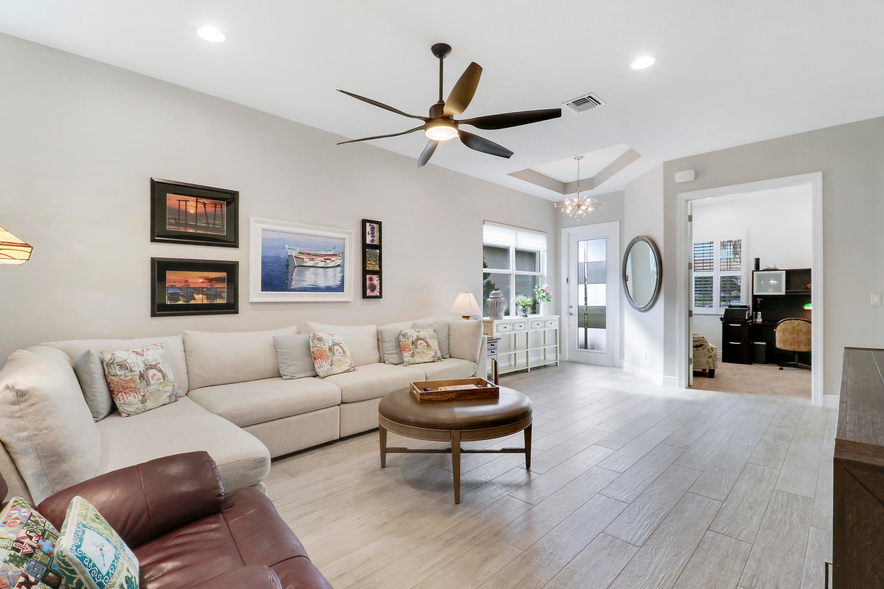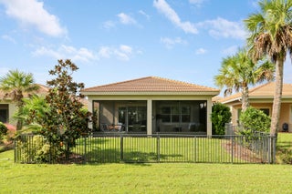 THIS HOME IS BRIMMING WITH CHARM & CHARACTER! Spacious 2BR+Den/2BA/2CG 'Casita' plan with private, fenced back yard. Some of the many special features include decorative glass entry front door, elegant lighting & fans throughout, upgraded window treatments, wallpaper accent, wood flooring in the master bedroom, murphy bed in the guest bedroom, front load washer & dryer, spacious fenced yard, quartz counters throughout, custom organizers in the master closet and more! Wood look tile runs through the main living areas. The spacious kitchen is fit for cooking enthusiasts and features 42'' wood cabinetry, quartz counters, center island, upgraded stainless steel appliances, breakfast bar seating, custom built storage center with drawers, pendant lighting, tiled backsplash and pantry closet.Retreat to the master suite, which overlooks the peaceful back yard and has wood flooring, spacious ensuite with dual vanities, tiled shower and a walk-in closet with fantastic custom organizers. The second bedroom is fit with a versatile murphy bed and has direct access to the second bathroom, which is also accessible through the hallway. The office/den is perfect as a flex room or home office. Laundry room with upgraded front load washer & dryer, cabinetry for storage and utility sink. Enjoy bird watching in the serene back yard from your spacious screened & covered patio. The fully fenced yard is ready for your furry family members! Storm preparation is a breeze with IMPACT GLASS WINDOWS & DOORS throughout, also providing energy efficiency. Verano is an amenity rich community with a 27 court pickleball facility, walking paths, indoor and outdoor pools, multiple fitness centers, sauna, dog park, tennis courts, social clubhouse and so much more! HOA dues include basic cable, internet, lawn care, alarm monitoring, common area maintenance and access to the amenity centers. For avid golfers, there is a cart path leading to the PGA Golf Club (membership is optional and availability varies). This community truly has something for everyone! Come experience resort style living - call today to view!