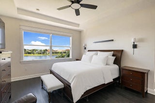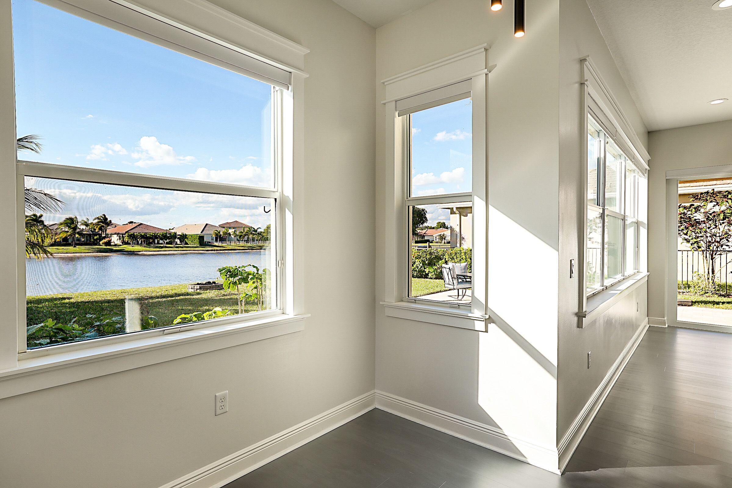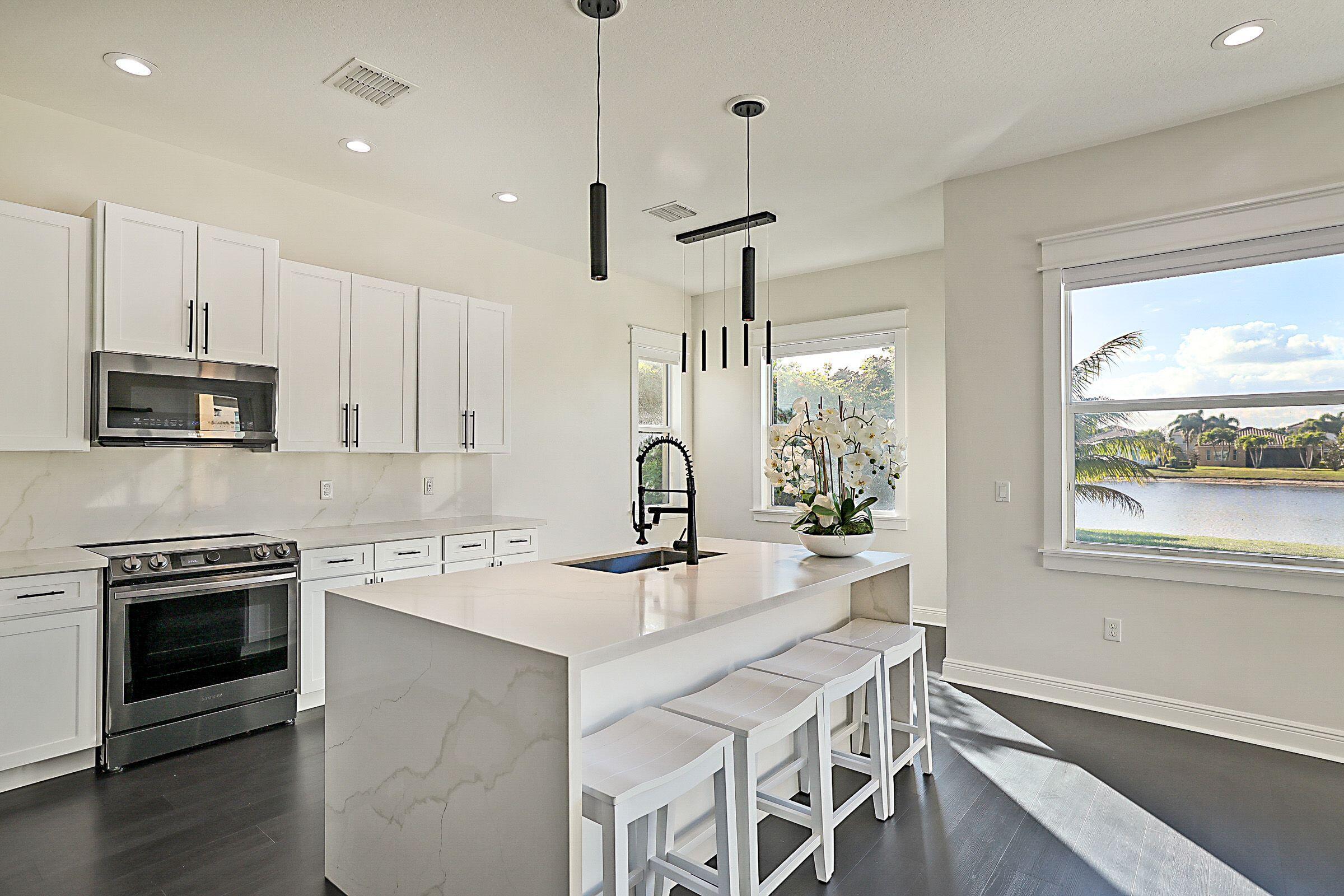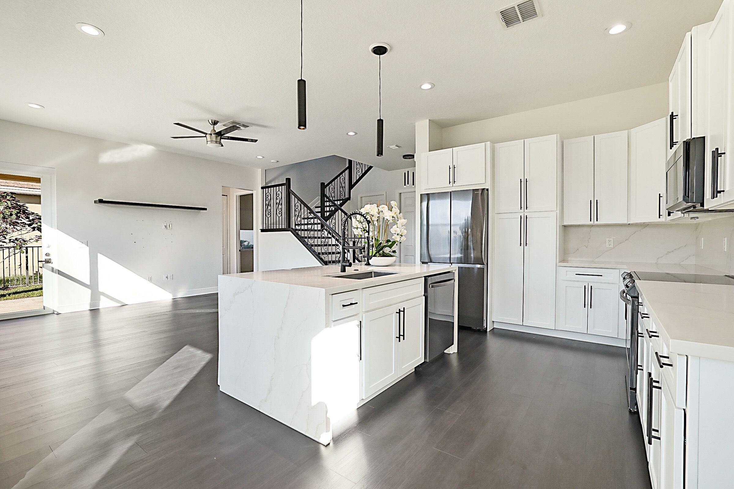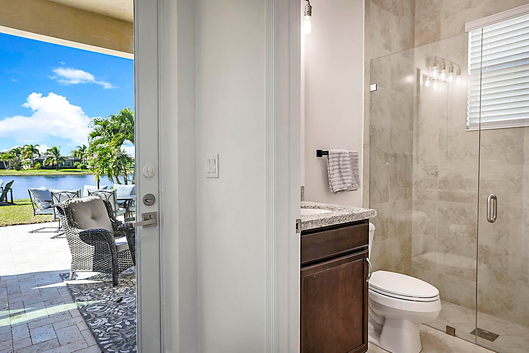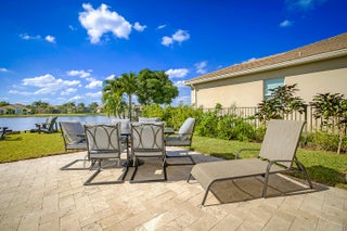 This stunning 3BR/3BA + den lakefront home is a must see. Private first-floor bedroom and cabana bath, ideal for a guest suite.Updated with attention to detail and design in every room, including flooring, cabinets, quartz countertops and backsplash, large kitchen island, stainless steel appliances, updated lighting, ceiling fans, hardware, remote-control blinds, and impact windows and doors. Lake views with travertine patio pavers, outdoor shower, fire pit, room for a pool, and fishing access. Resort-style amenities include pickleball, tennis, pool, hot tub, clubhouse, fitness center, splash pad, basketball, volleyball, walking trails, and more. Convenient to schools, shopping, dining, and recreation. Move in ready.Low HOA