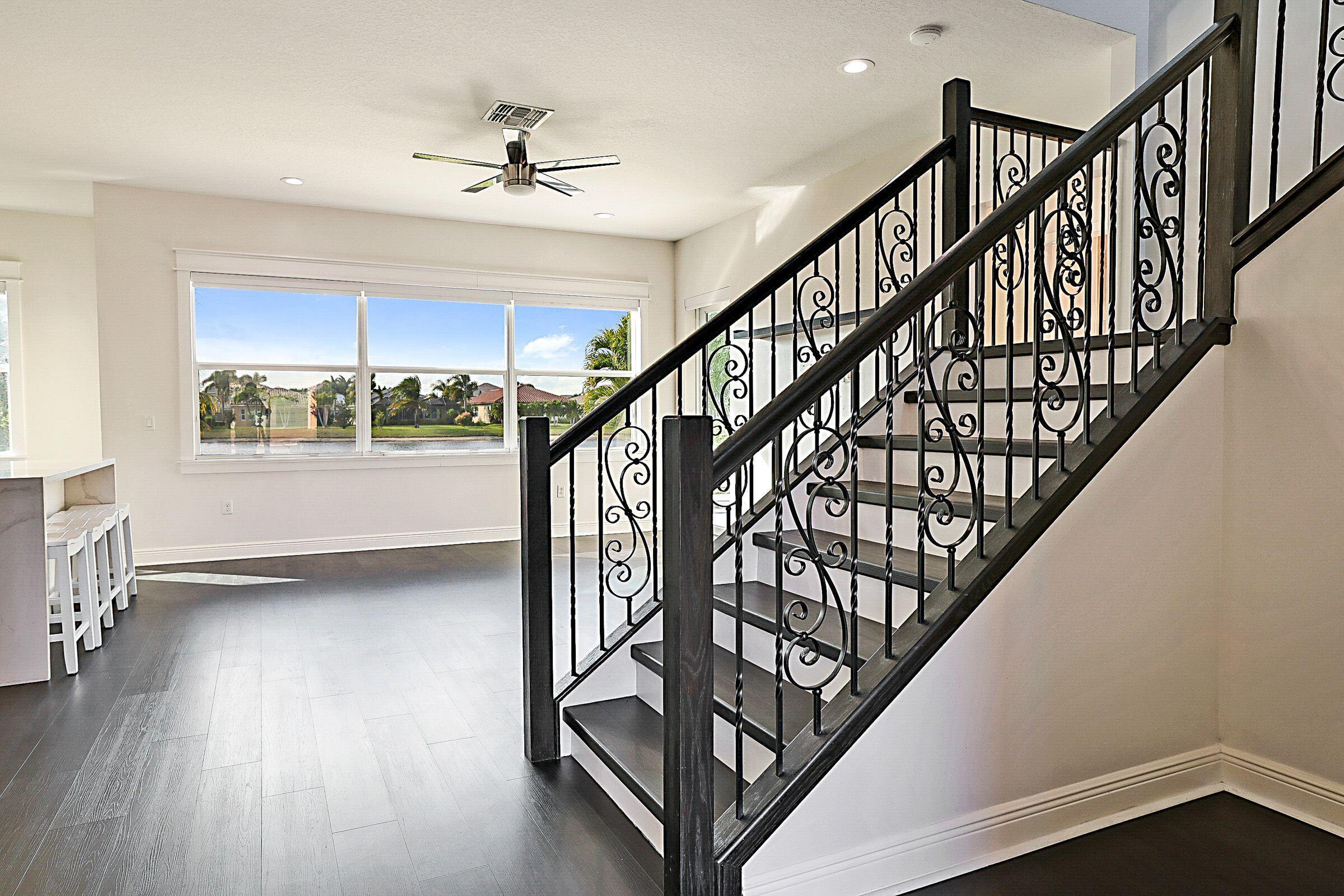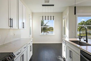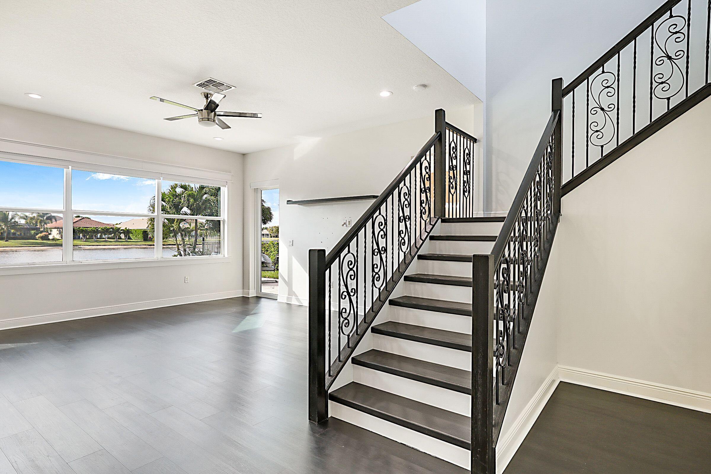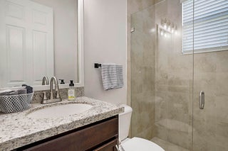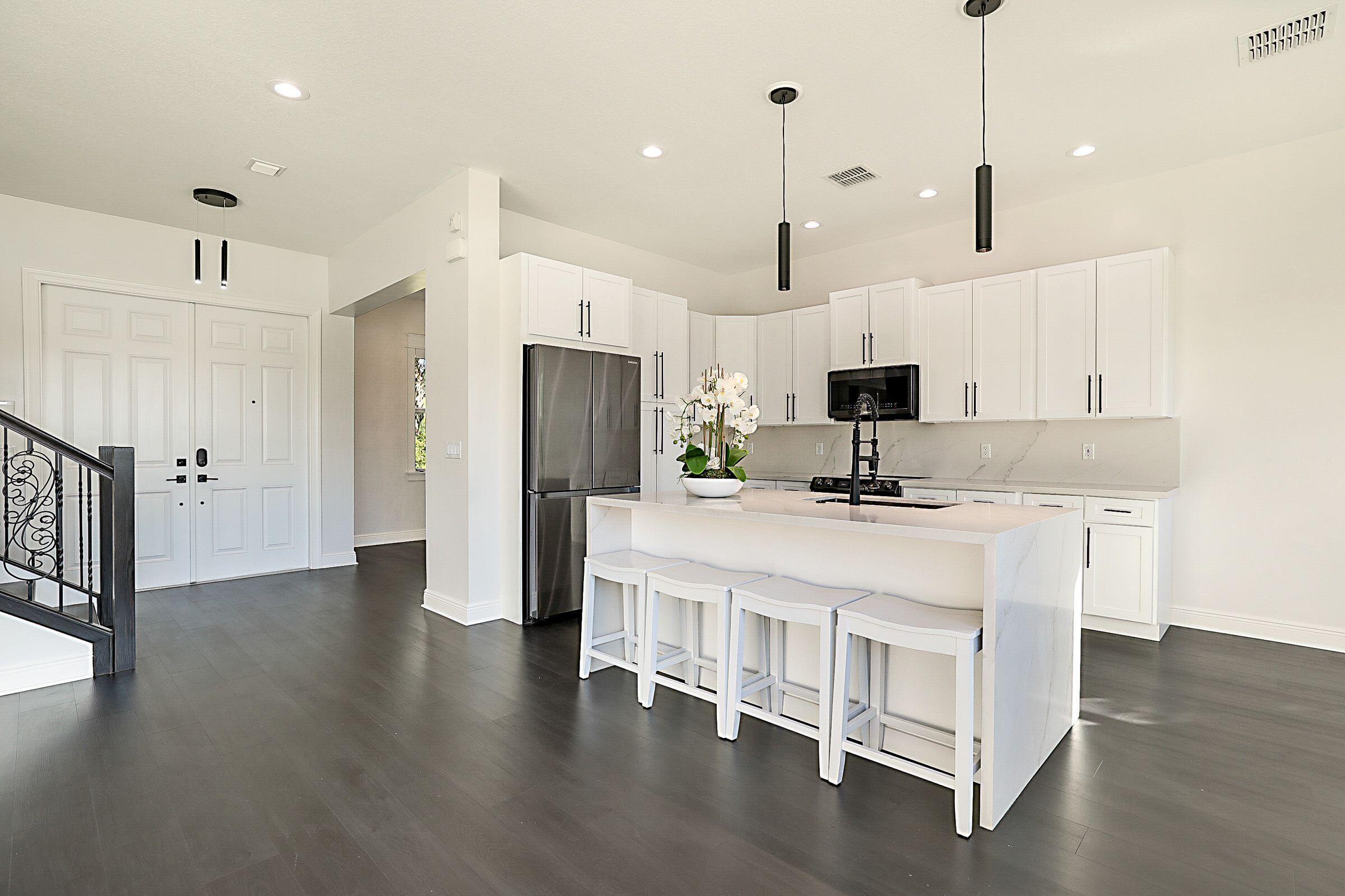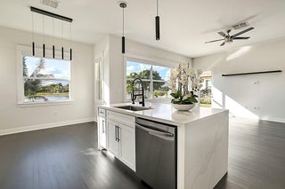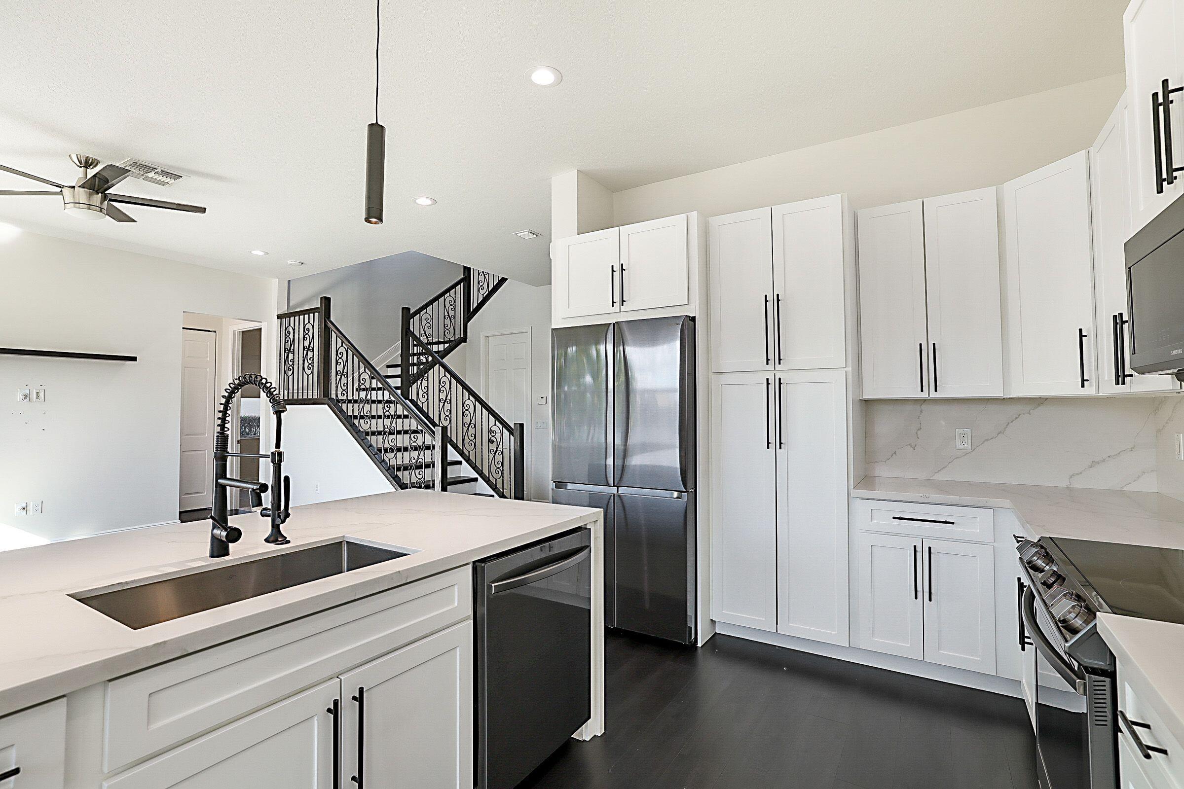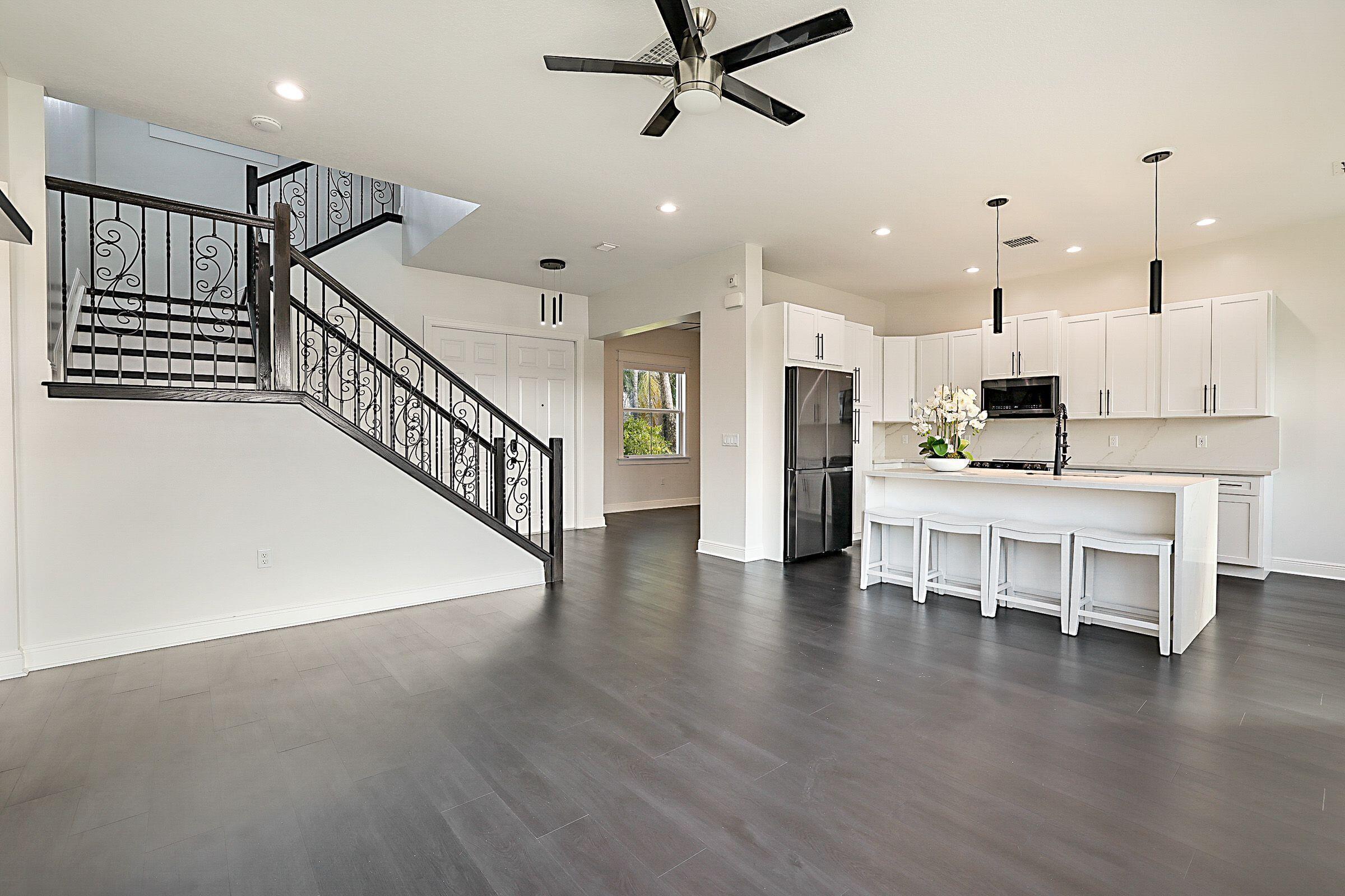 This stunning 3BR/3BA + den lakefront home is a must see. Private first-floor bedroom and cabana bath, ideal for a guest suite.Updated with attention to detail and design in every room, including flooring, cabinets, quartz countertops and backsplash, large kitchen island, stainless steel appliances, updated lighting, ceiling fans, hardware, remote-control blinds, and impact windows and doors. Lake views with travertine patio pavers, outdoor shower, fire pit, room for a pool, and fishing access. Resort-style amenities include pickleball, tennis, pool, hot tub, clubhouse, fitness center, splash pad, basketball, volleyball, walking trails, and more. Convenient to schools, shopping, dining, and recreation. Move in ready.Low HOA
