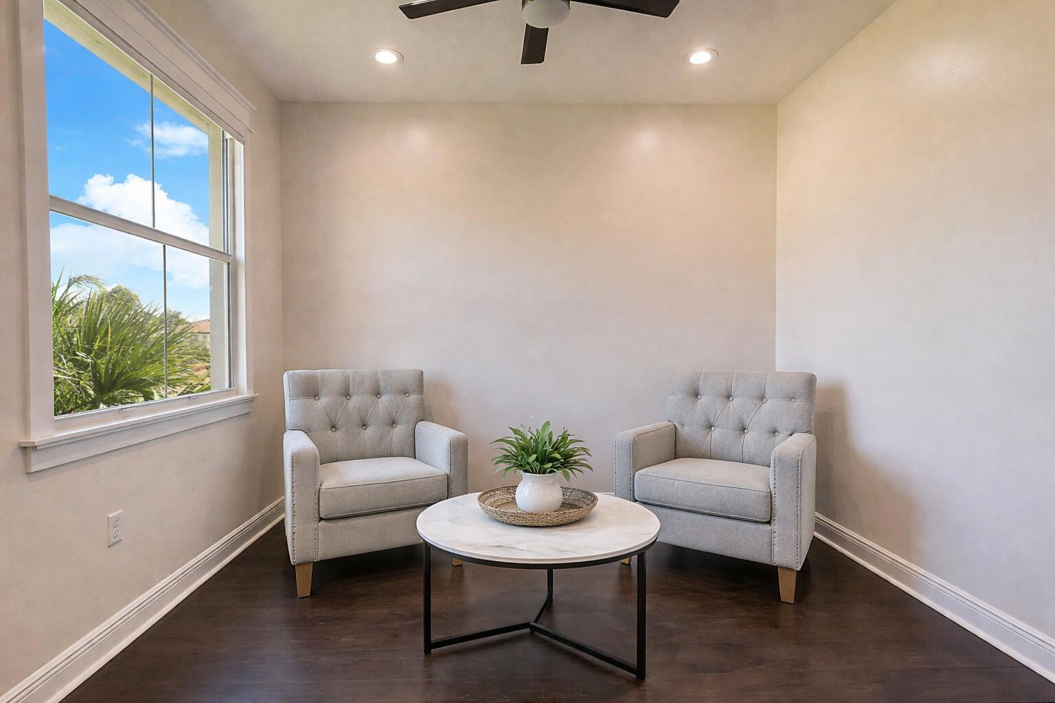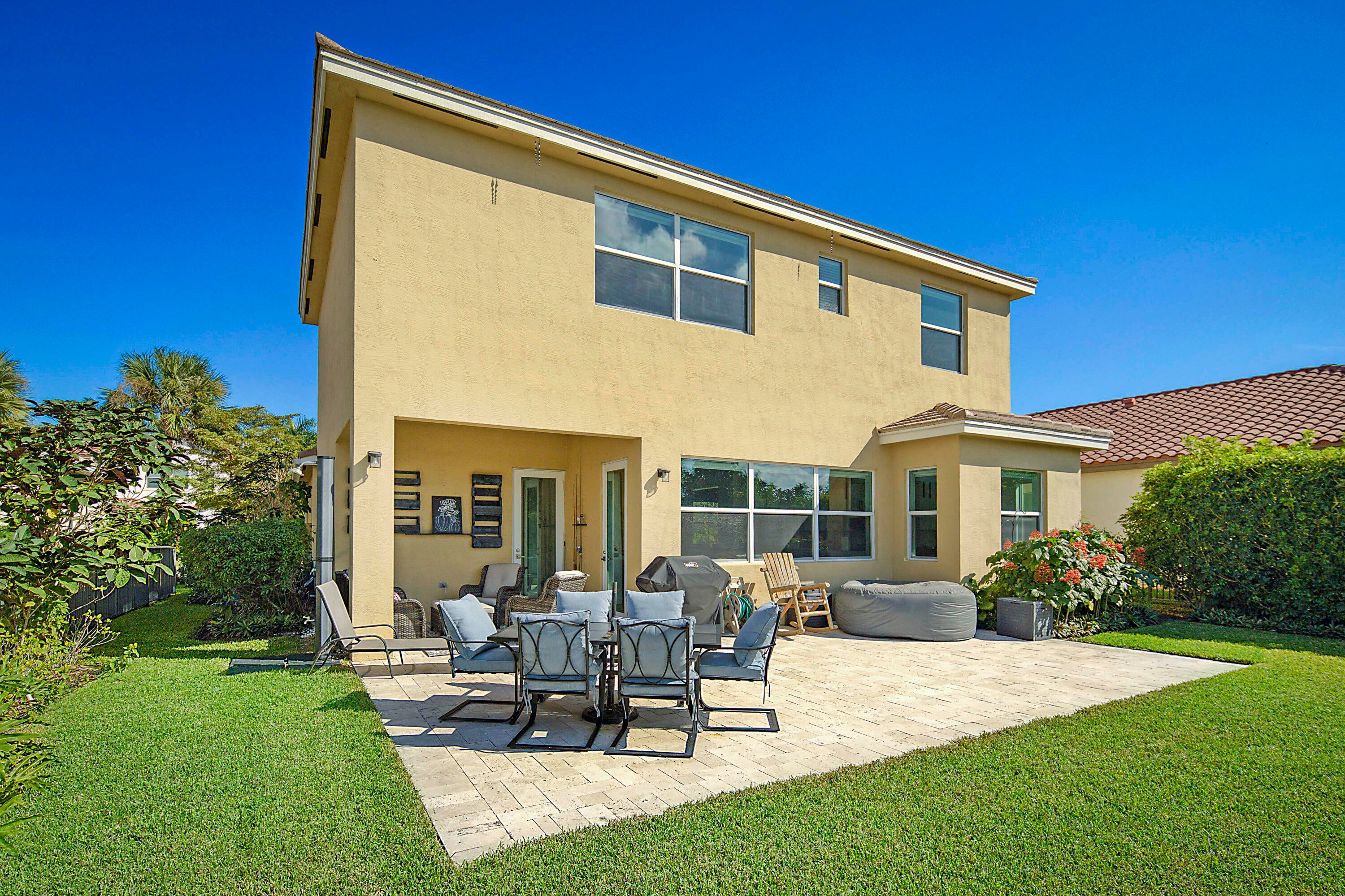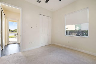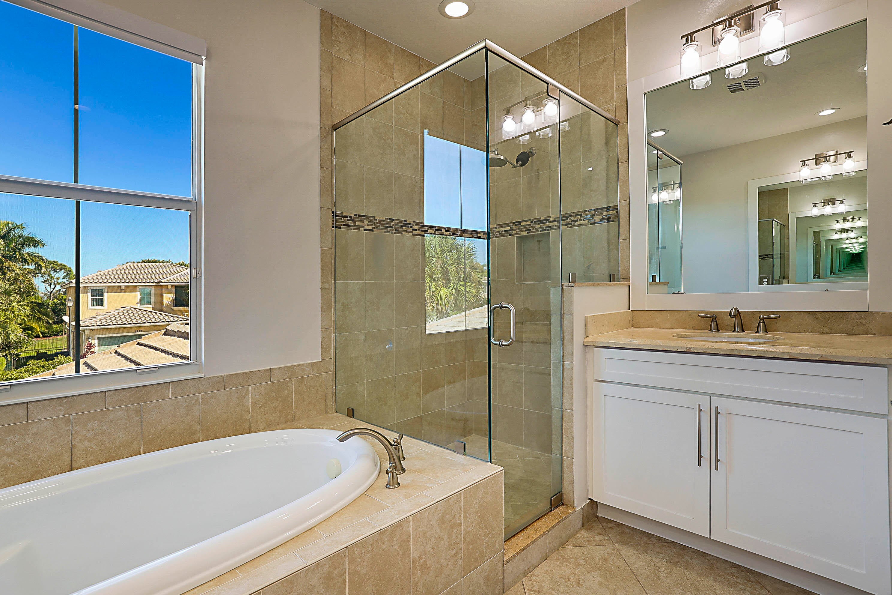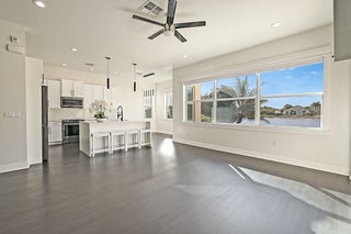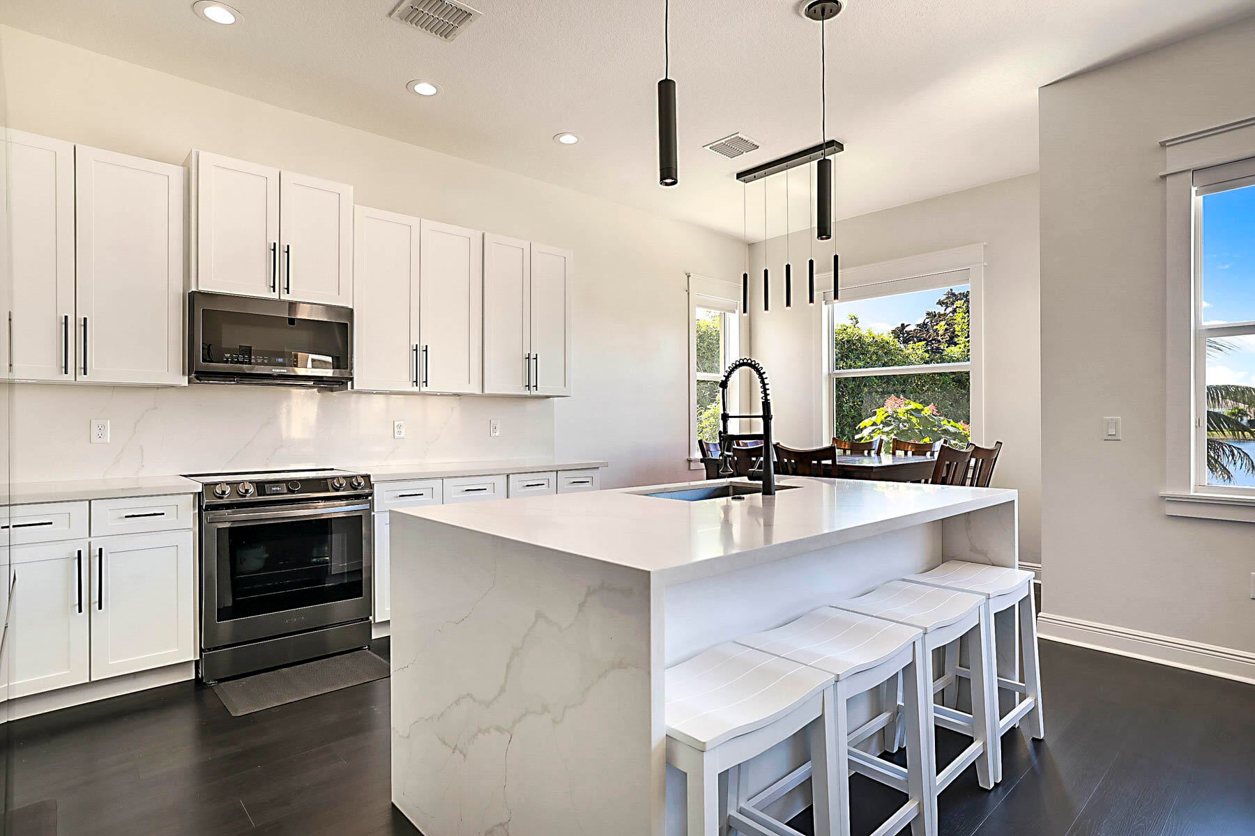 This stunning 3BR/3BA + den lakefront home is a must see. Private first-floor bedroom and cabana bath, ideal for a guest suite.Updated with attention to detail and design in every room, including flooring, cabinets, quartz countertops and backsplash, large kitchen island, stainless steel appliances, updated lighting, ceiling fans, hardware, remote-control blinds, and impact windows and doors. Lake views with travertine patio pavers, outdoor shower, fire pit, room for a pool, and fishing access. Resort-style amenities include pickleball, tennis, pool, hot tub, clubhouse, fitness center, splash pad, basketball, volleyball, walking trails, and more. Convenient to schools, shopping, dining, and recreation. Move in ready.Low HOA