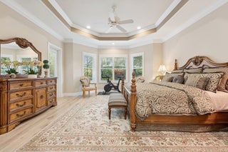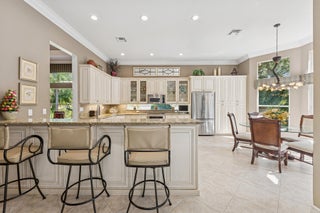 Welcome to this beautifully maintained 3 Bedroom / 2.5 Bath home located in the highly sought-after gated community of Valencia Pointe. Offering 2,686 SF under air, this residence combines comfort, elegance, and privacy in one of Boynton Beach's premier active-lifestyle neighborhoods. Enter through a gated courtyard with a tranquil fountain and lush tropical landscaping into a custom double etched-glass door entry. The Great Room features 13-ft tray ceilings, crown moldings, and abundant natural light perfect for both everyday living and entertaining. The spacious kitchen includes granite countertops, generous cabinetry, pull-out pantry storage, and a breakfast nook overlooking the garden. The primary suite is a private retreat with new engineered wood floors, two large custom walk-inclosets, and French doors leading to a screened tropical patio enhanced by accent lighting and a soothing fountain. The elegant primary bath features double frosted-glass French doors, a soaking tub, and a separate walk-in shower. This split-bedroom floor plan offers a third bedroom currently used as a home office with pocket French doors, plus a large laundry room with custom cabinetry and utility sink. Additional upgrades include plantation shutters, detailed wood trim, new 2024 A/C, and a mix of impact glass and accordion shutters for hurricane protection.