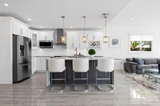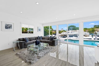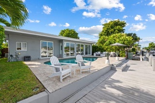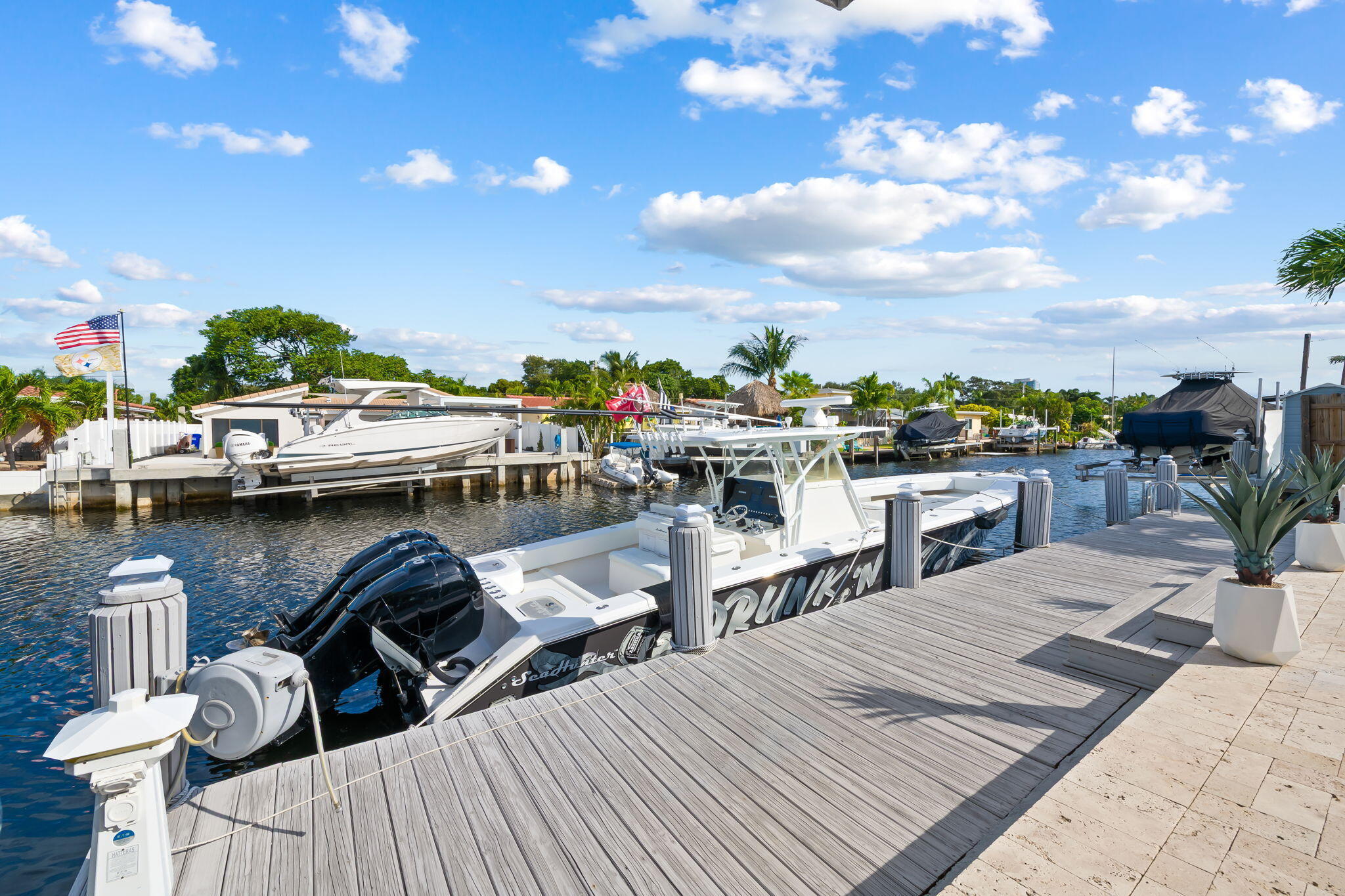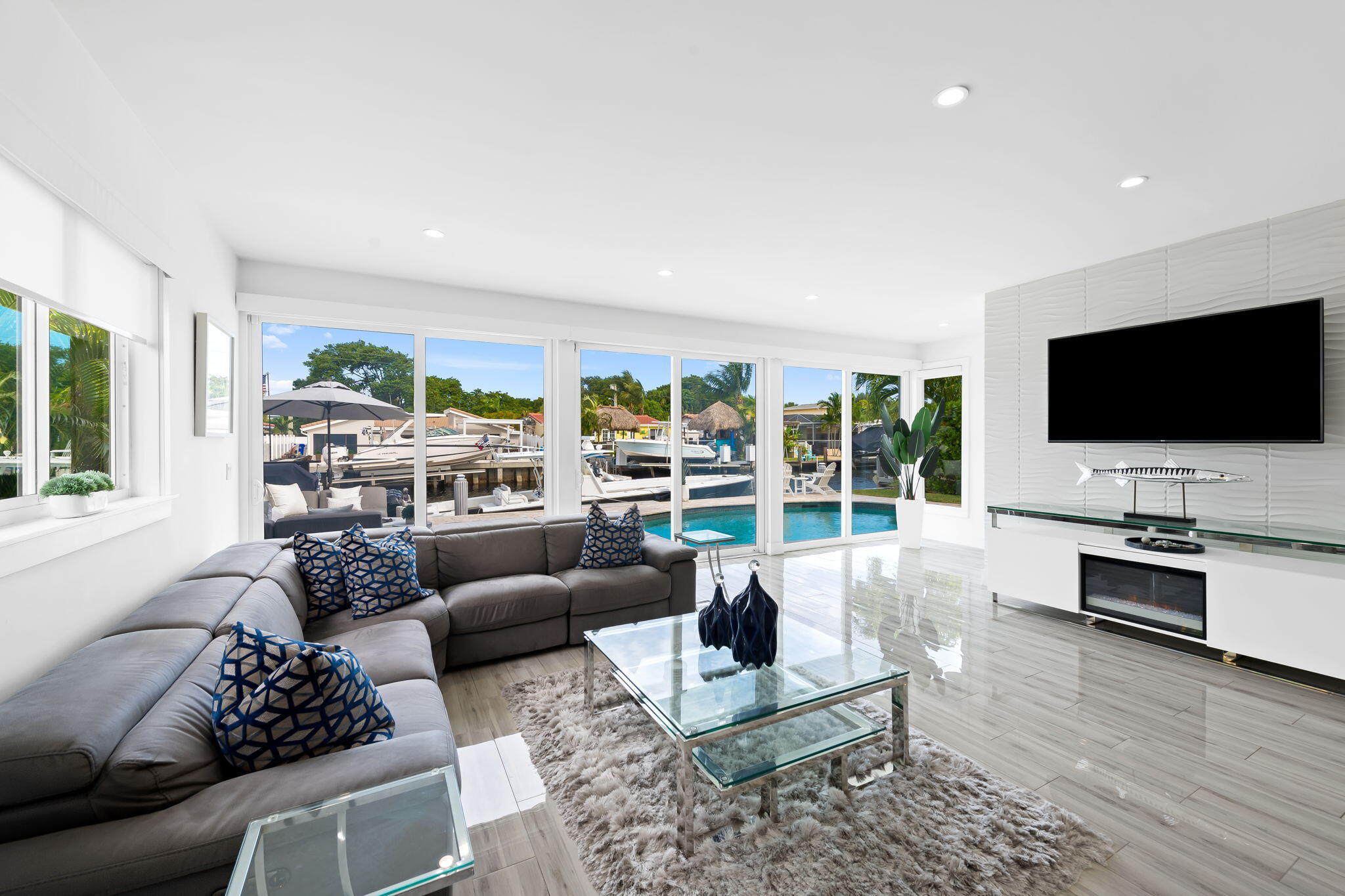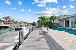 Welcome to this stunning waterfront retreat where modern design meets smart living. This fully furnished three-bedroom, two-bath home offers 70 feet of prime ocean-access waterfrontage with NO fixed bridges. Featuring a 60-foot dock with Hatteras brand duel light power pedestal 50/30 amps, water and solar dock lights and a sparkling resort-style pool surrounded by a travertine patio and lush tropical landscaping. Every detail has been thoughtfully curated for comfort and style, from the impact-rated windows and doors to the elegant half-circle driveway and fully fenced backyard that blend privacy with sophistication.Inside, a bright open layout features glossy polished white wood-plank ceramic tile, solid wood interior doors, and custom designer wall treatments. Freshly painted indesigner tones of Sherwin-Williams "Brite White"and "First Star" gray for a crisp, modern aesthetic. The chef's kitchen showcases a waterfall-edge island with dual-side storage, a custom range hood, a French-door refrigerator, and a full suite of premium Samsung appliances. Entertaining is effortless with a built-in Newair 46-bottle wine cooler and premium El Dorado furnishings throughout. Dual central cooling systems, automatic shades, dimmers in every room, and custom smart lighting ensure refined living, while the spa-inspired primary bath with a rainfall shower and body jets creates a luxurious daily retreat. The outdoor space completes the picture with a sparkling pool, travertine deck, and a dock ideal for entertaining or unwinding by the water. Recent updates, including a full remodel, wood dock, and new hurricane proof garage door, make this home move-in ready and designed for the ultimate South Florida lifestyle. Pompano Beach is one of South Florida's fastest-growing coastal communities, offering a dynamic blend of lifestyle, leisure, and investment potential. Enjoy world-class restaurants, rooftop bars, and casual beachfront dining just minutes away, along with the iconic fishing pier and new waterfront parks. The approved Pompano Beach Innovation District is set to further enhance the area's appeal, driving continued growth and property appreciation. With easy access to golf courses, parks, major highways, and nearby cities like Fort Lauderdale and Miami, this location offers the best of coastal living with unmatched convenience.
