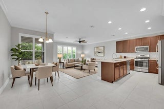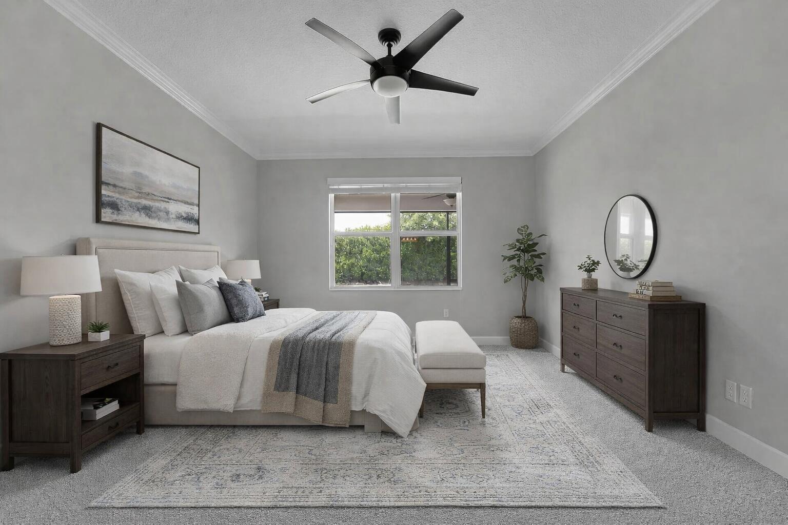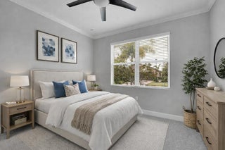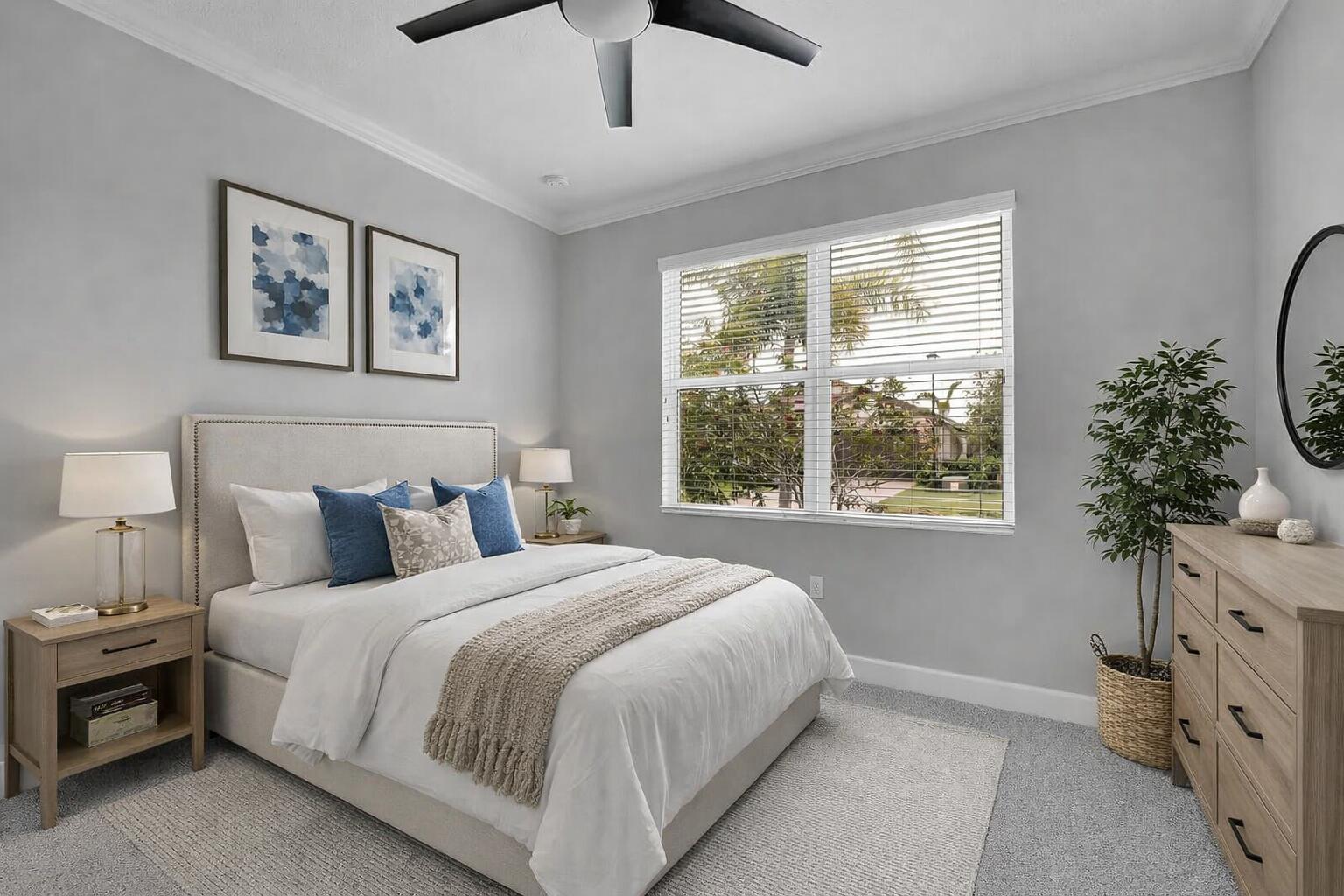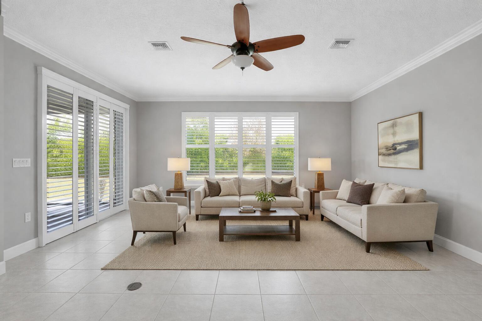Move-In Ready Heron Model in Valencia Cay! Live the resort lifestyle in this beautifully maintained 2-bedroom + den, 2-bath Heron model located in the sought-after 55+ community of Valencia Cay. Designed for comfort and style, this home blends luxury finishes with low maintenance living, featuring new bedroom carpet, tile flooring in main areas, and crown molding throughout. The gourmet kitchen shines with upgraded stainless steel appliances and a natural gas stove, opening to a bright living area with plantation shutters, tray ceiling, and elegant details that make every day feel special. The primary suite includes pocket doors for privacy and a serene layout for ultimate relaxation. Unlike many homes in Valencia Cay, this one does not back up to a lake, offering rare privacy and peaceful surroundings. Enjoy quiet mornings or breezy evenings on the extended screened patio and lanai, no noise echoing from the lake, just tranquility. The phantom screen front door invites in the fresh air for perfect cross ventilation. Additional perks include: Impact windows, Tankless water heater, Sealed garage floor, Ceiling fans and window treatments included.Perfectly located near I-95, shopping, dining, medical centers, and Tradition, with the Valencia Cay clubhouse just minutes awayoffering resort-style pools, pickleball, fitness center, and endless activities. Turnkey and move-in ready everything's done for you. Act now, and you can still close before the end of the year to secure your Florida Homestead Exemption! Come see it today and experience the quiet comfort, privacy, and effortless living that make this Heron model a standout!