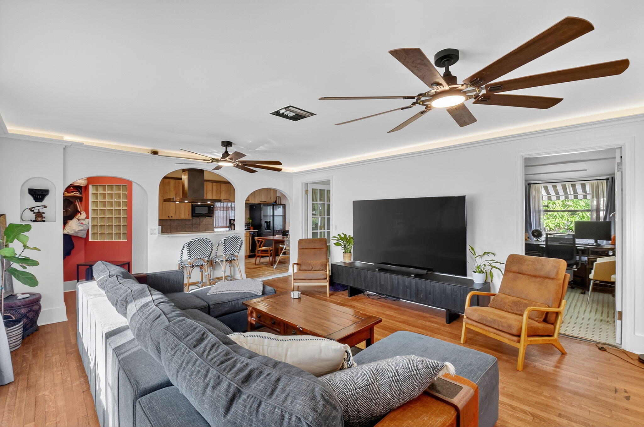 Experience modern Florida living at its finest on an oversized, fully fenced double lot in a historic neighborhood east of I-95, just minutes from downtown West Palm Beach! This stunning home is fully upgraded, featuring a bright, Florida room perfect for relaxing or entertaining. The kitchen and bathroom have been beautifully renovated with sleek, modern finishes, complemented by new ceiling fans, ambient cove lighting, and thoughtful design touches throughout. Every major system has been updated for total peace of mind,cast iron plumbing replaced with PVC, new electric and sanitary lines, including the garage, plus new HVAC units (2022) and ductwork (2024). Outside, enjoy a new sprinkler system (2023), fence, and rolling gate (2025). Turnkey, stylish, & ready for your Florida lifestyle!