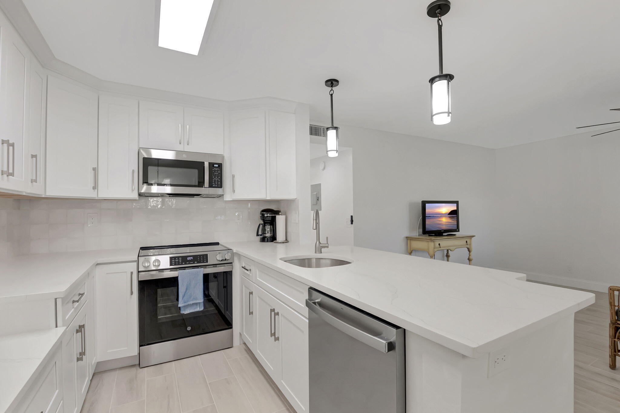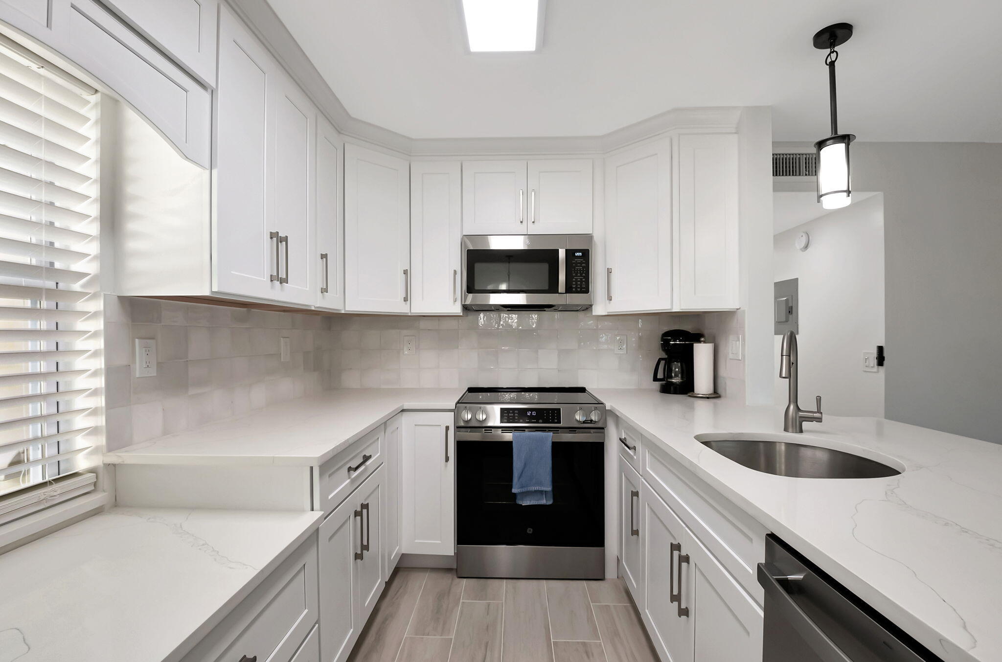 Step into luxury with this completely renovated 2-bed, 2-bath condo at 493 Flanders K, nestled in the vibrant 55+ community of Kings Point Golf and Country Club. RENT RIGHT AWAY NO WAIT! Every inch of this home has been thoughtfully upgraded with top-tier finishes, ensuring a seamless blend of elegance and functionality. This condo features all-new essentials, including a brand-new A/C system, hot water tank, and upgraded electric panel for worry-free living. The stunning open-concept kitchen is a chef's dream, boasting quartz countertops, top-of-the-line stainless steel appliances, a tiled backsplash, and ample natural light. A breakfast bar invites you to pull up a stool and enjoy your morning coffee in style. Freshly painted with smooth ceilings and designer wood-look porcelain tileflooring throughout, the home exudes a modern yet inviting atmosphere. All New Impact Doors and Windows! All-new recessed lighting, fixtures, switches, outlets, and sleek interior doors complete the updated look. All new sheetrock. The bathrooms have been transformed into spa-like retreats, featuring LED mirrors, contemporary vanities, new toilets, and fully tiled showers. Step outside to your private garden-view patio, perfect for relaxing or entertaining. This outdoor space also includes a convenient full-size laundry and utility closet. Located in the highly sought-after Kings Point community, residents enjoy access to world-class amenities, including golf courses, multiple pools, tennis courts, and a vibrant clubhouse with social events and activities. Don't miss this stunning property it's a true gem! Schedule your private showing today and experience the best in 55+ living.