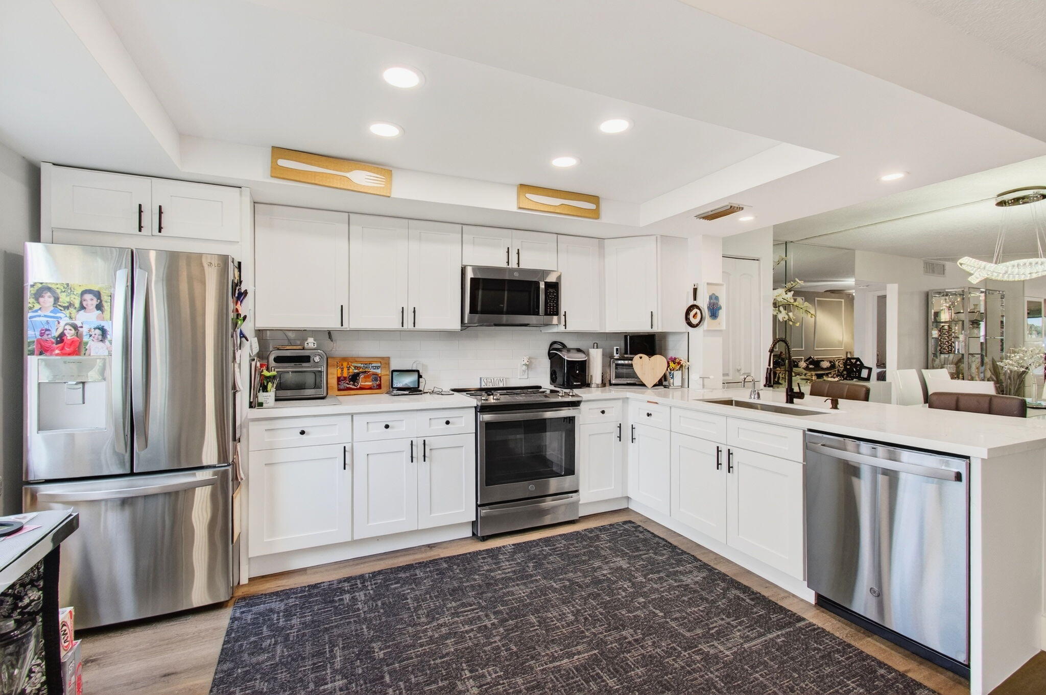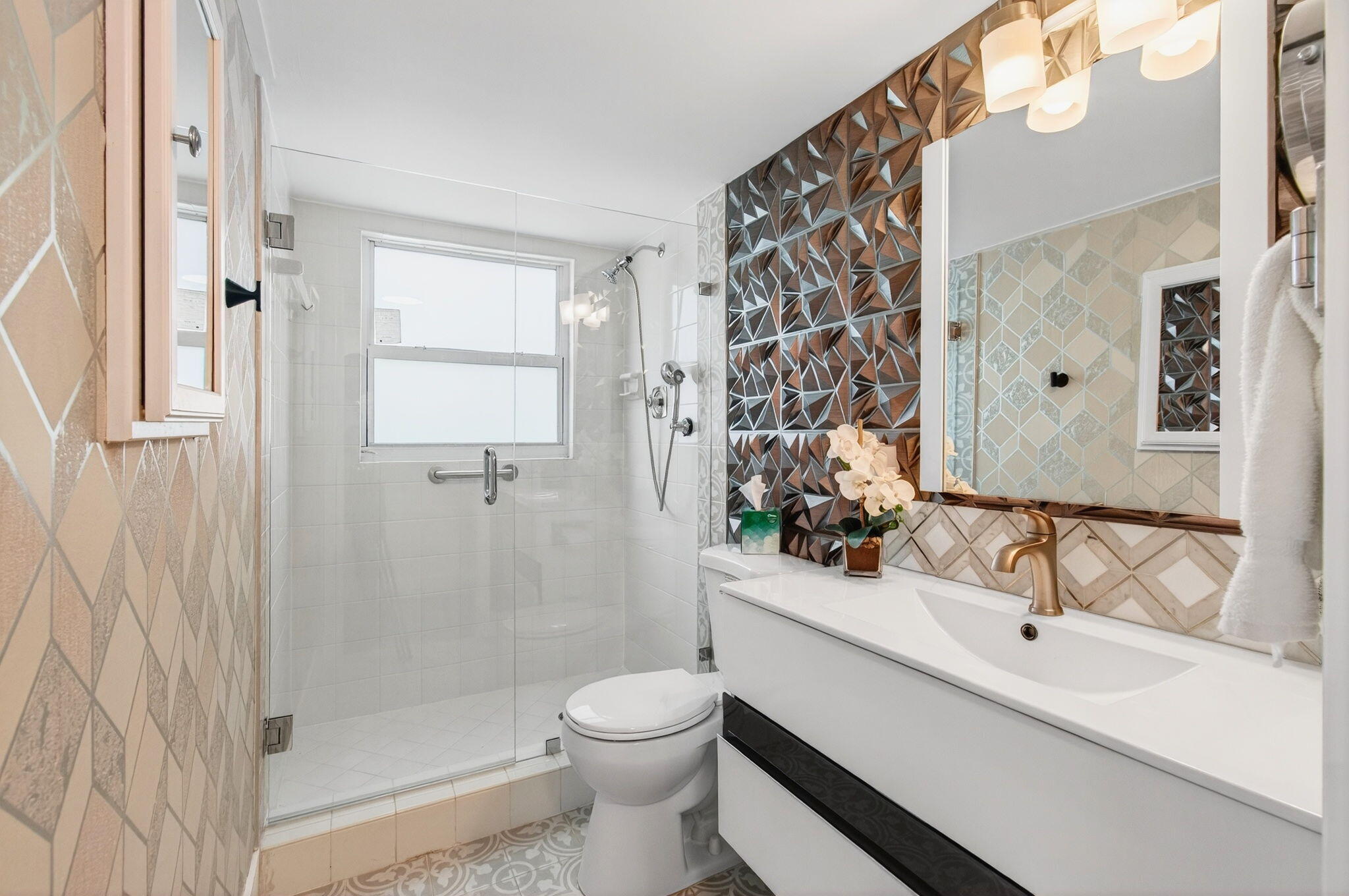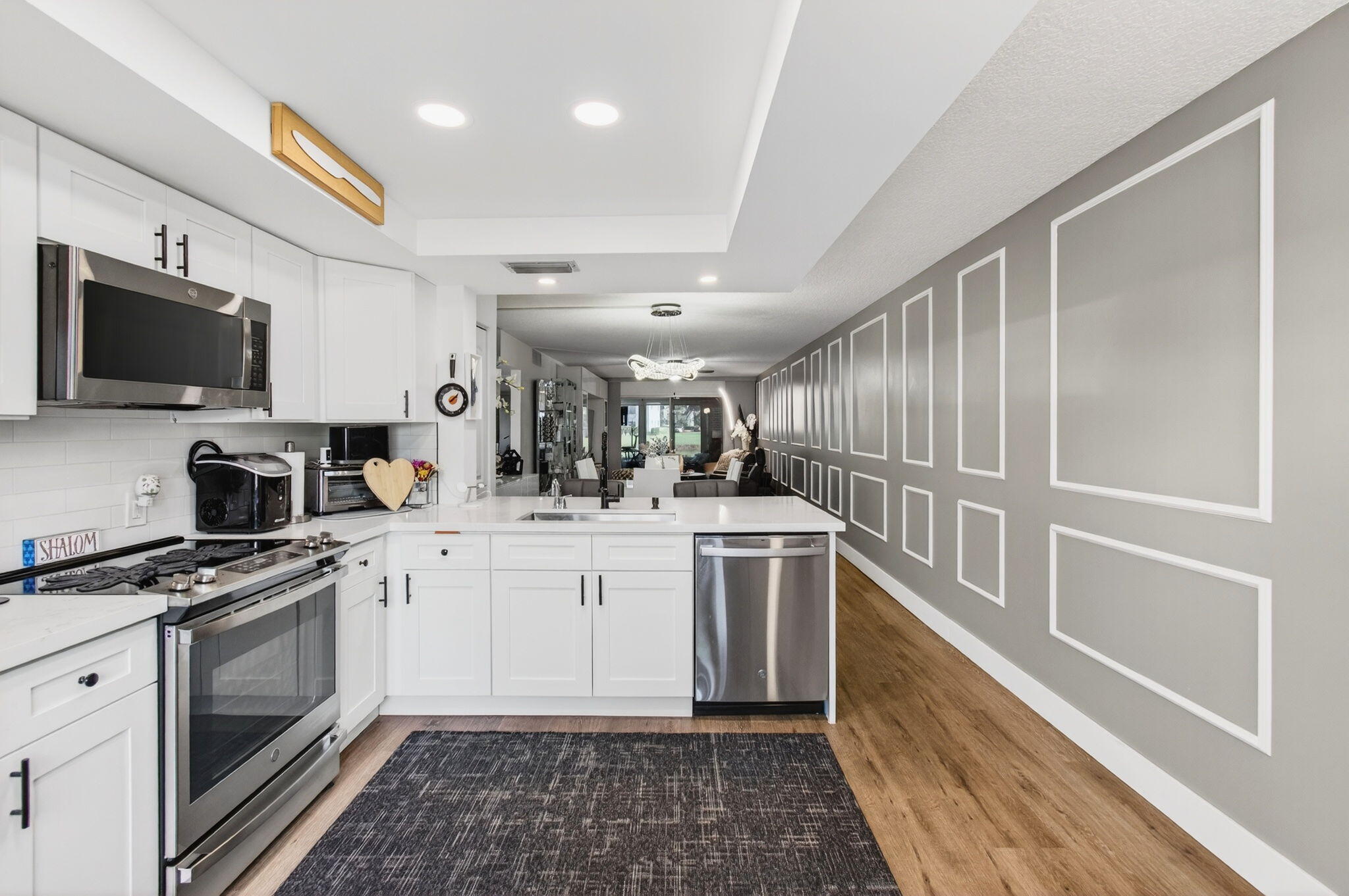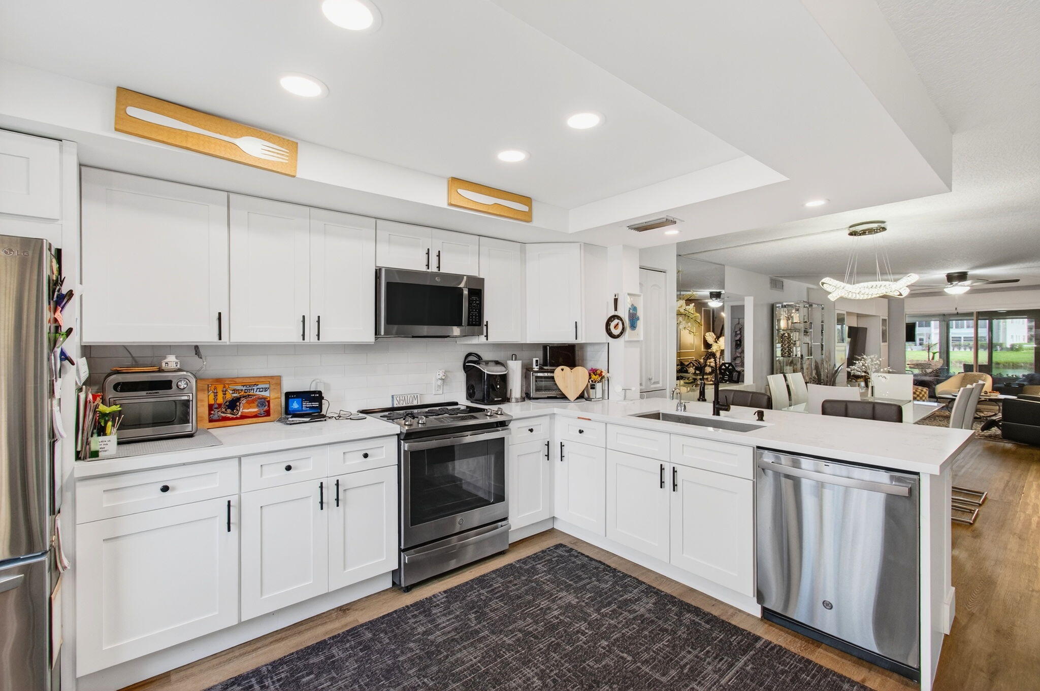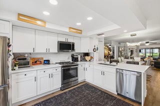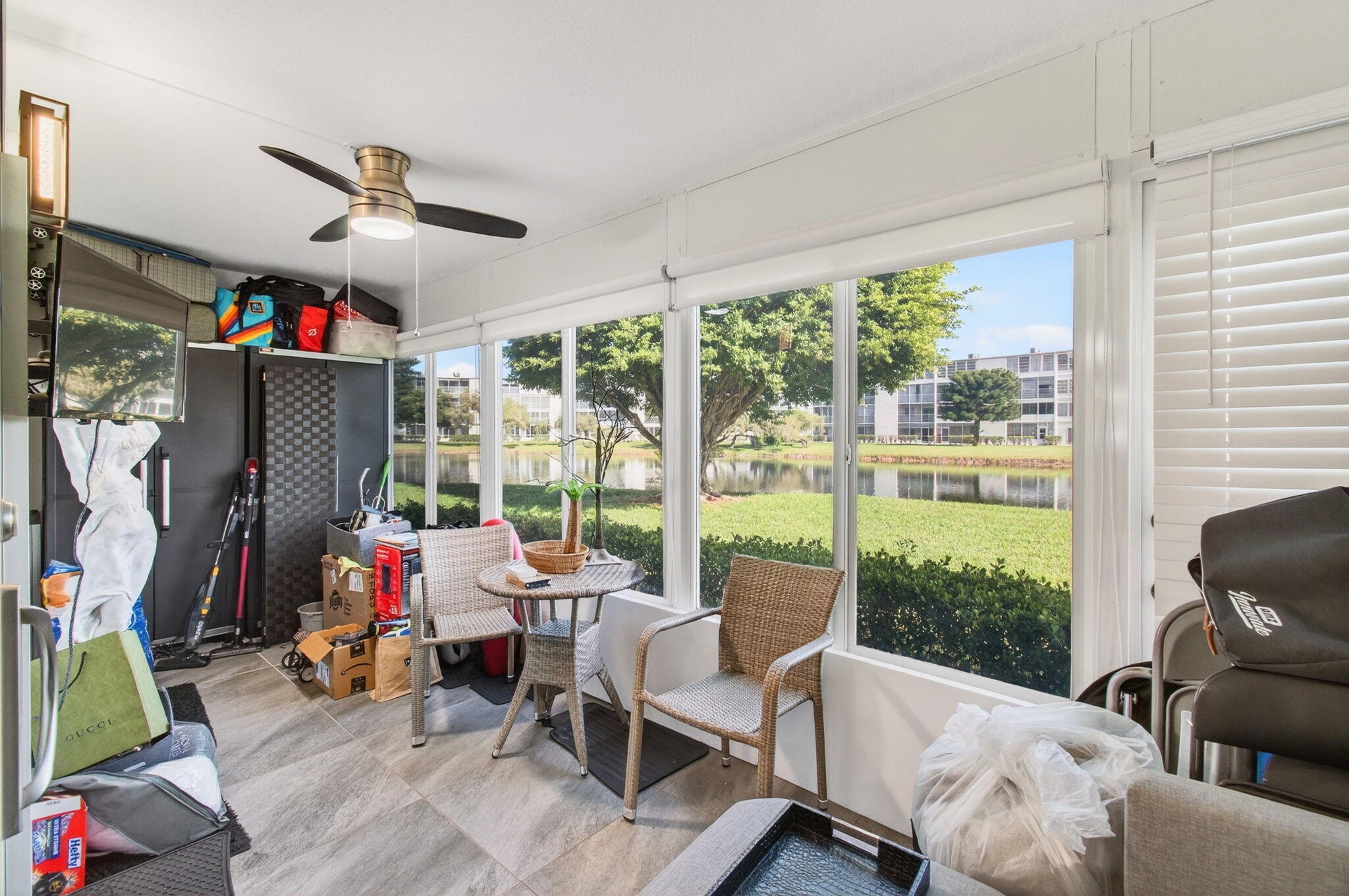 CENTURY VILLAGE, BOCA RATON--SUPER ACTIVE ADULT COMMUNITY.This stunning, fully renovated corner ground-floor condo captivates with its smooth ceilings and luxury vinyl flooring throughout. Key features include a knockdown ceiling, an updated electrical panel, and newer air conditioning and hot-water-heater systems. With impact windows, the condo ensures both safety and energy efficiency. The open-concept kitchen is a chef's dream, showcasing quartz countertops, soft-close kitchen cabinets, a beautiful farmhouse sink, stainless steel appliances, and a tray ceiling with recessed lighting. Convenient features like instant hot water and a water filtration system enhance the experience, along with ample storage space and an additional pantry.The master bedroom is bright and inviting, featuring a large window and a walk-in closet with built-in organizers. Enjoy private access to the patio through an impact-rated sliding door. The en-suite bathroom is a sanctuary, complete with a window, a gorgeous step-down shower with frameless doors, a high toilet, beautiful quartz double countertop vanities, a custom-made linen/medicine closet. Bedroom 2 is bright and spacious with two windows and a built-in closet. The guest bathroom impresses with a step-down shower, a frameless shower door, and an oversized vanity, while both bathrooms feature high toilets and pocket doors. There are two separate entrances to the patio: one from the living room and one from the master bedroom, with both sliders built to withstand the elements. The patio, featuring new plexiglass windows and a separate door leading to a breathtaking lake view, invites you to create cherished memories. It's an ideal space for family gatherings, joyful holidays, or simply savoring a hot cup of coffee or evening drinks. Centrally placed, Century Village sports an expansive repertoire of amenities. This locale has everything from a well-equipped fitness studio and an expansive clubhouse that facilitates community interaction to a performance theater that adds a sparkle of culture. For the active individual, there are dedicated courts for athletic pursuits such as tennis, pickleball, and bocce ball, spread across the community. With 12 courts for both tennis and pickleball, sports enthusiasts can feed their sporting spirit. Please don't miss out on this opportunity. The current owner is highly motivated to sell. With an engaging confluence of comfortable living and active communal spirit, this property presents an enticing prospect for any lifestyle. CENTURY VILLAGE, BOCA RATON COMMUNITY, HAS TWO SEPARATE MONTHLY HOA FEES. NO EXCEPTIONS! MONTHLY Guildford Section HOA $589.39 MONTHLY Cen-West HOA $312.57=$906.96 TOTAL HOA Internet, basic cable, and water are included in the HOA. A/C-2023 HWH-2023 UPDATED ELECTRICAL PANEL.