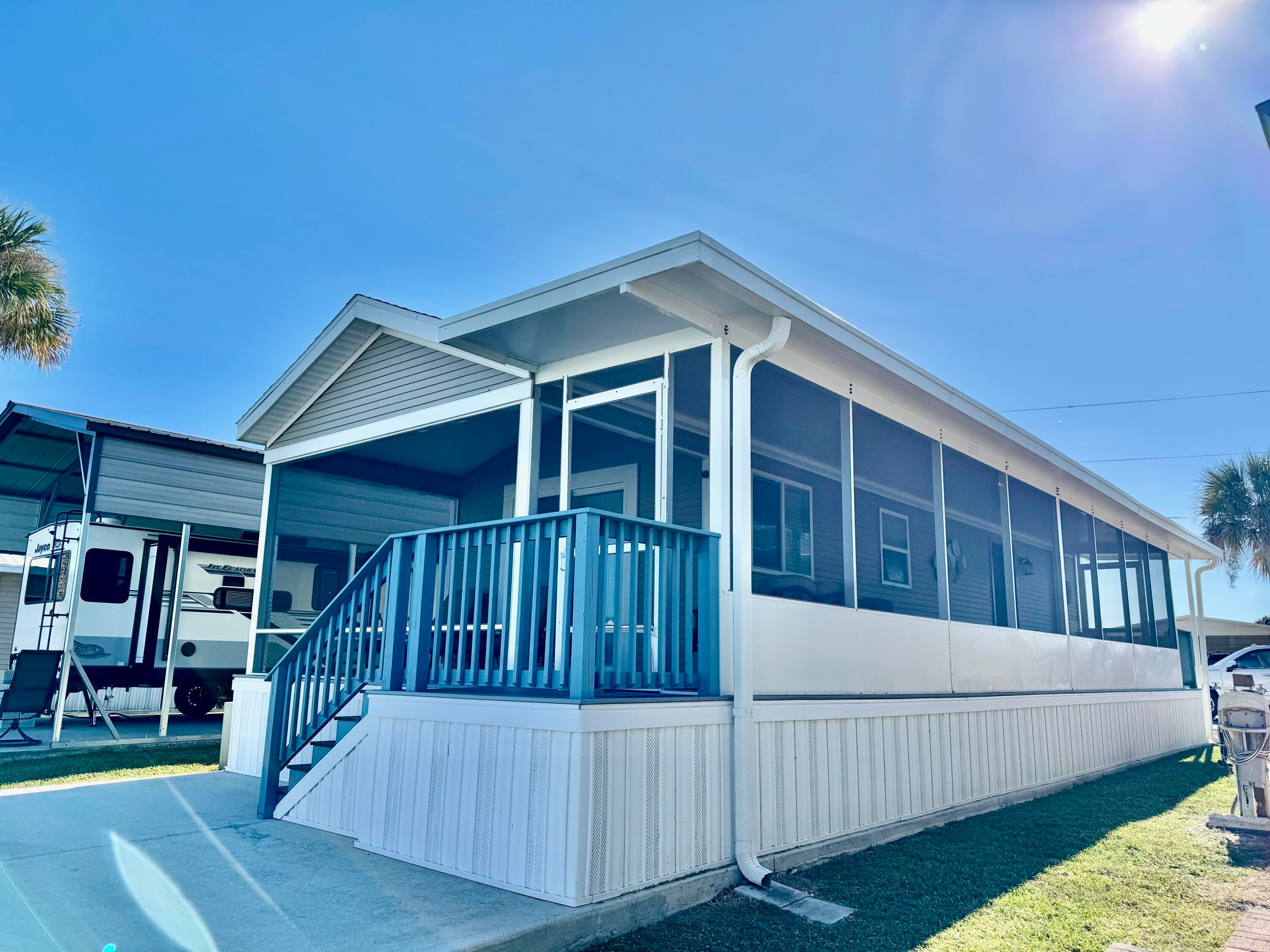 TURTLE COVE~ A RARE FIND! For the ONE who ONLY WANTS THE BEST! Lake ''O'' Access. Exceptional 2018 PALM HARBOR Park Model. 20x25 Garage/workshop w/ 20x24 Double carport. 1 Bd/1 Ba. 942 TLA with screened porches. Beautiful in every detail, furniture included. Open concept, LVP flooring, stacking W/D. Full shower. Lots of storage. Queen hideabed in the living room with a chaise lounge. Table for four. Bimini Hurricane shutters. Open the double door on the water side and enjoy the beautiful breeze throughout the home. Full length screened porch and lovely back porch. Open patio at seawall. All concrete board decking and steps. Concrete Seawall. Built at 150 Mph Wind Load capacity. Top Quality! MOVE IN THIS SEASON!Dimensions are approximate, must measure for exact