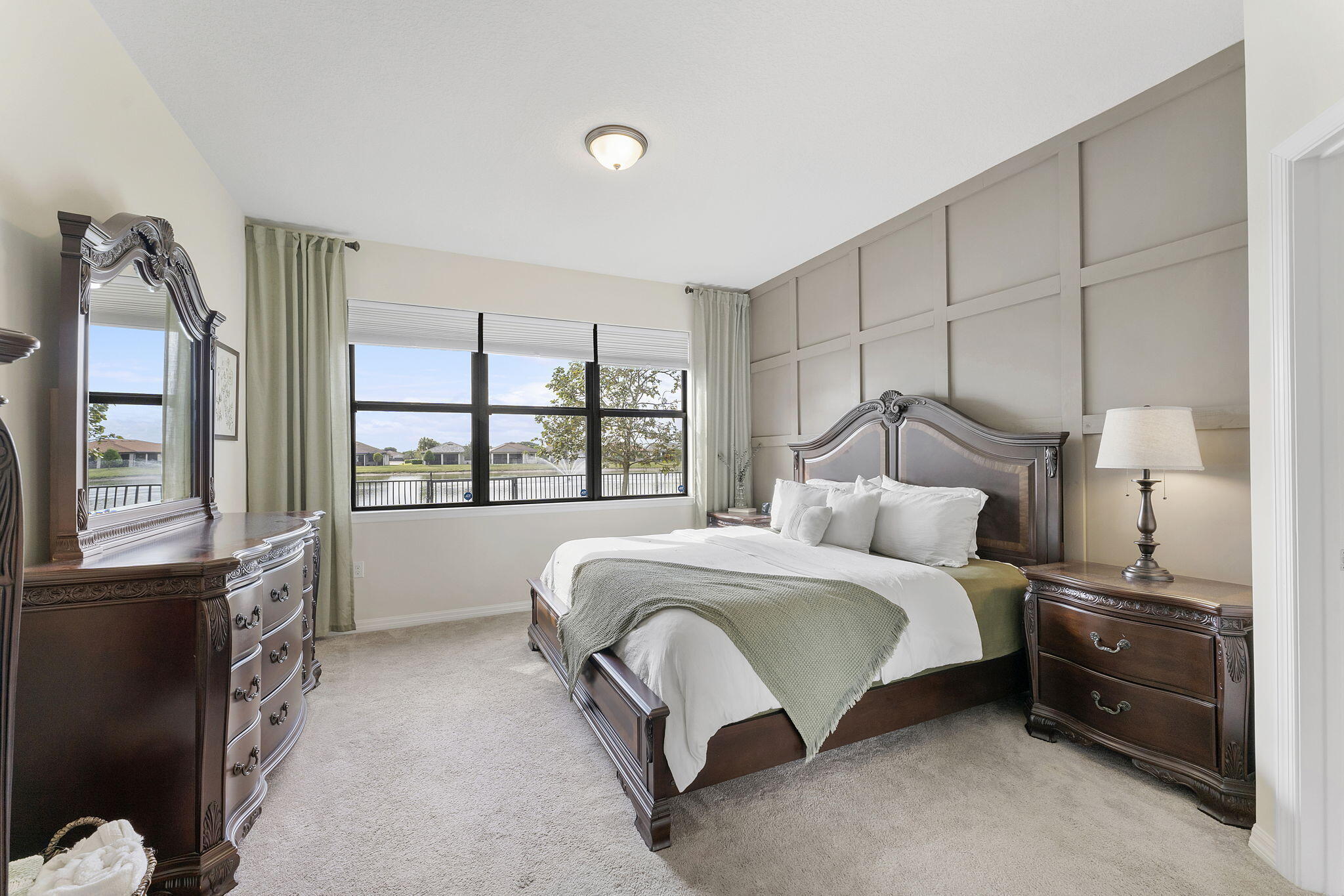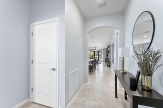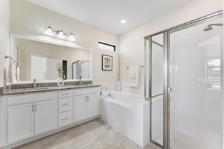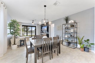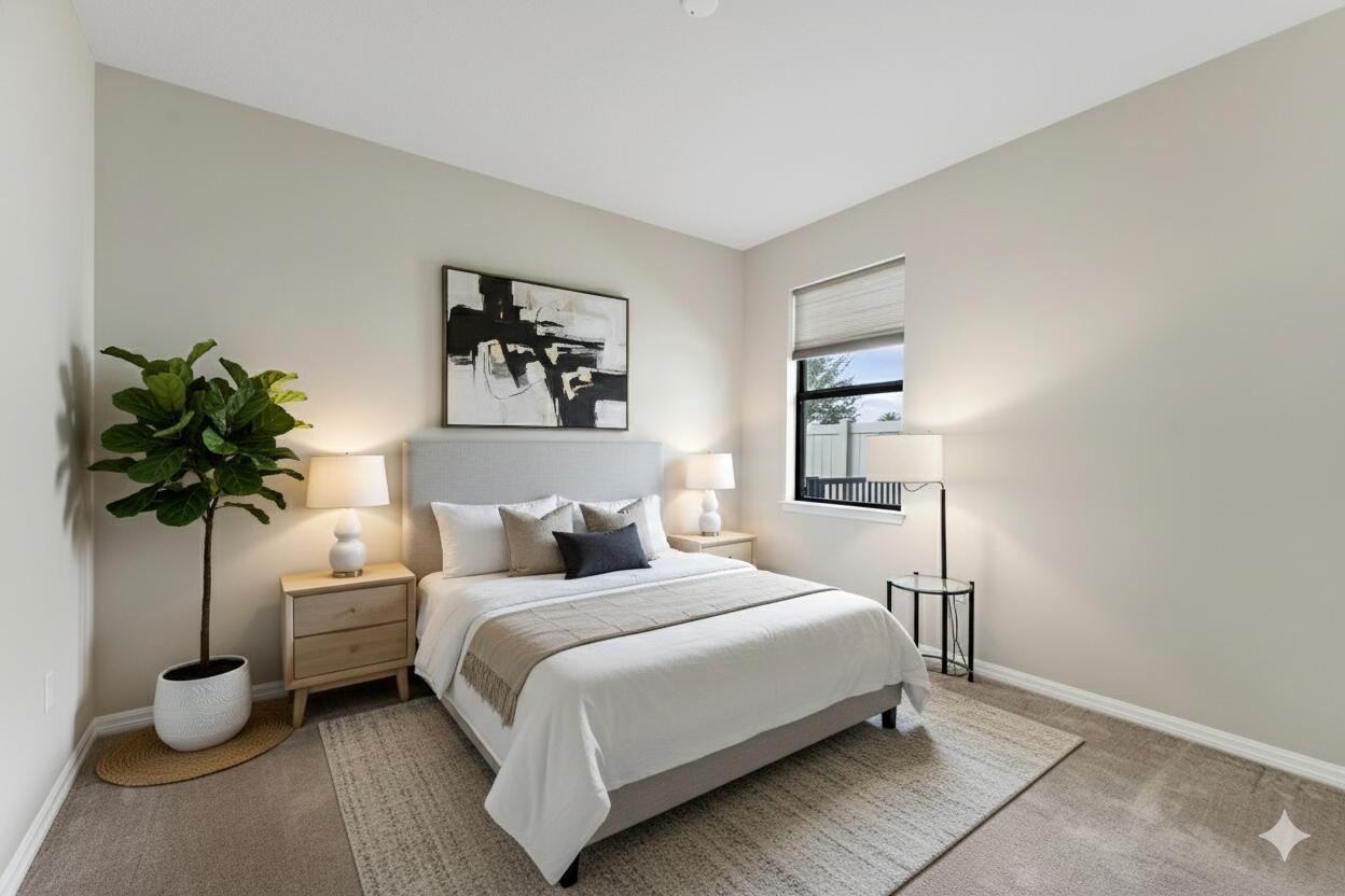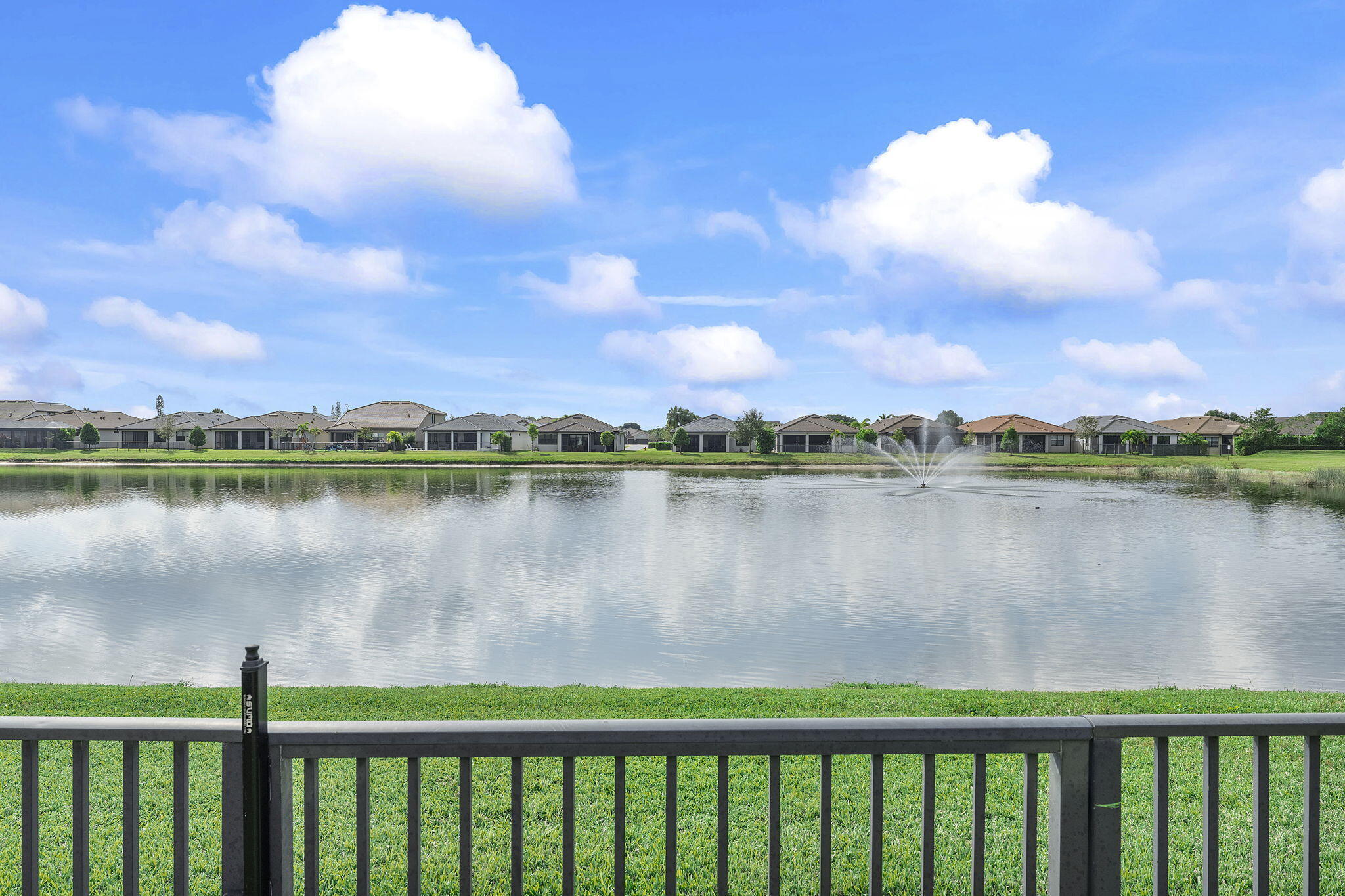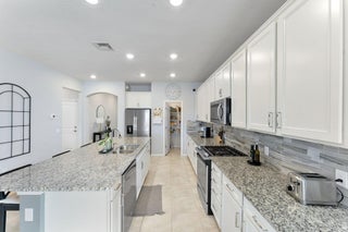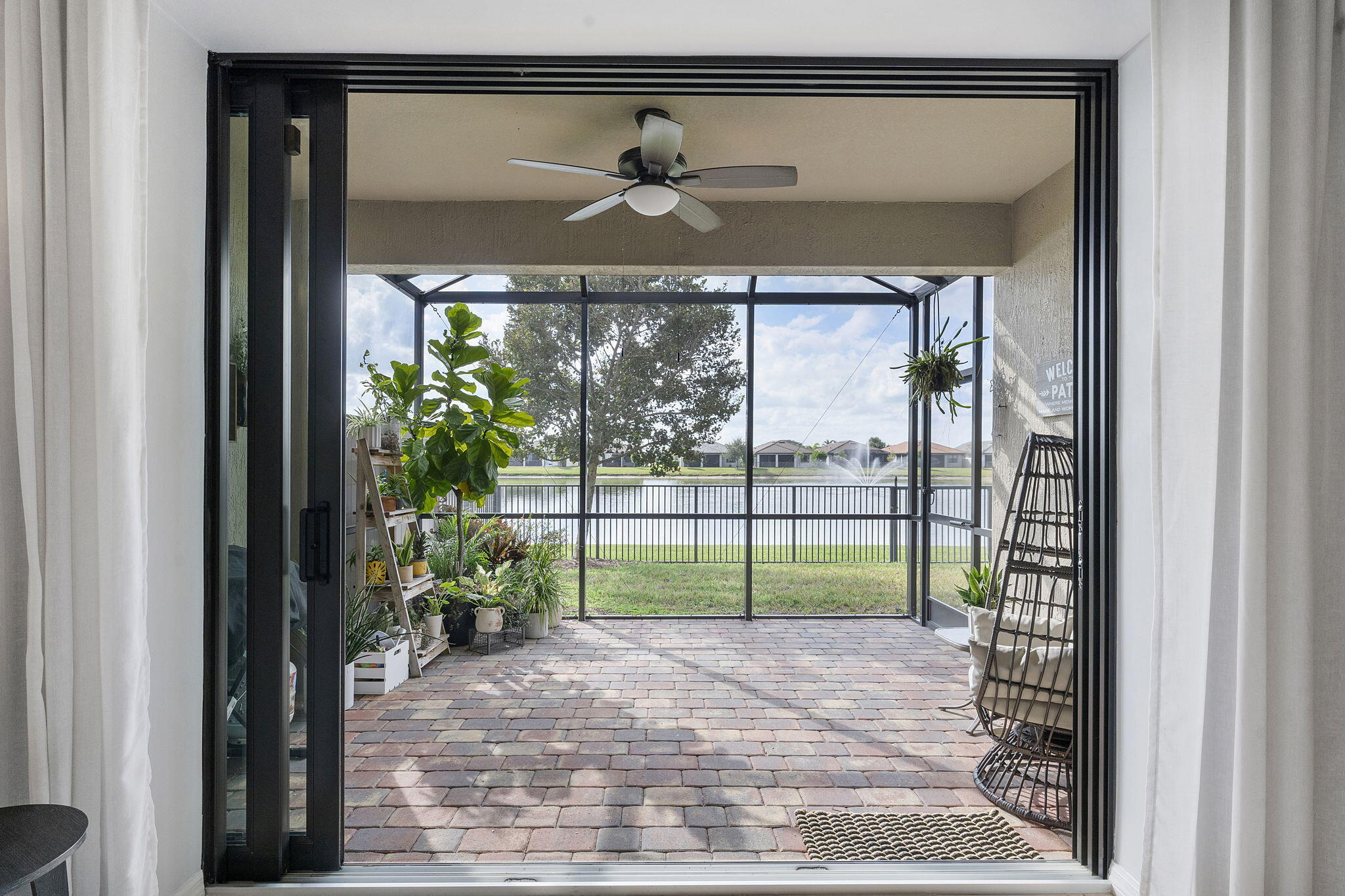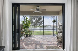 Beautifully upgraded 4-bedroom, 2-bath, 2 car garage home featuring bright finishes and one of the best indoor-outdoor living setups in the community. The upgraded disappearing slider fully opens the living room to the screened-in brick-paver patio, creating a seamless flow to peaceful lake views and nightly sunsets. The open kitchen stands out with granite countertops, white cabinetry, stainless steel appliances including a gas range, and a stylish tile backsplash. The spacious primary suite overlooks the water and offers a large shower and a soaking tub, walk-in shower, and dual sinks. Additional upgrades include an extended garage for extra storage or larger vehicles, neutral tile flooring throughout the main areas, modern feature walls, and a welcoming foyer.